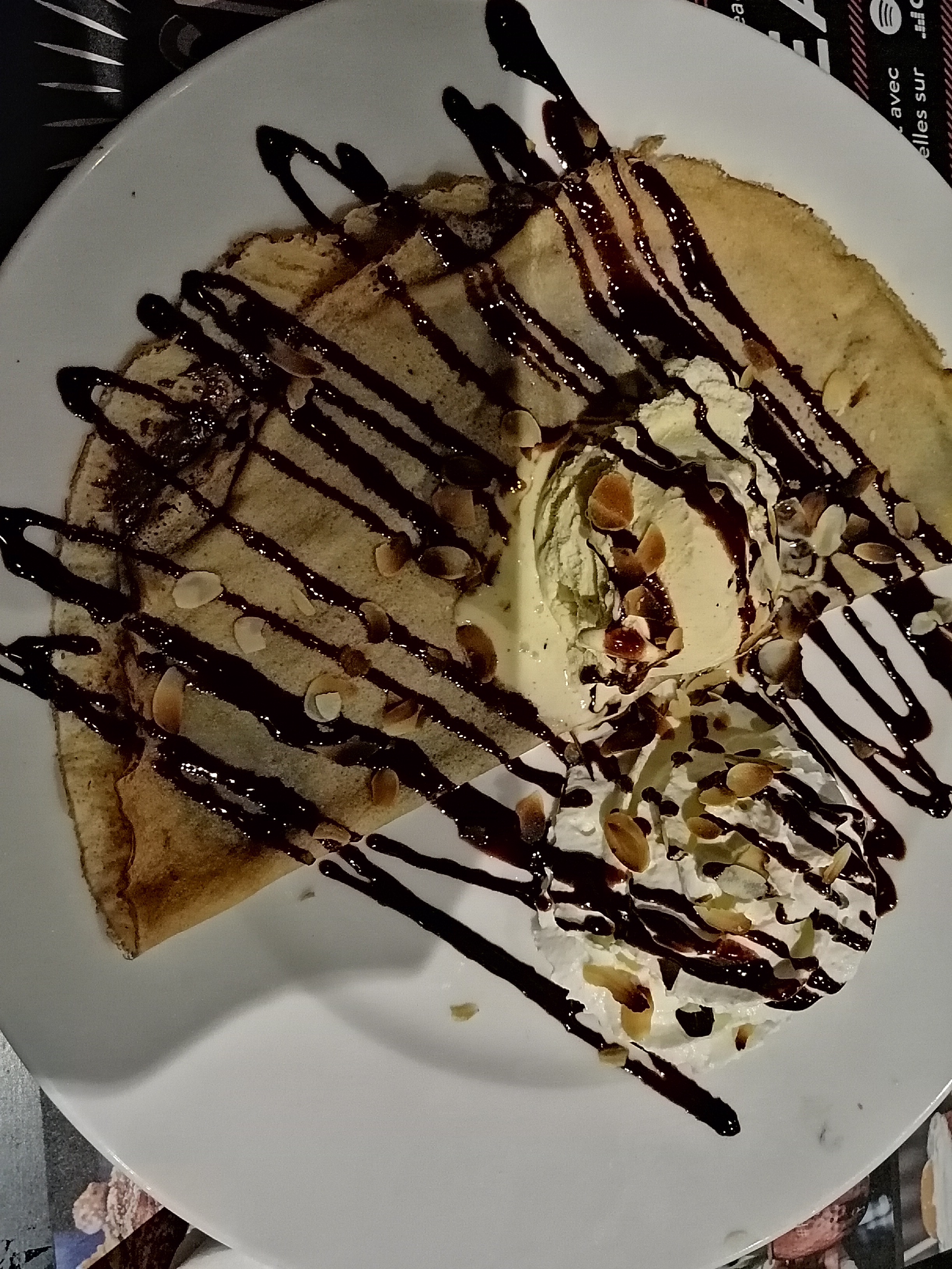 Dommage , il y avais pas grand monde hier midi , et un service relativement long. Pas de verif de pass sanitaire à notre table , alors que celle d'à côté oui. Un Monaco tiède. Une belle salade et un steak à cheval très bon, la cuisson était respectée. 4e la crêpe saupoudrée de sucre glace ( et pas de sucre dedans ) ça fait clairement mal au fessier .. Un serveur correct et poli (Corentin). Bien dans l'ensemble
