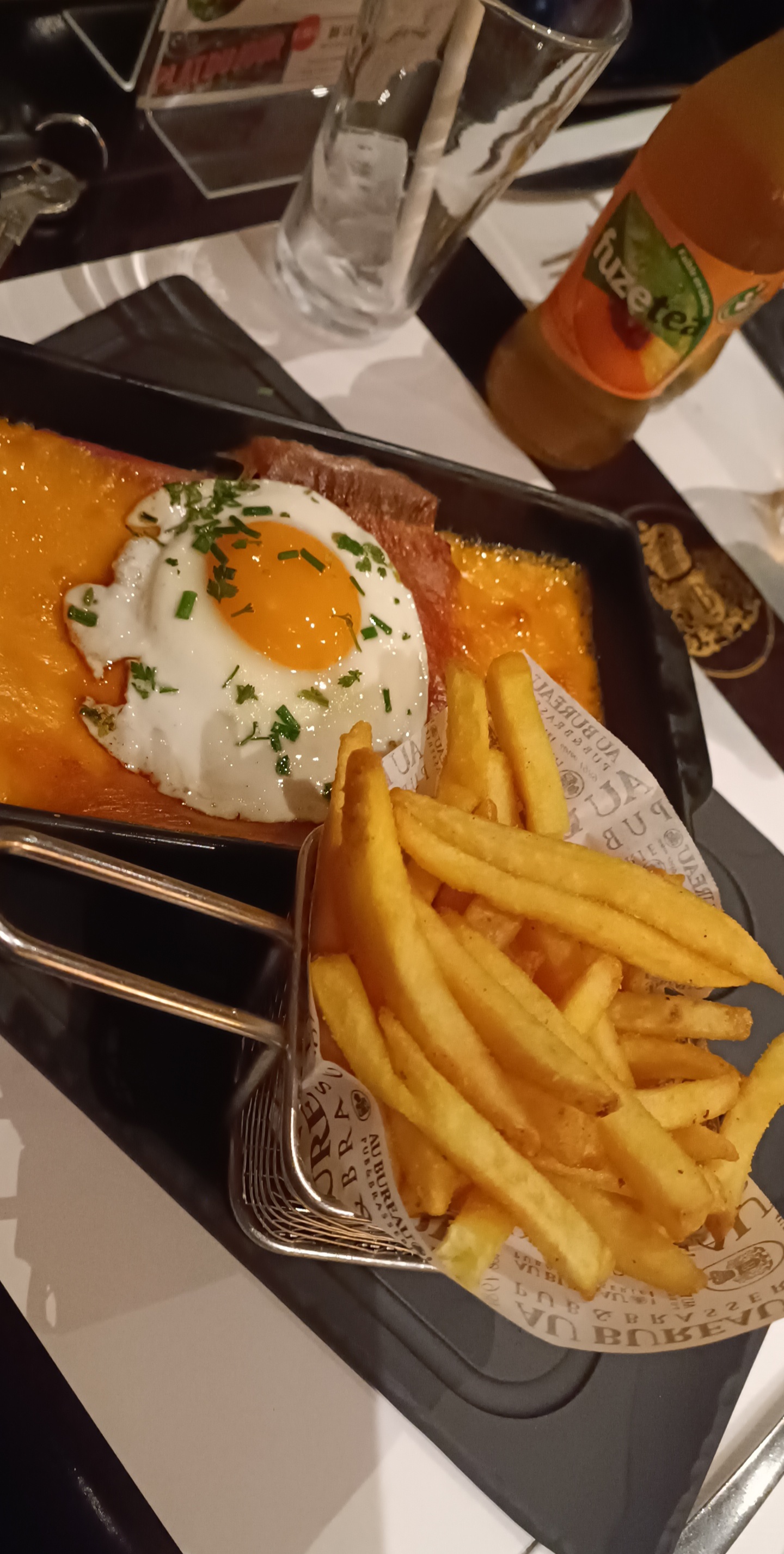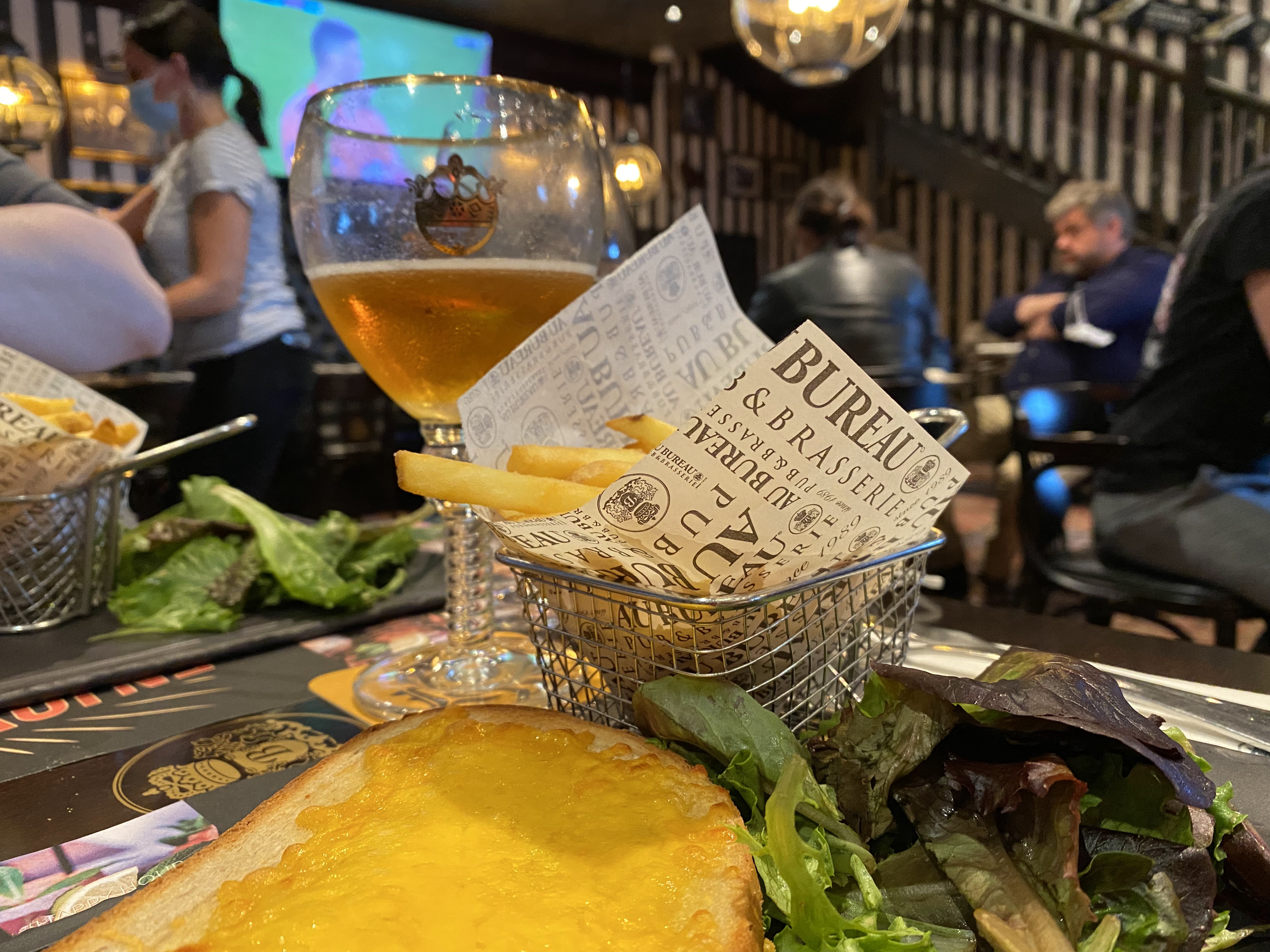 Direction Lievin pour un en séance ciné et comme par cas pratique, nous décidons de dîner au Bureau juste à côté du cinéma Pathé. Personnellement, je savais à quoi m’attendre, pour avoir déjà déjeuner à celui de Reims. Une chaîne de restaurant , à l’habillage délicieusement British, un peu sombre comme dans certains pubs, une carte brasserie classique un peu chère, une cuisine juste bonne. Sans plus. Sauf que je ne m’attendais pas à une telle déconvenue à l’arrivée de mon plat à 14,90€. Le croque monsieur du pub annonçait un met gourmand , avec une béchamel au cheddar, du jambon, des champignons , du pain de campagne , du cheddar encore ! Je voyais arriver un croque épais et débordant de cette sauce au fromage. Quelle désillusion lorsque je vis arriver 2 maigres tranches de pain, sans béchamel (ou alors trop peu et absorbée mais vraiment sans aucun goût), une tranche de jambon d’épaule loin d’être de 1er choix et des champignons en boîte au goût de saumure. J’aurai du mettre une étoile , sauf que annonçant ma déception , la direction a décidé de me faire une remise de 5€ sur ma note. Bien , le cirque monsieur passe de 14,90€ à 9,90€ mais cela reste un poil cher (il en vaut pas 7€). La perte de point supplémentaires revient à la lenteur du service et une serveuse qui passait régulièrement devant nous et qui sentait fort la transpiration. En bref , le « Au Bureau » qu’il soit de Lievin ou d’ailleurs garde toutes ses promesses !