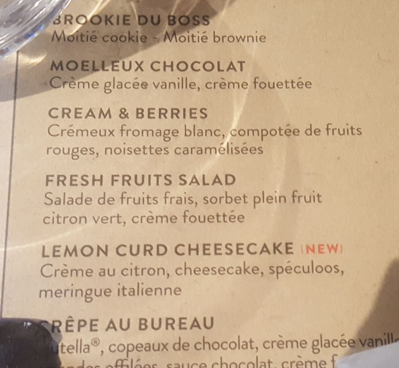 Comment vous résumer notre expérience: déplorable !! Repas entre copines, 2 spritz qui n'ont que l'appellation car goût d'eau!!!!! Où était donc l'aperol sûrement en option. Nous cherchons encore l'orange fraiche décrite sur la carte. 9.50€ c'est une honte!!!!, la coupe de champagne quant à elle, on va dire correcte.... Hamburger et summer tartine relativement corrects quant à la salade de chèvre (goat cheese salad) à fuir!!!! On cherche le chèvre chaud (une rondelle et un crotin), on mange 3/4 de croquant de salade qui représente l'essentiel du plat. Pas de toast, pas de miel, présentation zéro. Nous en faisant part à la responsable de caisse qui n'a aucunement pris en considération les remarques bien au contraire. Elle nous a indiqué, qu'en tant que chaîne ils respectaient leurs fiches recettes et donc pour avoir un vrai spritz ou salade de chèvre, se diriger vers de vrais restaurants et non des chaînes. Aucun geste commercial dans la mesure où elle estime ne pas avoir fauté. Un mot très positif pour la serveuse qui s'est occupé de nous et qui était très gentille. En un mot, restaurant à éviter (prix exorbitant pour la qualité déplorable)