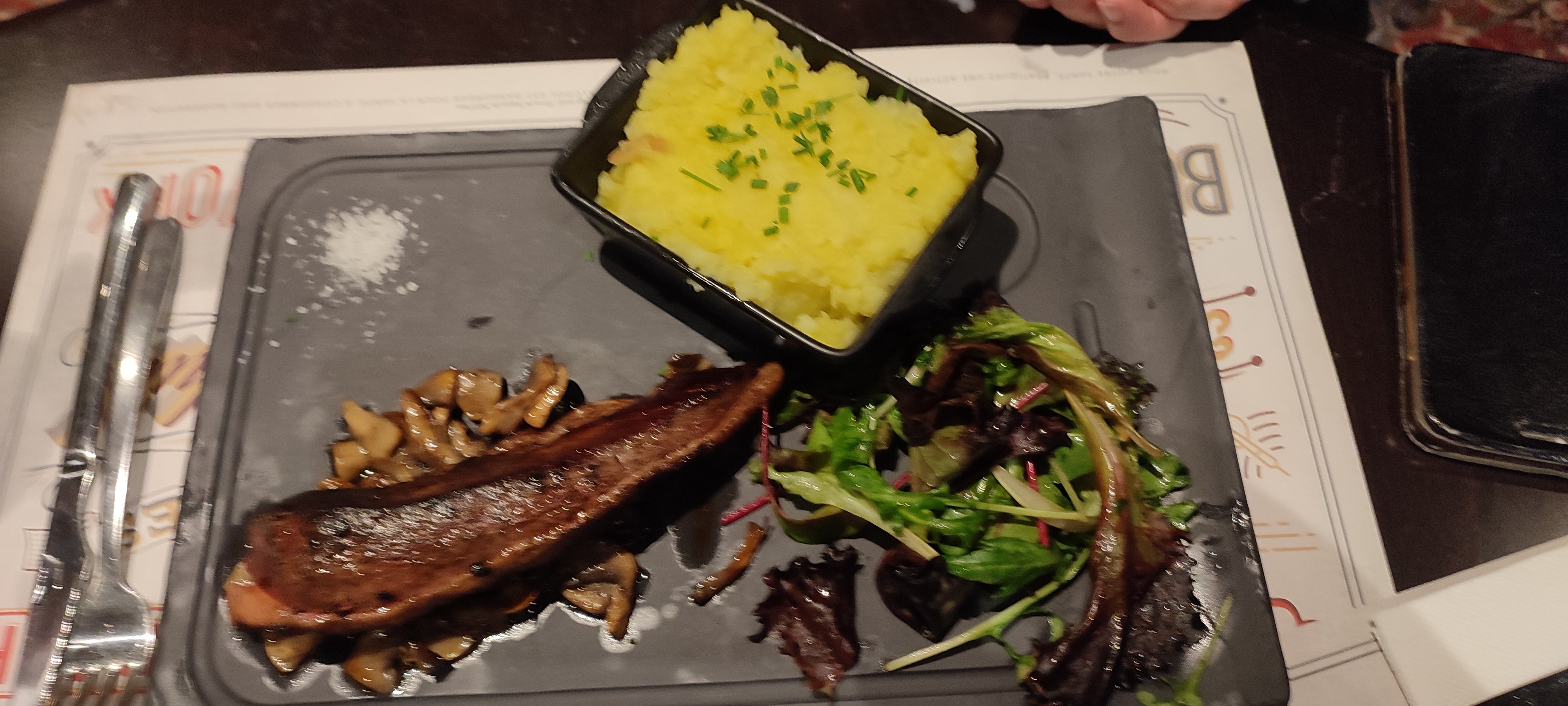 Accueil parfait et ça s'arrête là... Le manager qui croit bon de gueuler sur ses employés lors d'un debrief à 19h sans aucun respect pour ses clients présents. Le serveur qui propose une sauce pour accompagner le plat mais oublie de signaler qu'elle sera facturée. 1,50€ le ridicule ramequin de sauce au poivre c'est du vol caractérisé, l'inflation n'excuse pas tout... Mr le manager,pensez à respecter vos clients et vos employés.