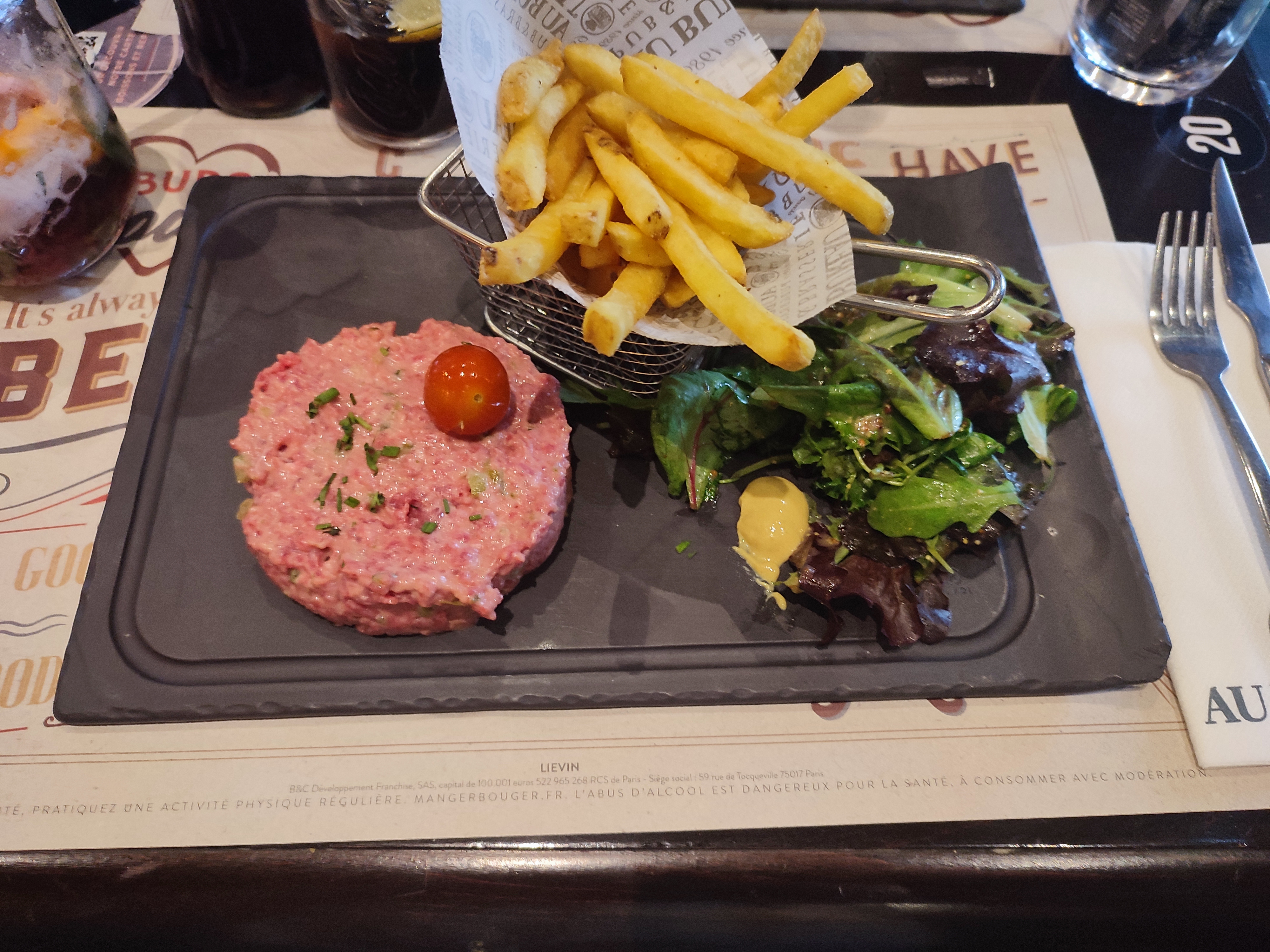 Le lieu est bruyant, je pouvais même pas entendre ce que mes proches disaient. La nourriture est assez bonne . J’ai pris un tartare mais il était malheureusement déjà préparé. Le service est rapide . Les serveurs et serveuses sont accueillant(e) . Mais leur plus gros défaut c’est que le lieu est bruyant avec la musique et pas très agréable. On se croirait en discothèque quand il y a des concerts .