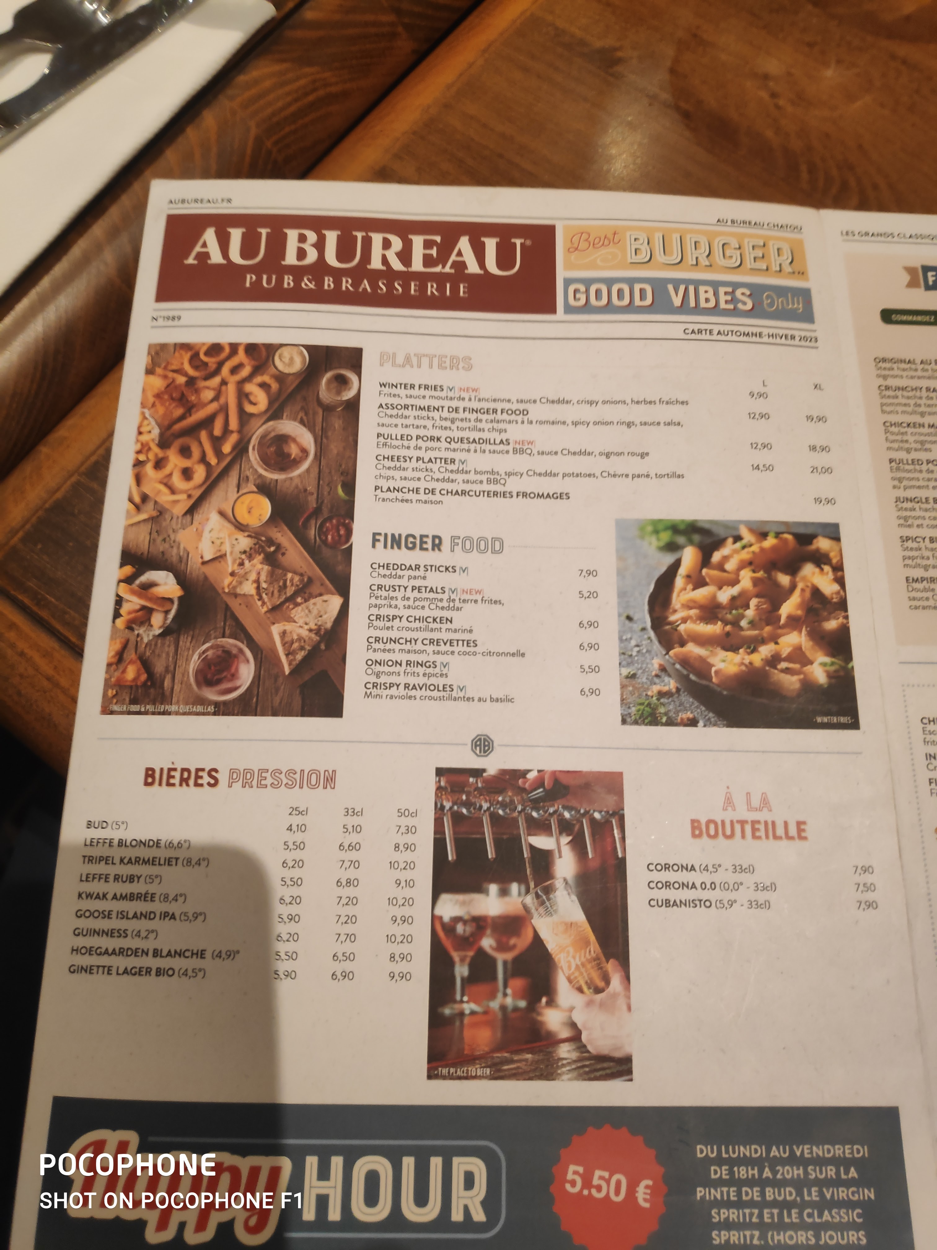 Commande passée à 17h59 par une serveuse oppressante et qui nous a pressé de commander. Le Happy Hour commençait à 18h. On est resté mangé, on était environ 6. Aucun geste commercial pour faire passer la première commande à 17h59 en Happy Hour.