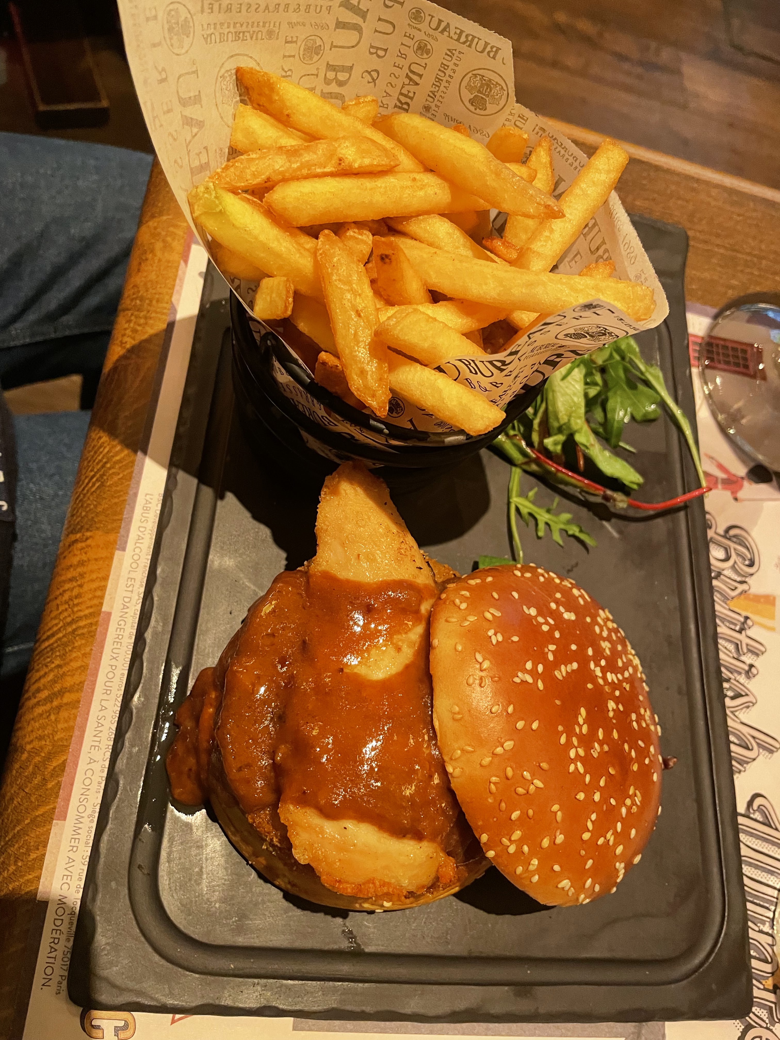 Burger pas mal. Le service peut être perfectionné avec un peu plus d'accueil et plus de professionalisme (le serveur décroche son téléphone...). Deuxième passage en décembre 2021 : Service très bien, nourriture bonne et décor toujours aussi sympathique.