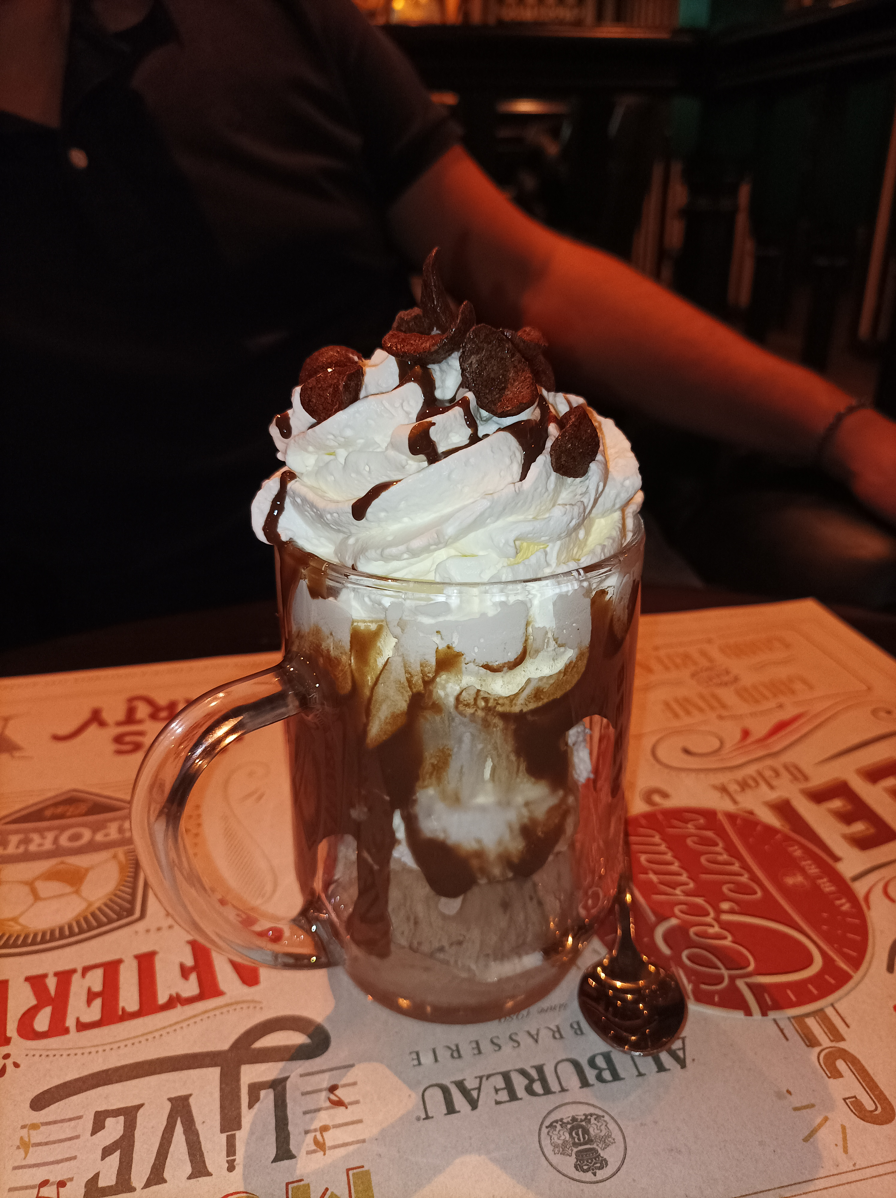 La Serveuse qui c'est occupé de nous était très agréable et sympathique. Niveau repas La planche du pub et le café gourmand super bon je recommande. La décoration est vraiment super. Prix un poil élevé à mon goût.