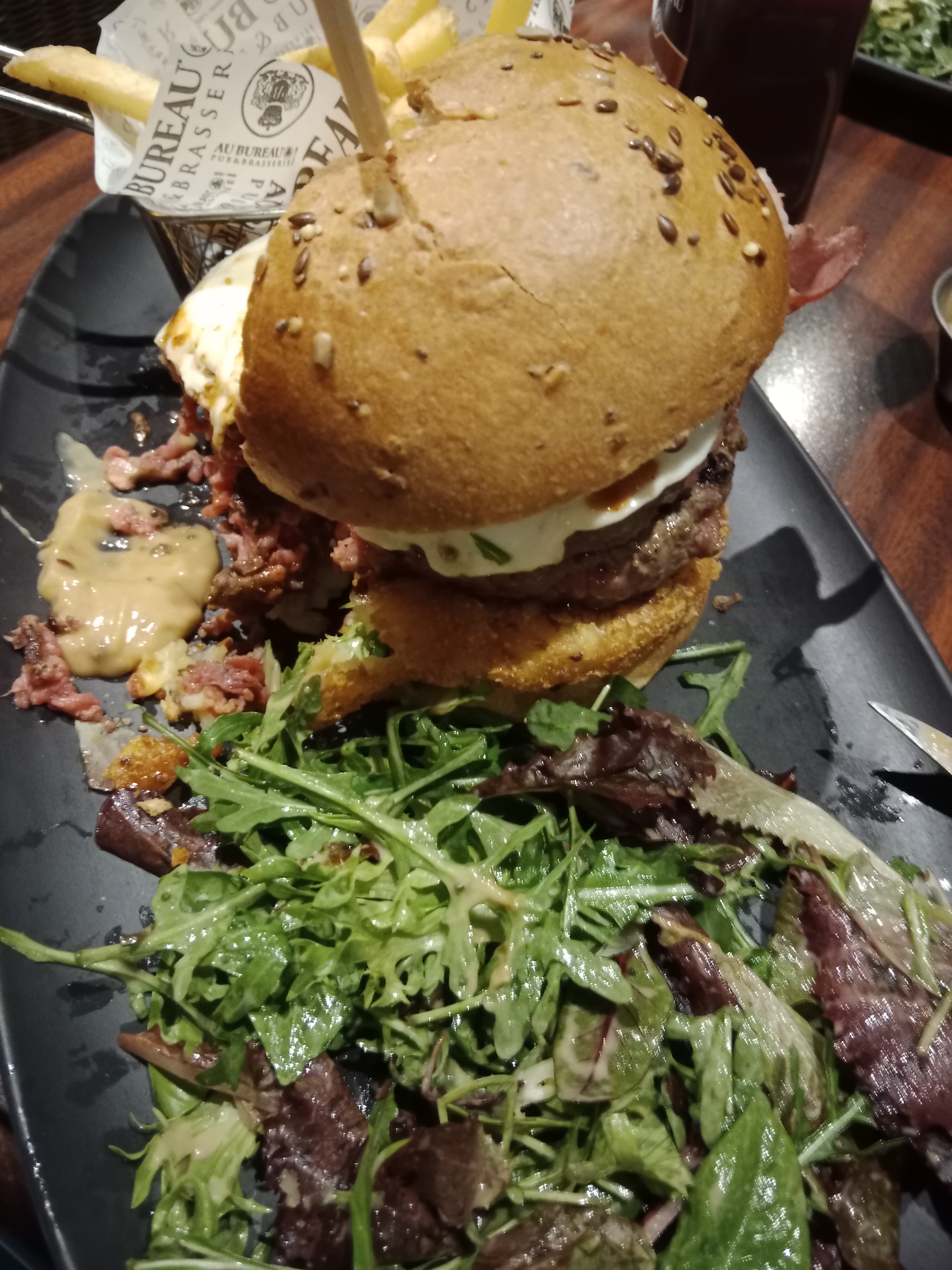 Nous avons été déçus du service…, car nous avons connus le bureau avec du personnel plus qualifié, honnêtement ne nous voilons pas la face la situation est critique, ces métiers souffrent du manque de personnels …, une table est partie au bout de 20 minutes d’attente, nous avons attendus nous ,10 min avant qu’un serveur (qui était le seul à tout gérer 😥) a nous proposer nos choix, comme nous avions une séance à 20h nous avons demander un service express enfin nous sommes arriver 18h45. Nous n’avons pas eu de pain, le steak tartare il fallait le chercher, les sauces c’est du supplément alors que d’autre enseigne c’est compris. Les plats sont bons mais sans plus, on dirait plus un restaurant gérer par des grippes sous. Il faudrait penser une bonne fois pour toutes à lâcher de l’argent, la radinerie ne mène à rien la preuve l’établissement se détériore ! Comment voulons nous rester attractif avec ce genre de comportement. Nous reviendrons avec plaisirs quand le gérant aura trouvé les bonnes solutions durables 😃