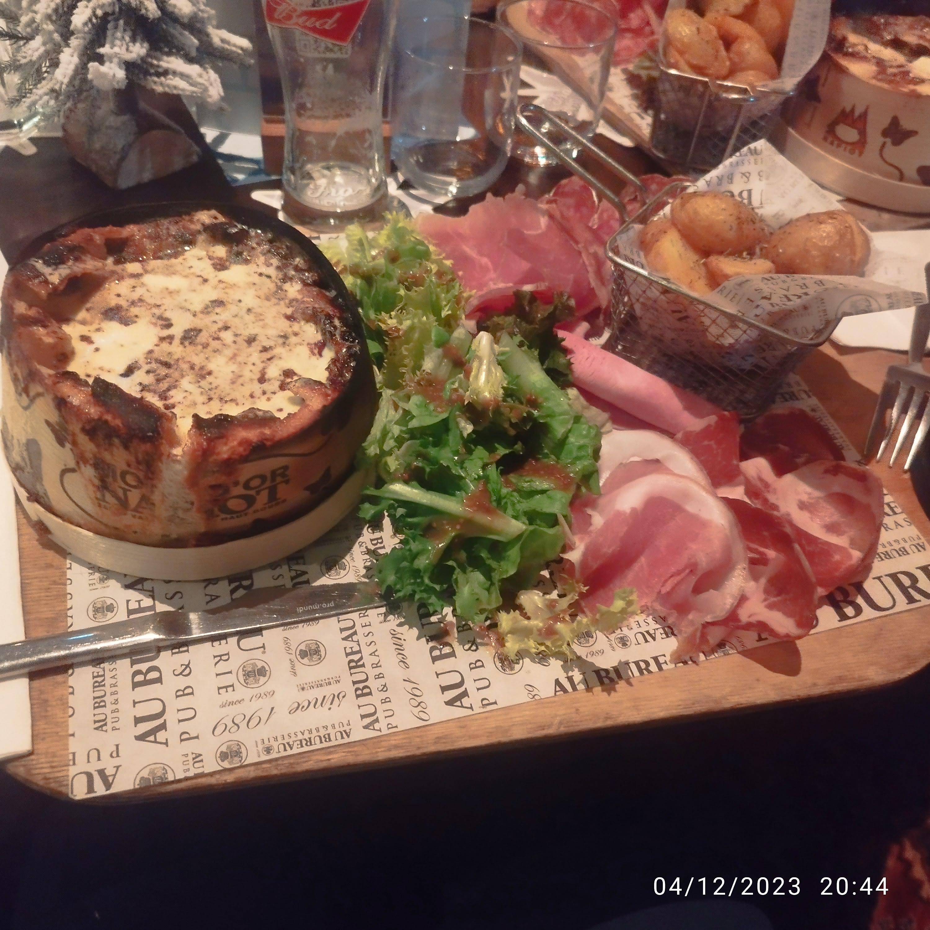 Mont d'Or de luxe ?? Nous sommes venues ce soir pour diner et nous sommes reparties extrêmement déçues. Arrivées à 19H30, servies après de longues dizaines de minutes... quand nous le faisons remarquer à la serveuse, elle nous répond cela ne fait que 15 minutes... alors qu'il est 20H15. Ceci n'est qu'un détail me direz-vous. On nous installe et on nous annonce nous avons comme suggestion une bavette d'aloyau ou un Mont d'Or pour Un ou à partager. [dans mon esprit c'est un plat pour 1 (petit Mont d'Or) ou un plat pour 2 à partager (Mont d'or Moyen)] .... A la commande, je demande un Mont d'Or pour 1 et mon amie un autre plat. ---aucune précision de prix ne nous a été donnée à l'oral ou sur un affichage quelconque--- En regardant sur le chevalet (QR CODE), je m'aperçois que le tarif de la note est de 44,90€ (oui oui quarante-quatre Euros et quatre-vingt-dix centimes). Je pense donc à une erreur et vais au comptoir où la personne qui encaisse me dit non, non, ce n'est pas une erreur, c'est le tarif, vous verrez vous en aurez trop à manger. Le plateau arrive (voir photo) : une boite de Mont d'Or taille moyenne , 12 tranches de charcuterie (type rosette et jambon blanc) et un peu de salade. Alors oui j'ai rapporté chez moi la moitié de la boite.... Mais de là à payer ce prix.... Et oui effectivement je ne connais pas TOUTES vos charges (réponse apportée par le monsieur) , et je suis désolée que vous ne rentriez presque pas dans vos frais avec ce plat mais comme vous faites aussi des économies sur le chauffage et sur l'eau des lavabos dans les toilettes (toilettes femmes/handicapés qui ne fonctionnent toujours pas ).... Je suis donc alléé payer et j'ai fait part de mon mécontentement, ce qui n'a a priori pas plu. Pour clôturer la soirée, heureusement que j'ai vérifié ma note, nous avons sur notre commande en plus un Irish Coffee et un Rhum (donc +20€). Je vous rassure, je ne reviendrai plus, vous n'aurez donc plus à faire affaire avec des clients de mon genre. (sic) Bonne soirée à vous. Rq : Je vous confirme que l'affichage écrit des tarifs est une obligation.... et qu'un simple La serveuse est dans l'obligation de vous le dire.... ne suffit pas. Une simple ardoise vous permettra de corriger cela.