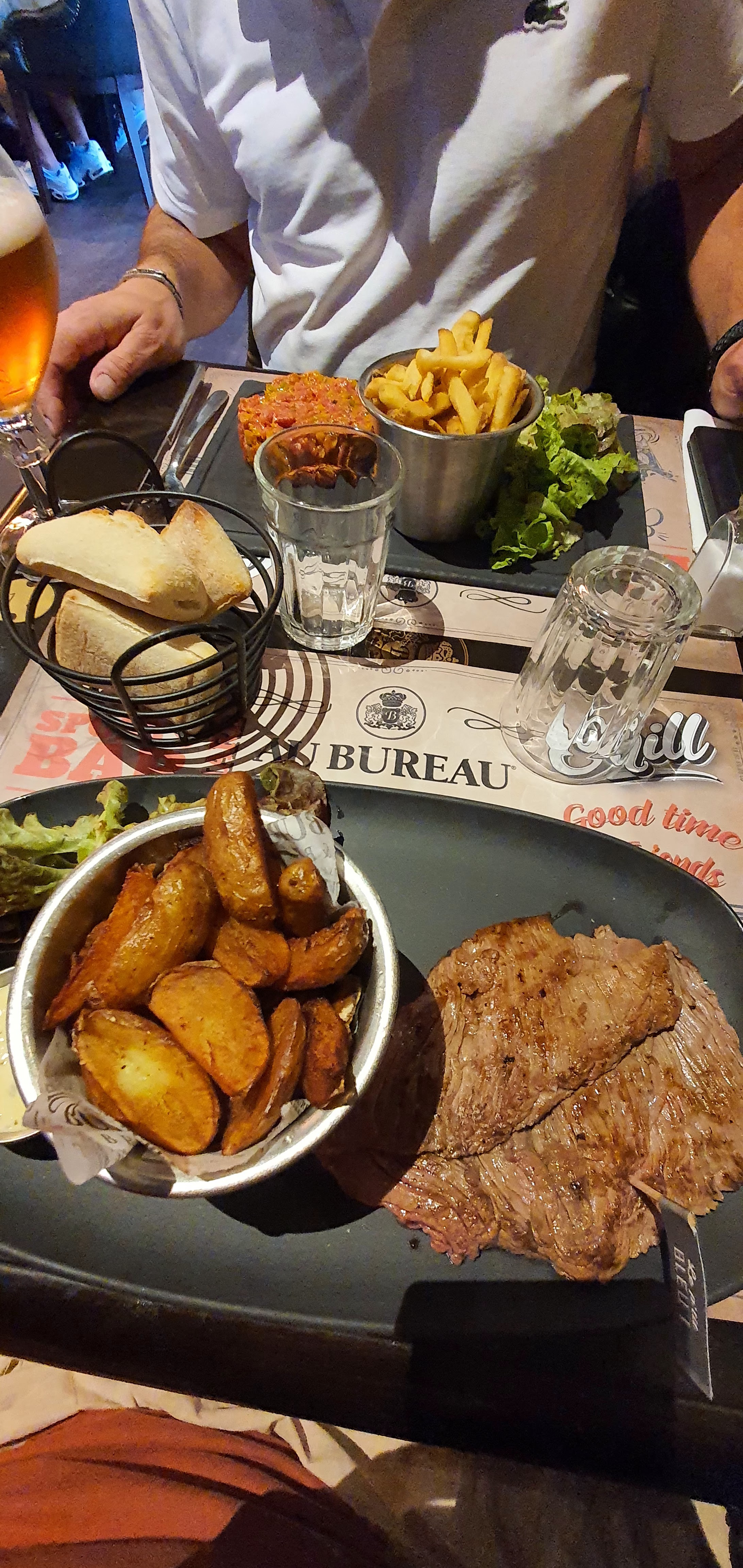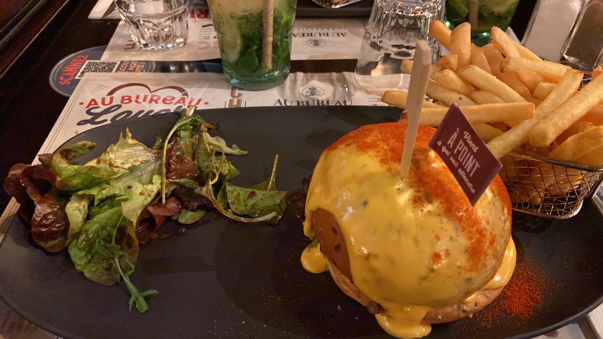 Très bon accueil, serveuse souriante, à l’écoute et serviable. Cocktails un peu plus décevant par rapport à d’autres Au Bureau. En entrée le plateau de Finger Food taille large est déjà bien consistant. Rien a redire. Le spicy burger est super bon et dégoulinant de sauce. la bavette est excellente par rapport à d’autres Au Bureau. Rien à redire sur les desserts. Le prix des plats et des desserts sont plus abordables que dans d’autres Au Bureau.