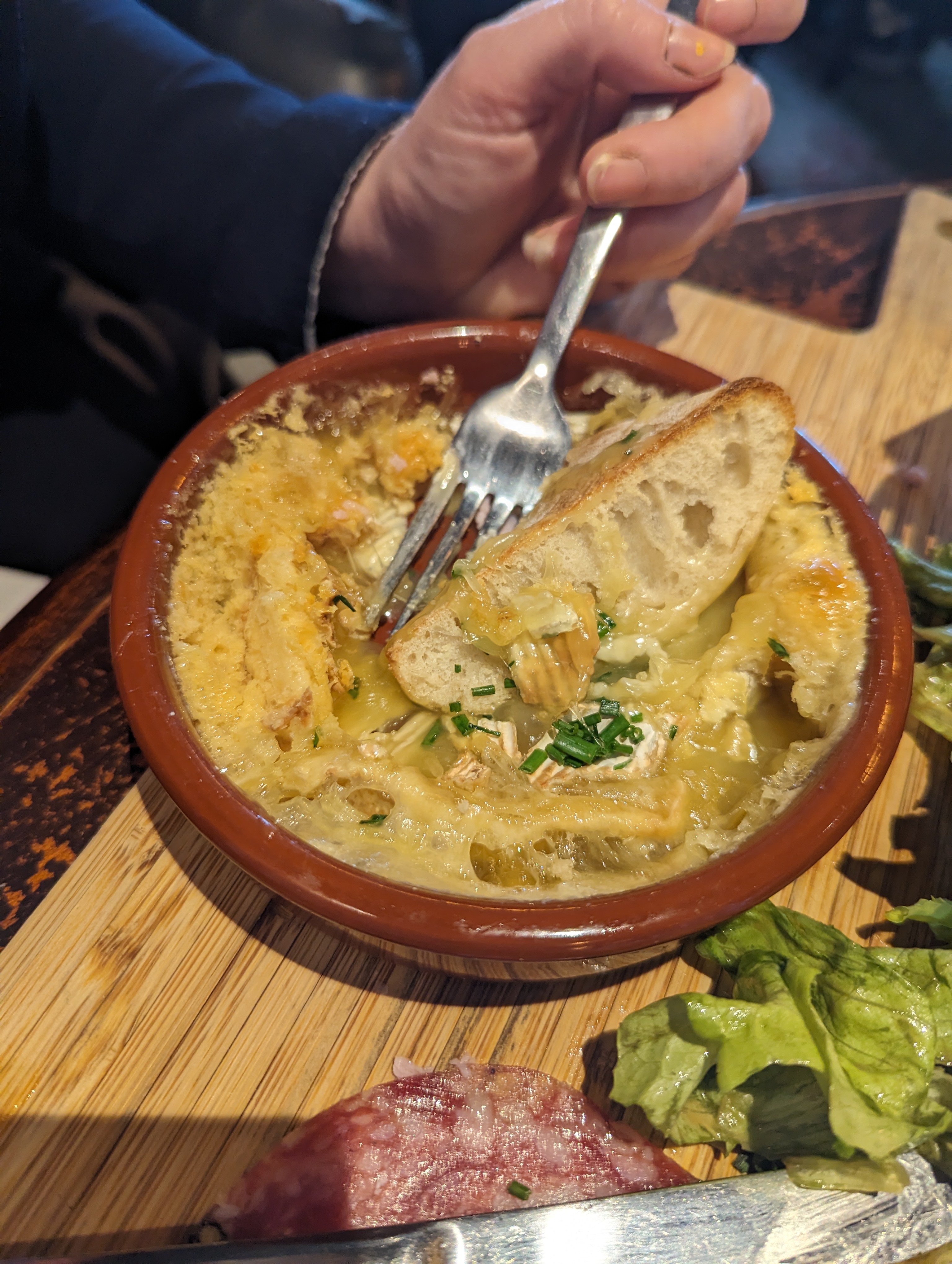 Commander un camembert rôti et un thon mariné Le camembert rôti servi dans un ramequin je pense que c'est un quart ou peut-être un demi camembert avec deux malheureuses tranche de jambon et 5 tranche de saucisson à mon avis c'est plus une entrée qu'un plat Et pour le plat de ma compagne le thon mariné qui n'a que le nom car la marinade était absente donc un plat sans saveur