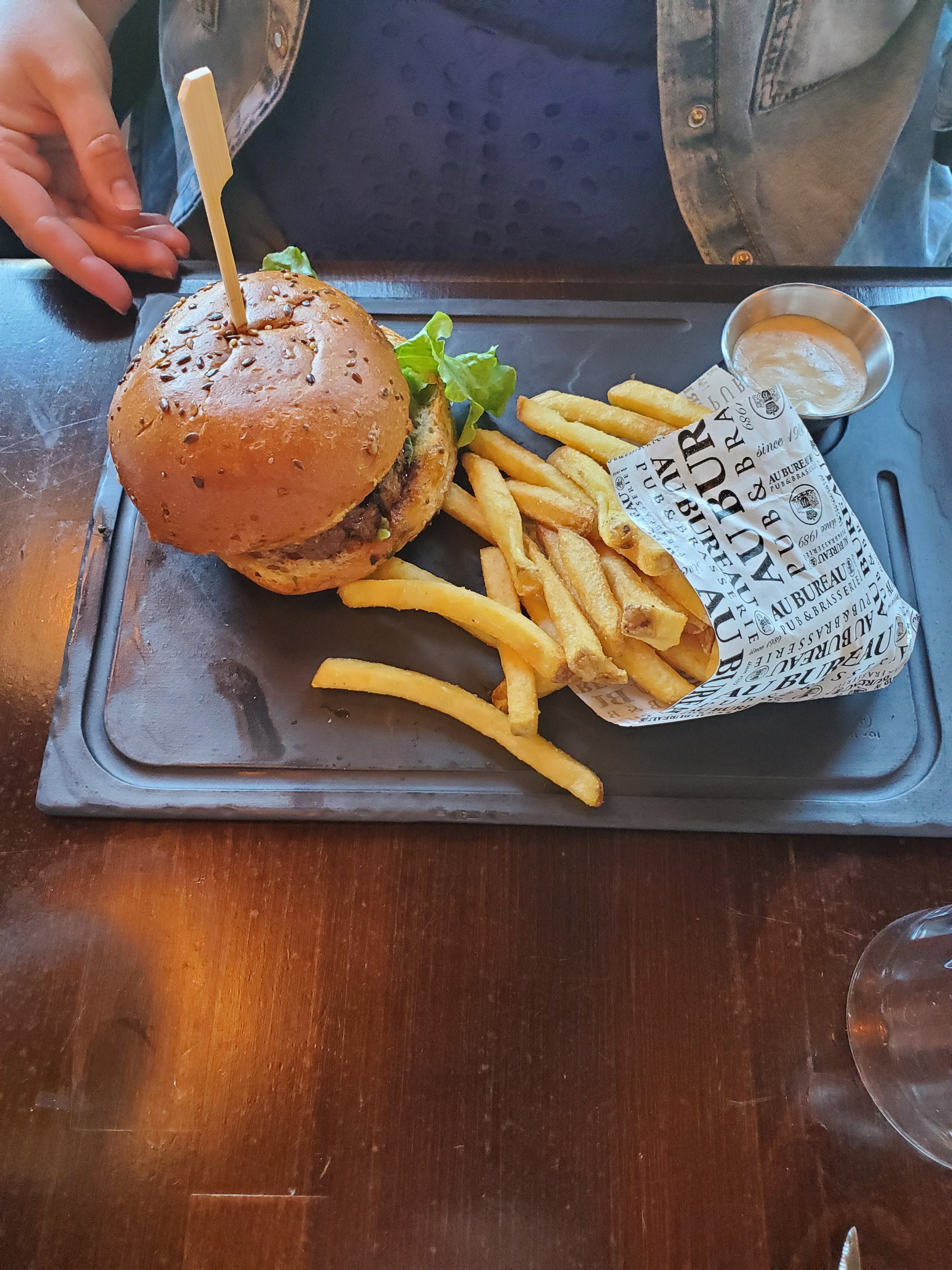 Un dimanche soir, envie d aller au resto...notre choix Au Bureau. Déjà l accueil par une aguerie de ce resto, bon, un bref sourire mais peu être la fatigue de cet fin de semaine. Commande par une jeune après plusieurs passages des serveuses autour de notre table. Après un apero sympa, nos plats arrivent heuuu comlent dire l entrecôte très grasse et en accompagnement une petite poignée de frites et une feuille de salde, bon pour le regime c est top ! Le Burger double steak j ai cherché la sauce qui me faisait saliver d avance. Et pour faire passer le tout, nous avions commandé du vin, rosé qui est resté sur le comptoir à se réchauffer....nous avons du réclamer et la bouteille et un sceau à glace ! Les desserts, glace à moitié fondue. Ha j oubliai le staff principale passe son temps à discuter Inadmissible de la part de cette chaîne! En plus pratiquement 100 euros pour manger cela on préfère la Boucherie!