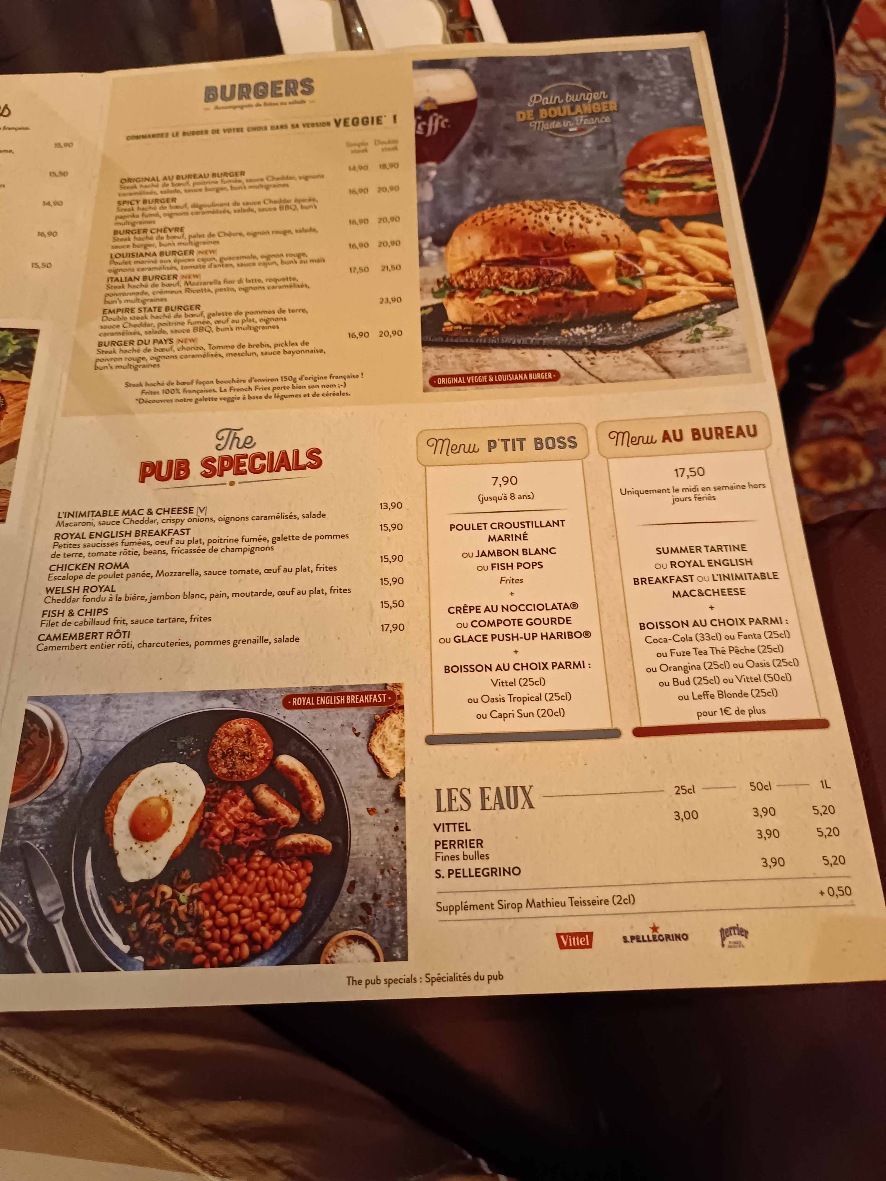 Bonjour Nous n'avons pas passé un bon moment La cuisine si on peut appeler ça de la cuisine est horrible c'est de l'assemblage avec des produits de mauvaise qualité. Ce n'est pas un restaurant. Je fais mieux chez moi. Aucune saveur trop de sauce de mauvaise qualité. Les frites ne sont pas bonnes et sont comptées. Ce n'est pas le Bureau que j'ai connu dans le passé J'ai apprécié le Perrier bien frais à 3€90. On nous demande plusieurs fois vous avez apprécié ? Non pas du tout