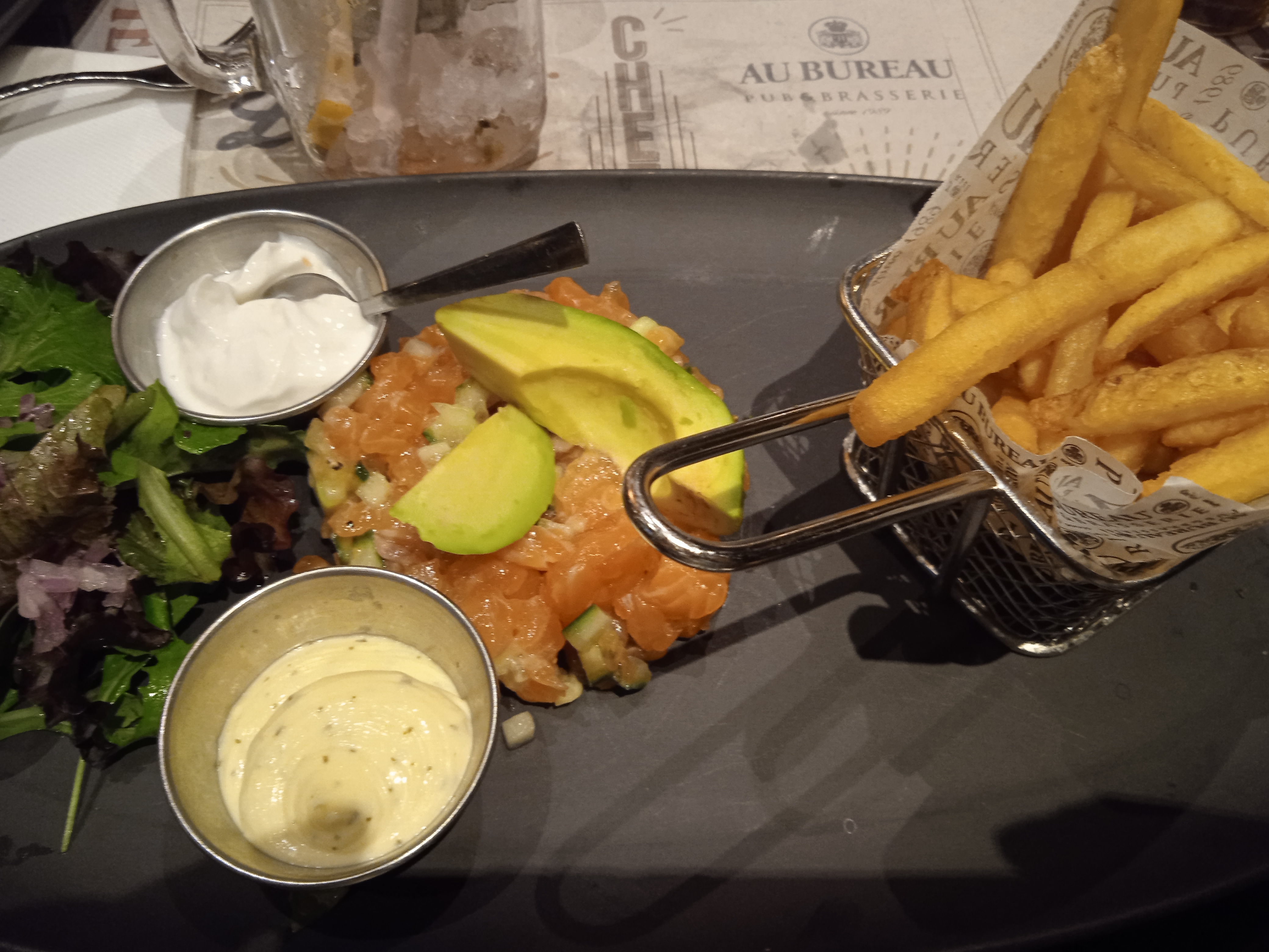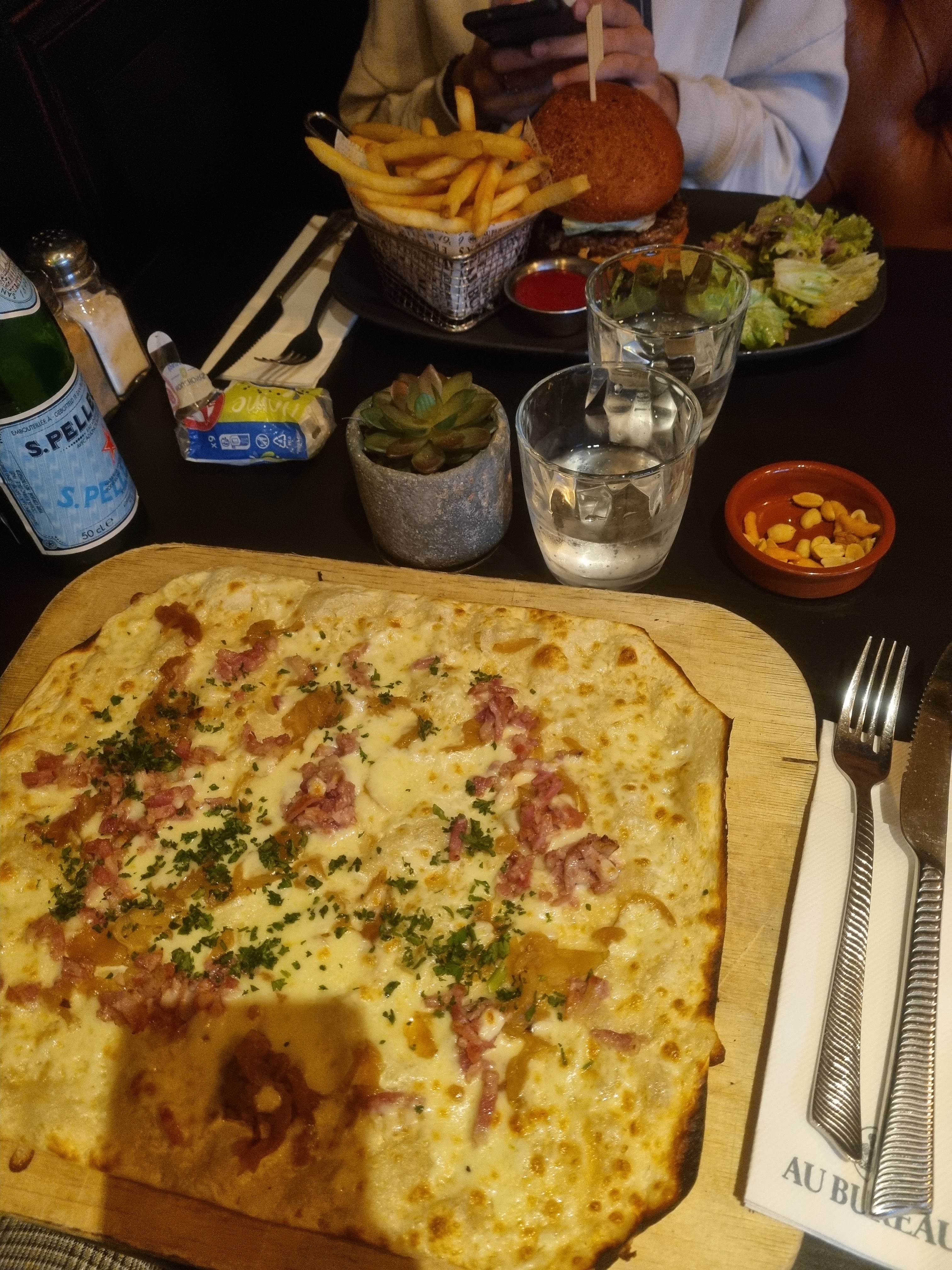 Honteux. Une serveuse très tiroir-caisse. À peine assis et de suite le souhait de prendre la commande. Ensuite beaucoup d'insistance pour passer la commande très vite, même pas le temps de commander un verre avant : objectif plus vite parti = plus vite une possibilité d'accueillir un nouveau client. Je n'ai rien contre la demoiselle qui respecte certainement les consignes, mais quand même, c'est devenu gênant... On a dû lui expliquer qu'on allait prendre son temps car on était en weekend... La bouffe pas terrible, enfin c'est Au bureau... Mais quand même, un minimum serait appréciable ! Personnel pas très agréable. Allez ailleurs !