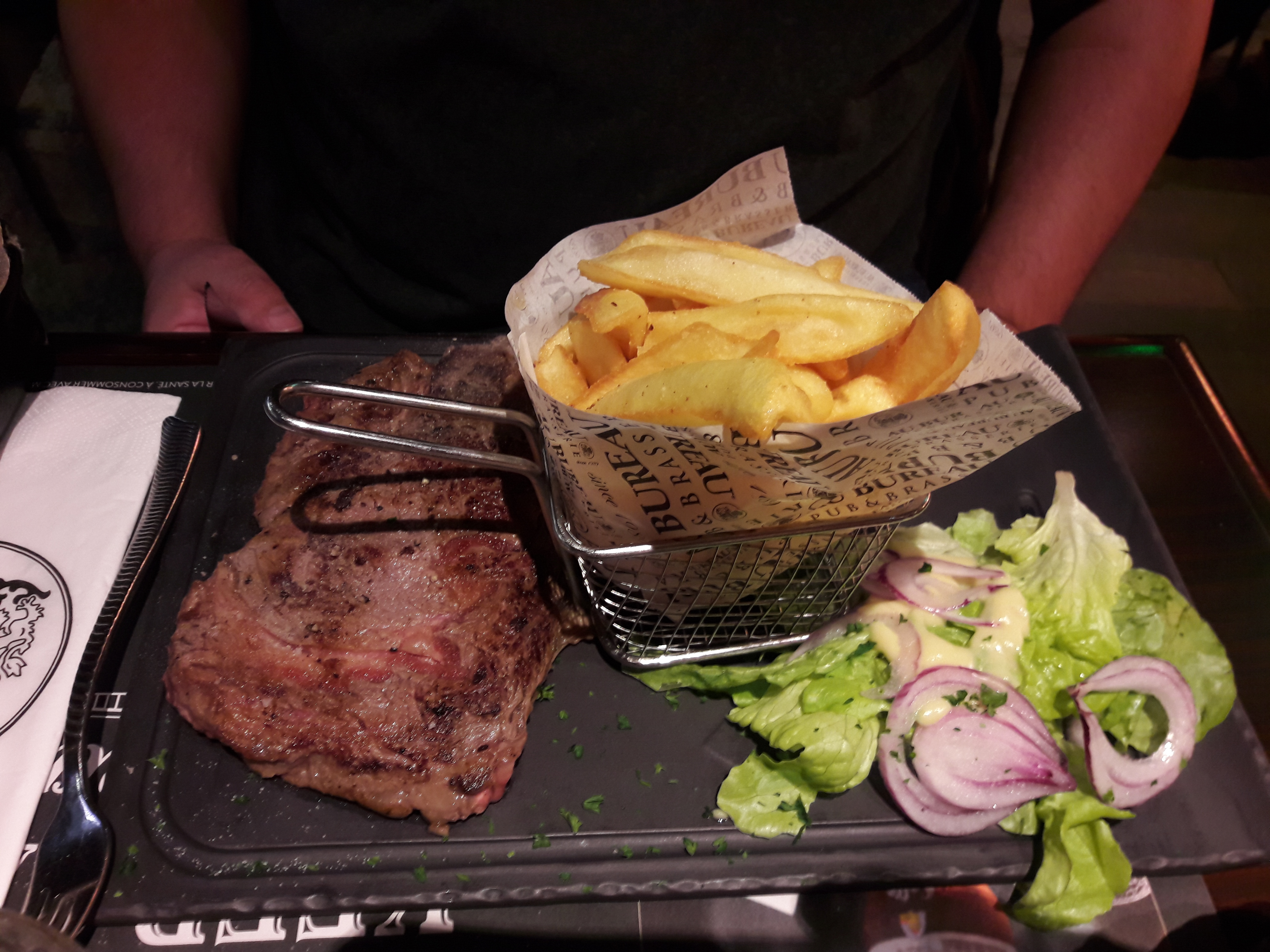 Bavettes commandées pour 2 personnes, nous avons toutes les deux eu de la viande difficile a mastiquer, dure et pas gouteuse du tout. Etonnant pour un restaurant specialisé en viandes. Les desserts sont de qualité, bemol au niveau du service, un thé gourmand est sensé être servi au complet et pas le thé 10 minutes plus tard que les desserts. Autre élément, les feuilles à colorier pour les enfants ne sont pas proposées systématiquement par les serveurs donc certains en ont et d'autres pas. Je ne recommande pas.