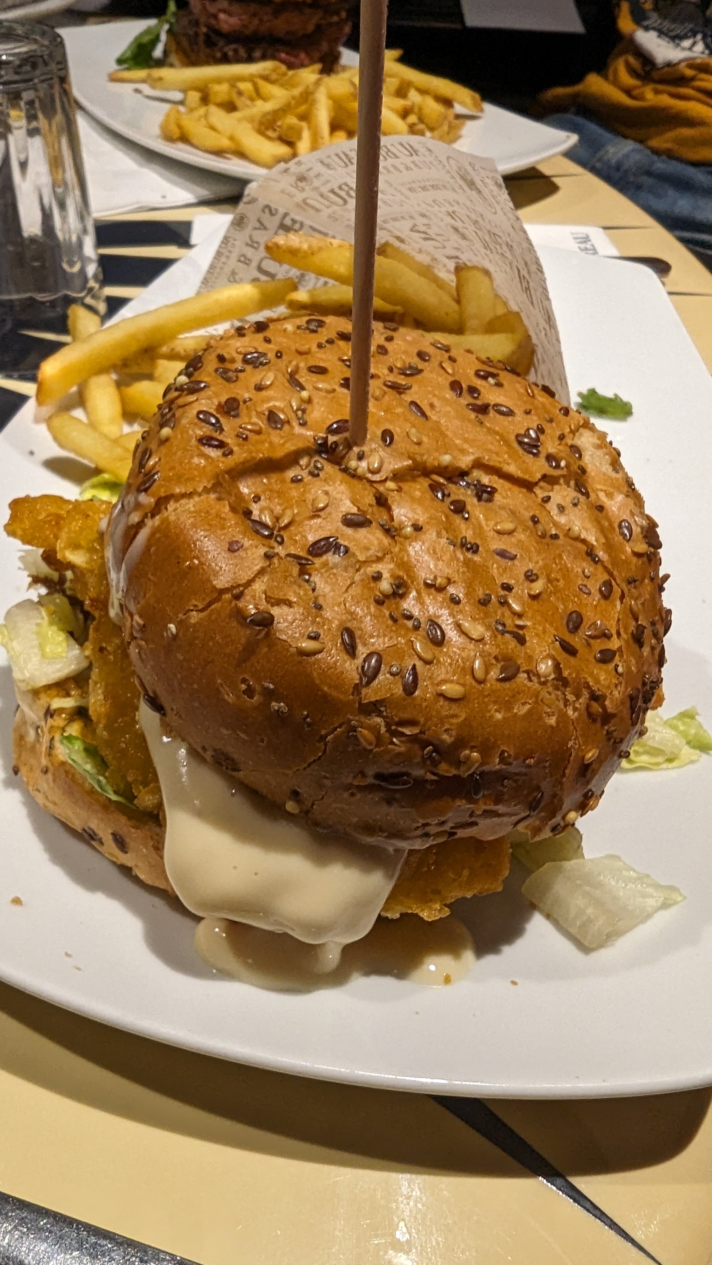 Nous sommes arrives à 20h. La commande des boissons est arrivée relativement vite, en revanche, notre commande de repas n'a été prise qu'à 20h40 malgré nos appels aux serveurs. Nous avons demandé à de multiples reprises une carafe d'eau sans qu'elle ne nous ai été apportée. 3 plats sont arrivés à 21h15, tandis que mon plat (le dernier donc) est arrivé une dizaine de minutes plus tard. En bref, les délais étaient très longs. Heureusement qu'un groupe de musique était présent afin de faire l'animation. C'est ce qui, je pense, a tout sauvé. Niveau plats, les burgers étaient bons, mais il manquait un citron avec le fish & chips, dommage.