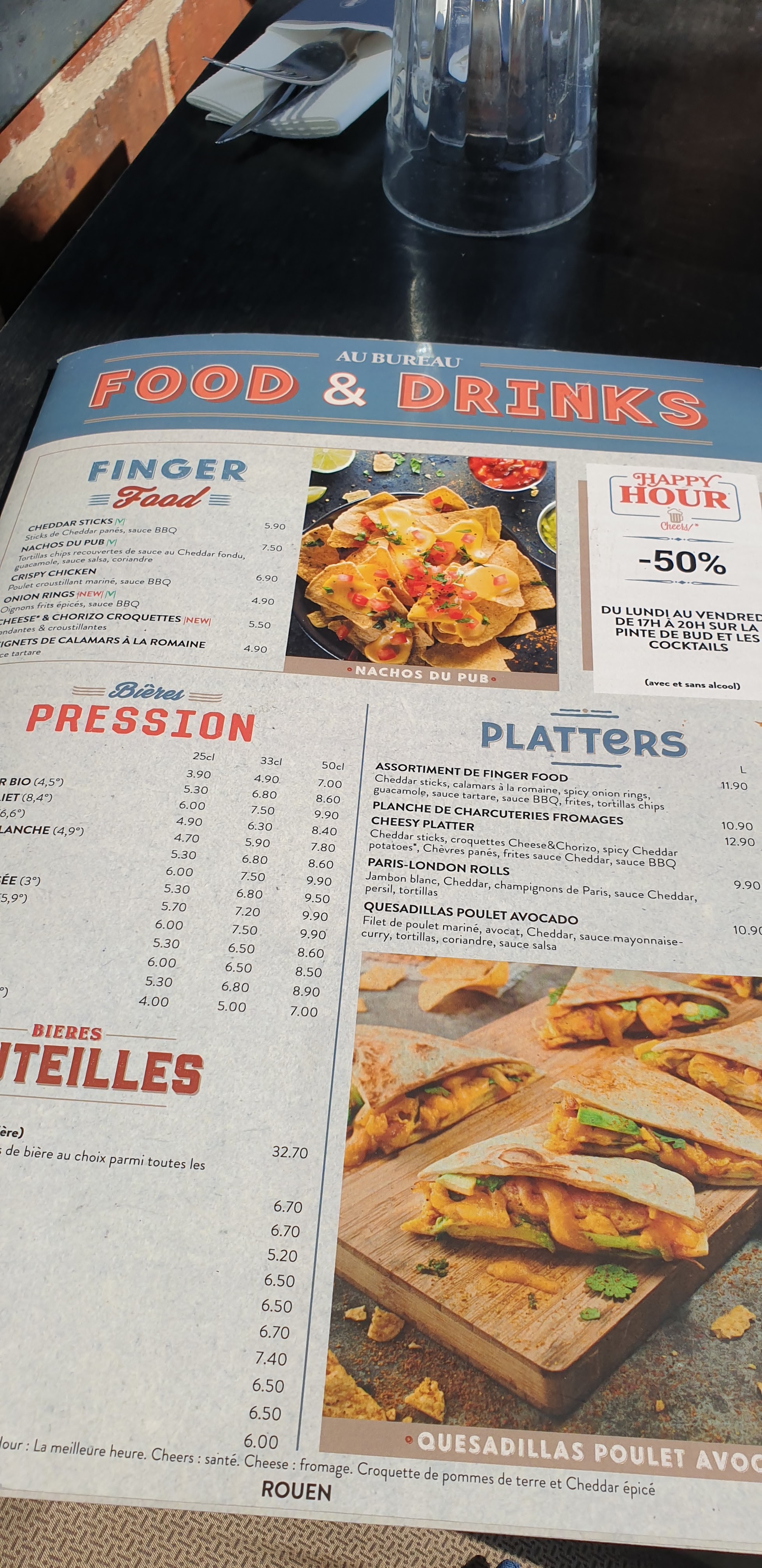 Très déçu de notre passage au bureau. Déjà à peine arrivé pas très bien accueillis on nous place à contre coeur limite. (On demande une place à l’ombre pas foutu de nous trouver une solution) Nous avions pris 3 verres - un saut de frite et des tortillas avec du guacamole dans ce plat a 9€ il y avait que 3 chips.. nous n’avions pas fini alors nous demandons aimablement 2/3 chips pour finir ou alors une cuillère.. très contente on nous ramène un bol de chips mais qui nous a été facturé sans notre consentement vu qu’on avait dit une cuillère si c’était pas possible d’avoir d’autre chips en plus.. bref pas terrible comme service client.