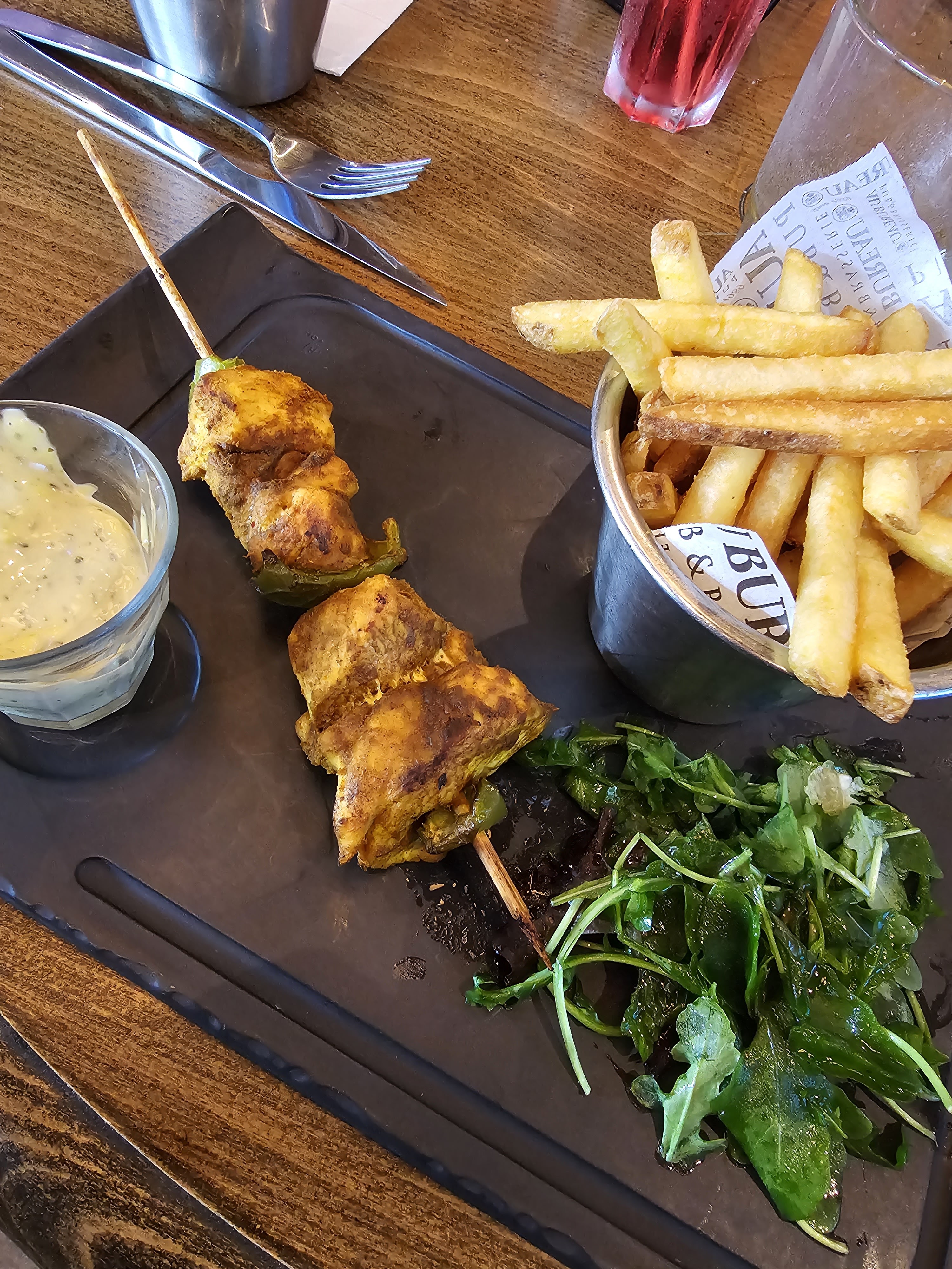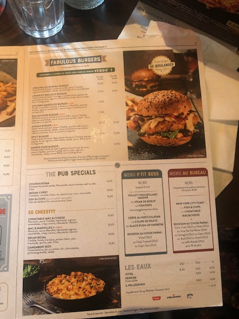 Cadre original, très grand (peut être trop) du bruit de vaisselle cassée à plusieurs reprises. Arrivés à 20h30 un samedi soir (table de 8 réservée) , repas servi à 22h! (Longtemps après l'apéritif ! ). Déçue par mon plat : le chiken burger raclette : galette de PDT très grasse, pas le goût de la raclette, pas de poulet, le steak bon, la salade d'accompagnement noire et pas belle,les frites sèches et pas terrible. (je voulais goûter le welsh royal, il n'y en avait plus) Mes invités se sont régalés avec les camembert rôti et les macaroni cheedar donc c'est super ! Toilettes mouillés, fuite, sols pas très propre du coup.