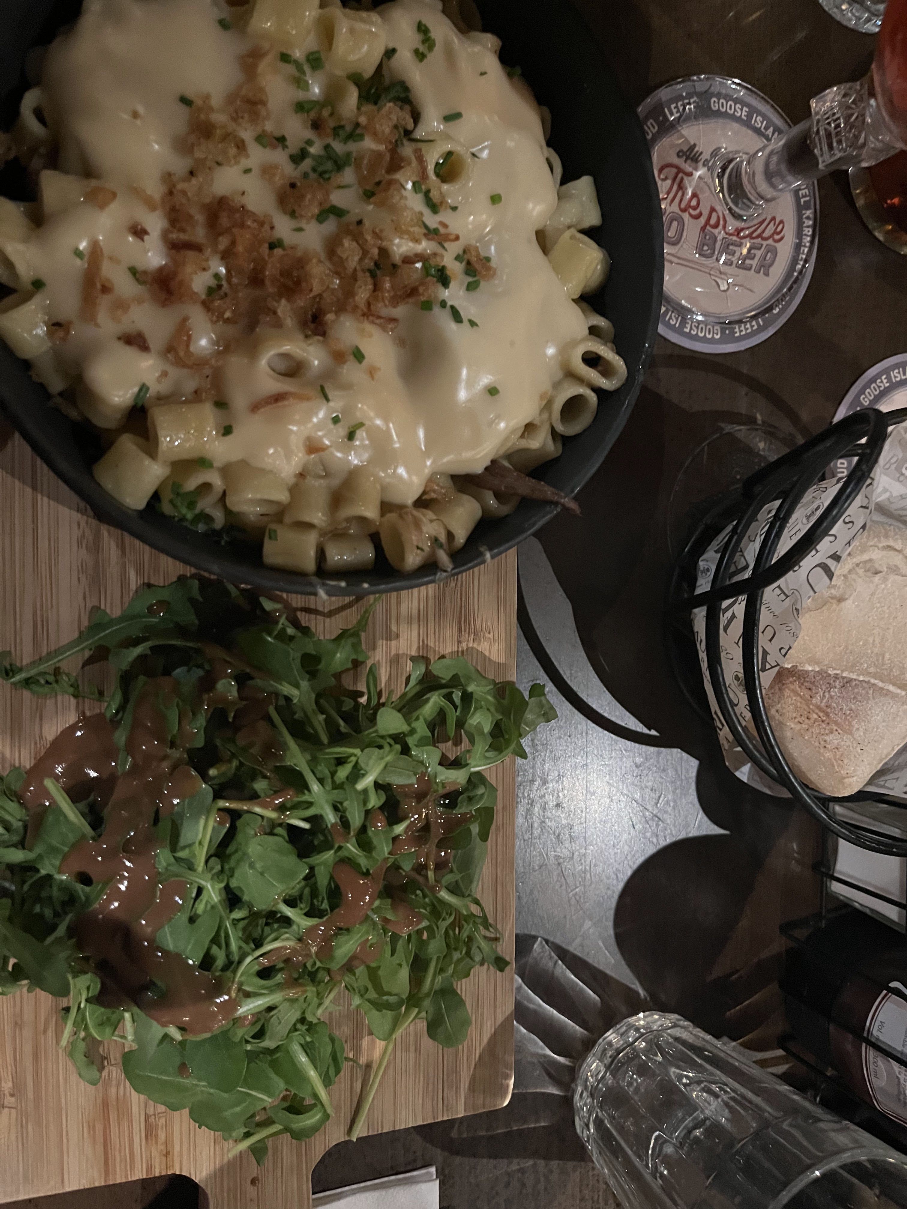 On m'avait vanté le mac and cheese difficile à finir tellement c'est copieux... Ben, non ! En fait, ça tenait dans deux petits ramequins, on aurait crû un dessert genre crème brûlée niveau présentation. Que s'est t'il passé ? N'y avait-il plus suffisamment de vaisselle ? Mystère. Donc, je dirais comme les profs quand j'étais jeune : Insuffisant, peut mieux faire !
