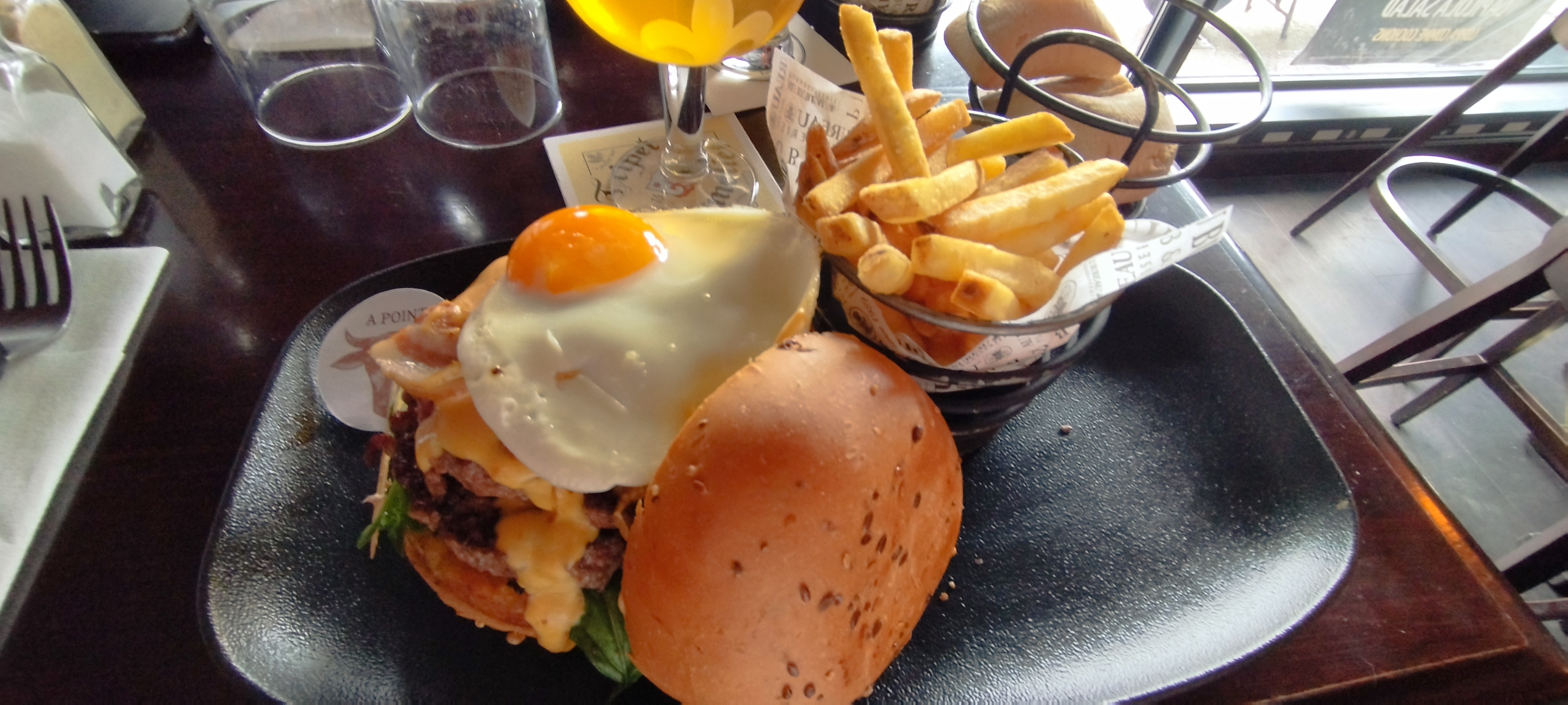 dommage! service parfait mais nourriture bcp bcp trop GRASSE! hamburger tres gras donc ecouerant! pomme de terre ( avec steach haché a cheval) qui baigne dans l'huile : ecoeuran! les frites trop grasses! dessert tres moyens! la crepes grasse , la pavlova bof, la creme brulée liquide donc pas bonne et le pire le café gourmand qui n'a rien de gourmant: sorte de tiramisu pas terrible ds verrine, creme de citron ds une autre verrine pas bonne et a coté une vulgaire past de flan meme pas bon! pire café gourmand jamais mangé! franchement c'est dommage! la deco est belle , le service parfait mais le princimal : le repas ça ne va pas! helas nous ne reviendrons pas ( nous sommes de Chartres je precise). dur de trouver de bons restos en 2024!!