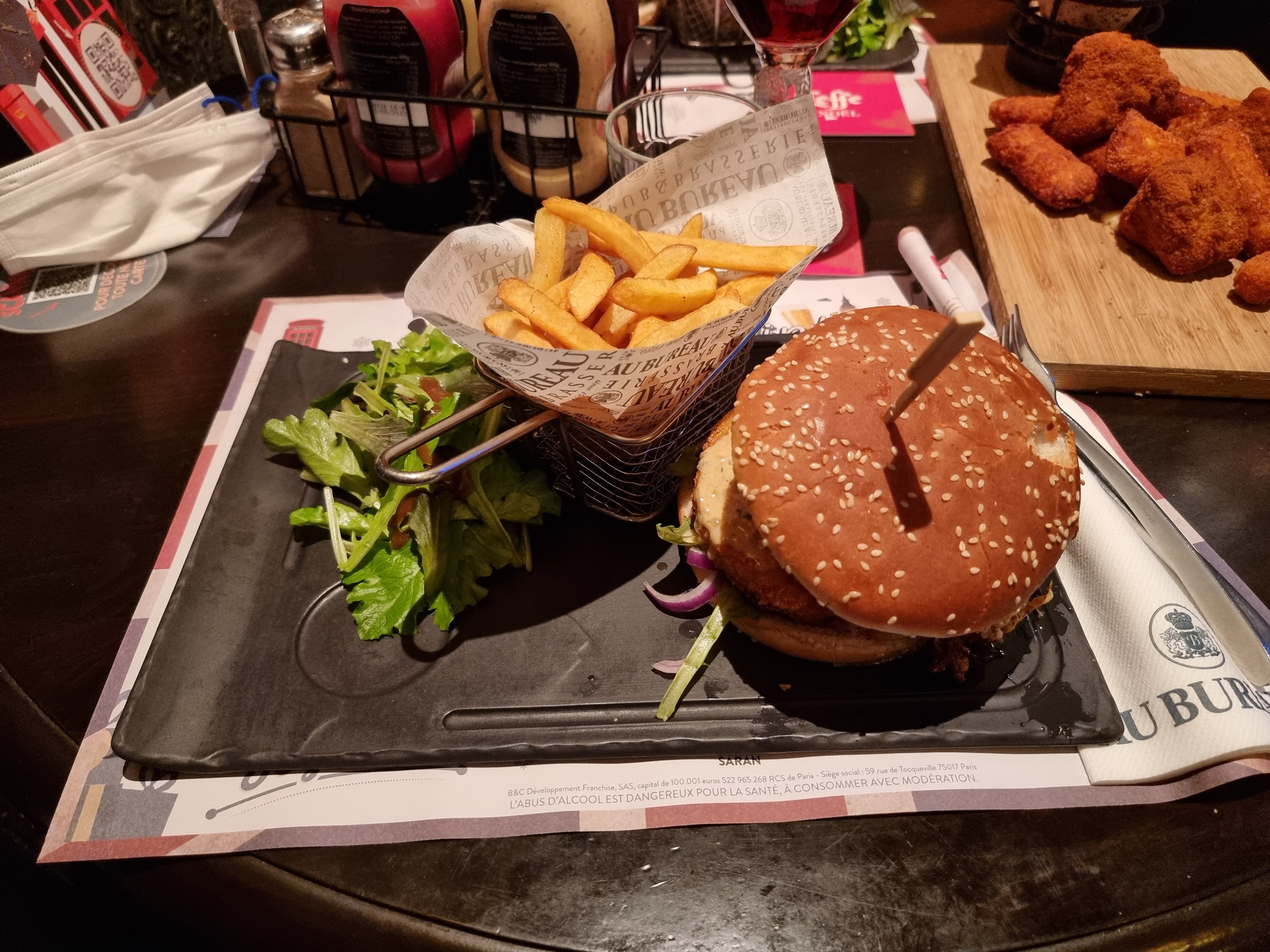 Arrivés un samedi soir vers 21h, nous avons été accueillis assez rapidement et servis de manière aimable et efficace. La décoration est vintage et des écrans affichent des images de très beaux paysages. Au niveau de l’assiette, les burgers étaient corrects et copieux. La brochette ne m’a pas laissé un souvenir impérissable. L’inflation est aussi passée par l’addition (près de 18 € le burger). Pour les aspects pratiques, il y a un parking et les toilettes sont accessibles aux personnes en situation de handicap. Sa situation un peu plus loin du complexe cinéma permet de trouver de la place et peut honorablement vous sauver l’après-séance quand les restaurants plus proches sont pleins.