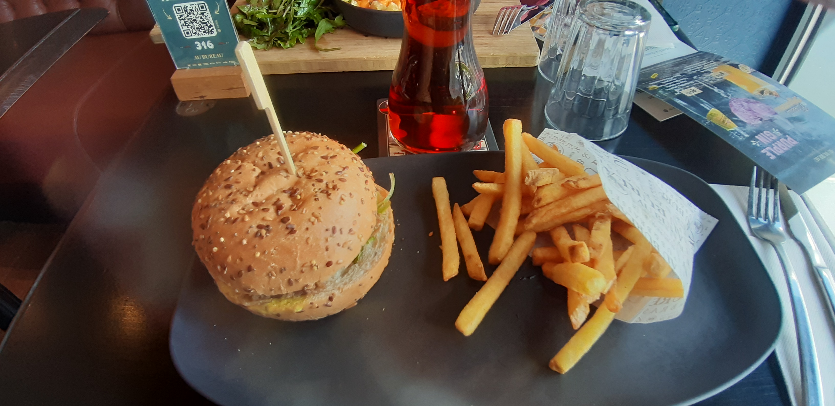 Nous avons mangé pour la première fois dans un restaurant au bureau. Très belle deco, l’intérieur est très jolie. Le repas était bon les burger sont copieux, le service un peut long quand même mais dans l’ensemble très bien.