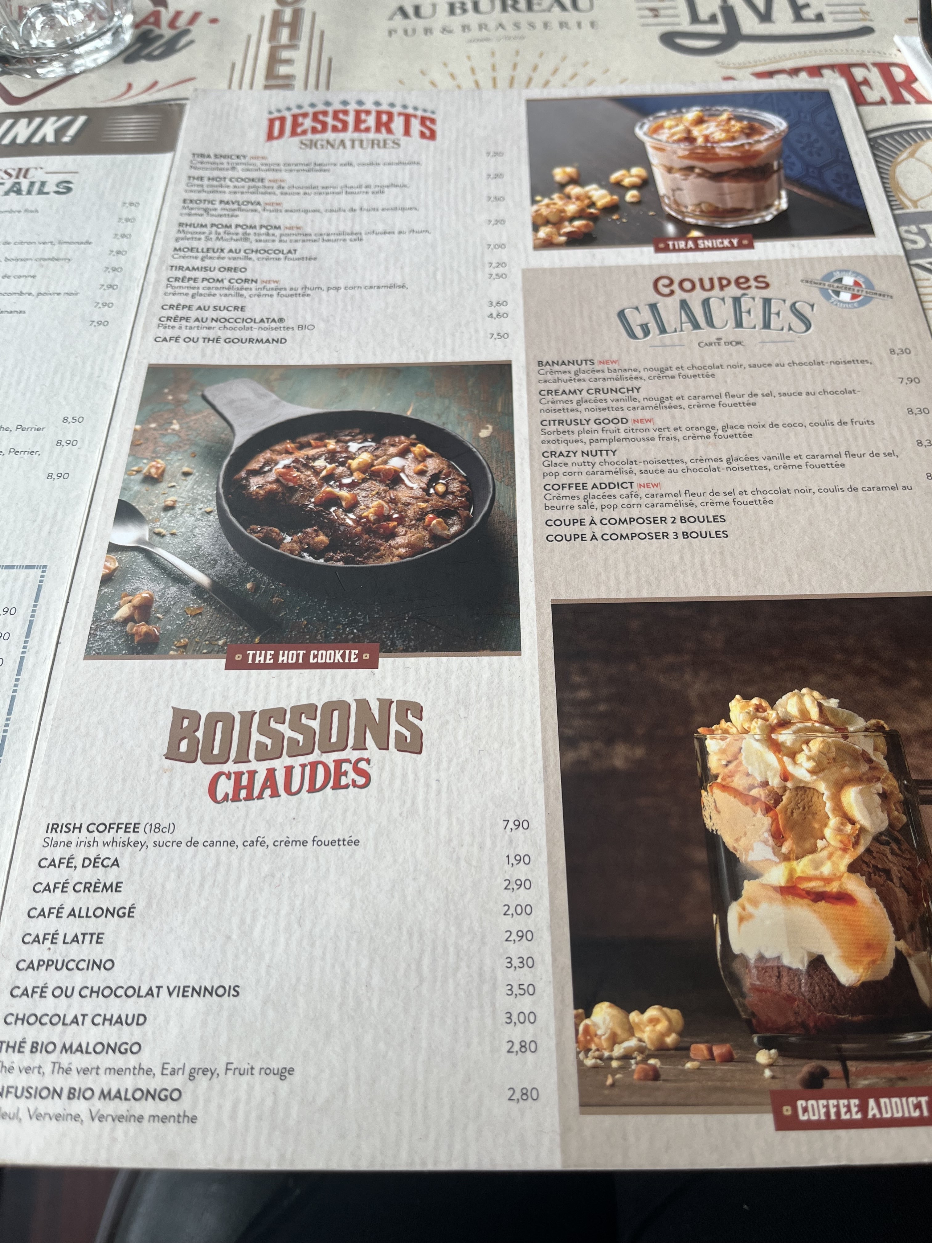 Nous sommes venus le samedi 27 avril. Le lieu est très bruyant, ce n est pas du tout agréable. Le service est bien, les serveurs sont souriants Les plats sont très limites Une bavette qui a la taille de la moitié d un steak hache. Les salades ne sont pas copieuses Il manque la moitié des ingrédients dans certains desserts Les glaces sont supers bonnes et très copieuses Moyenne de 37 euros par personne plat dessert et apero C est très cher pour le lieu c est une brasserie très très bruyante