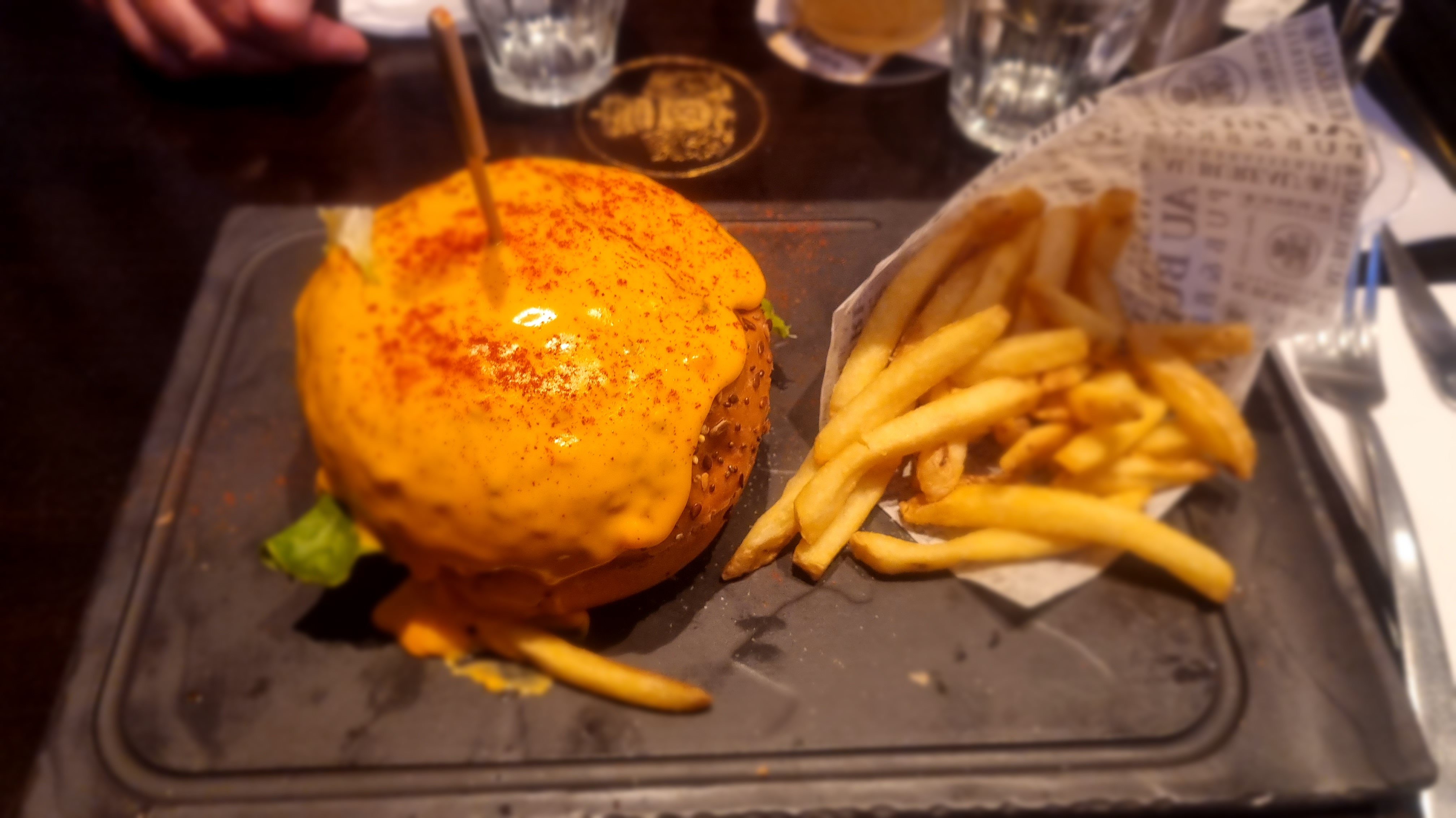 Restaurant sympa, jolie déco, ecran géant pour diffuser match par exemple, ideal pour se retrouver entre amis Le week end c'est très fréquenté, ce qui en fait une salle bruyante mais pas derangeant et un service un peu long Les burgers sont bons ainsi que les frites mais pas les flammenkeuches qui sont fades et pas assez garni avec une pate élastique difficile a couper et a manger . L'eau n'est pas bonne Les plats sont bien présentés La femme blonde assez imposante qui a l'air d'être la patronne ou une responsable n'est pas agréable et avenante , heureusement les serveurs sauvent la mise