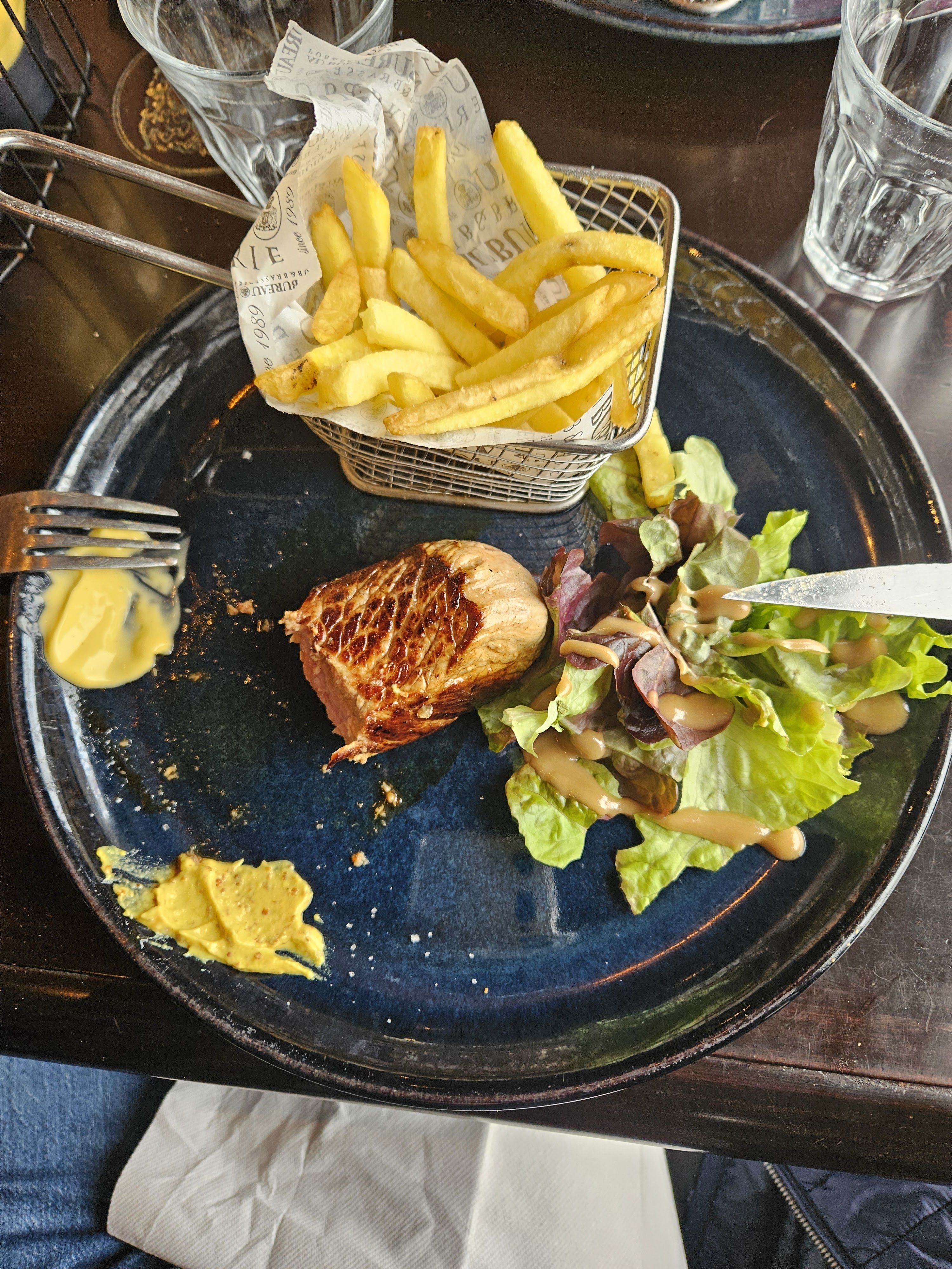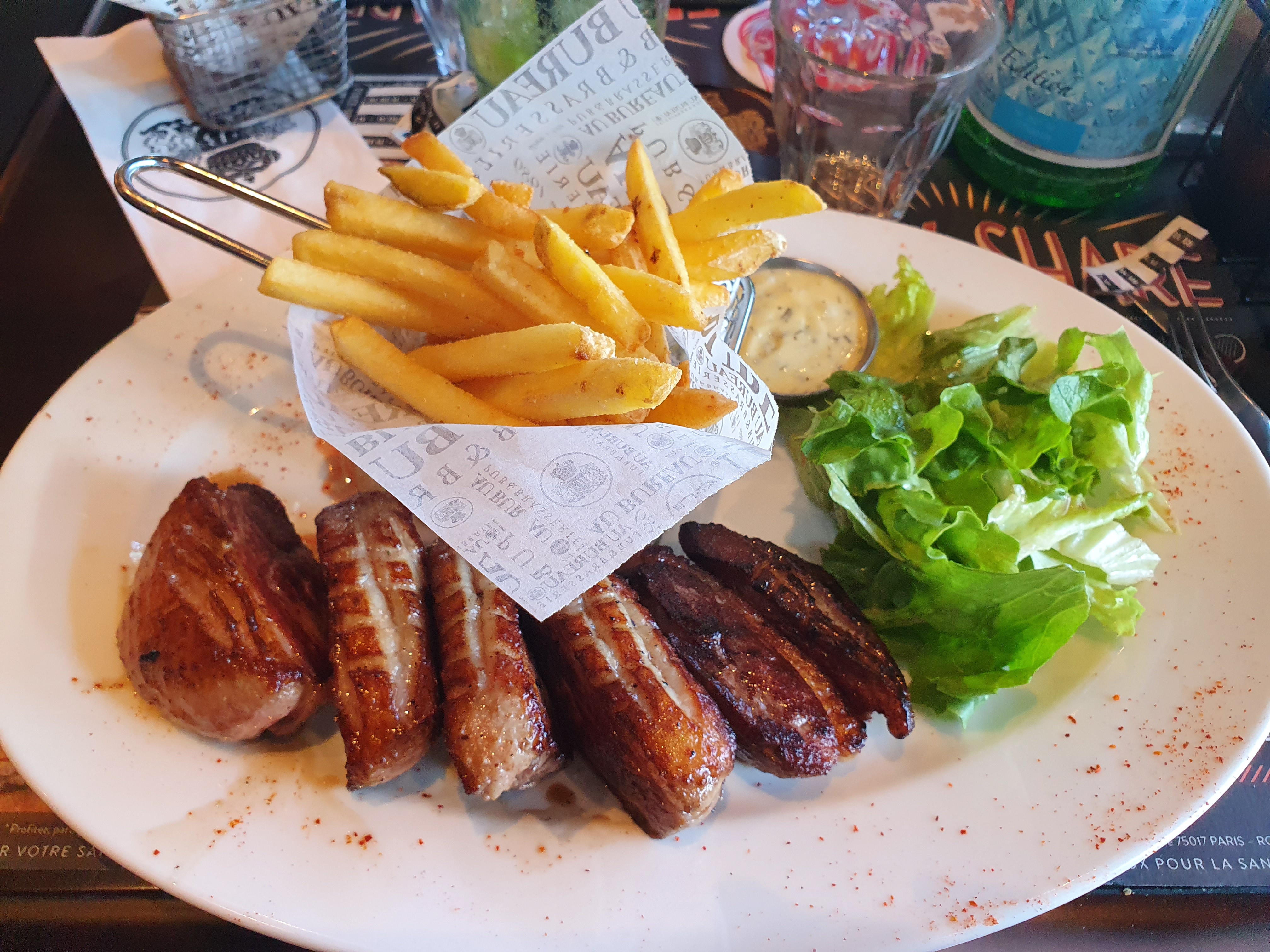 Bavette super bonne, mais frites industrielles et ça... C est pas bon et vu le prix des plats C est pas cool et fait baisser la note.