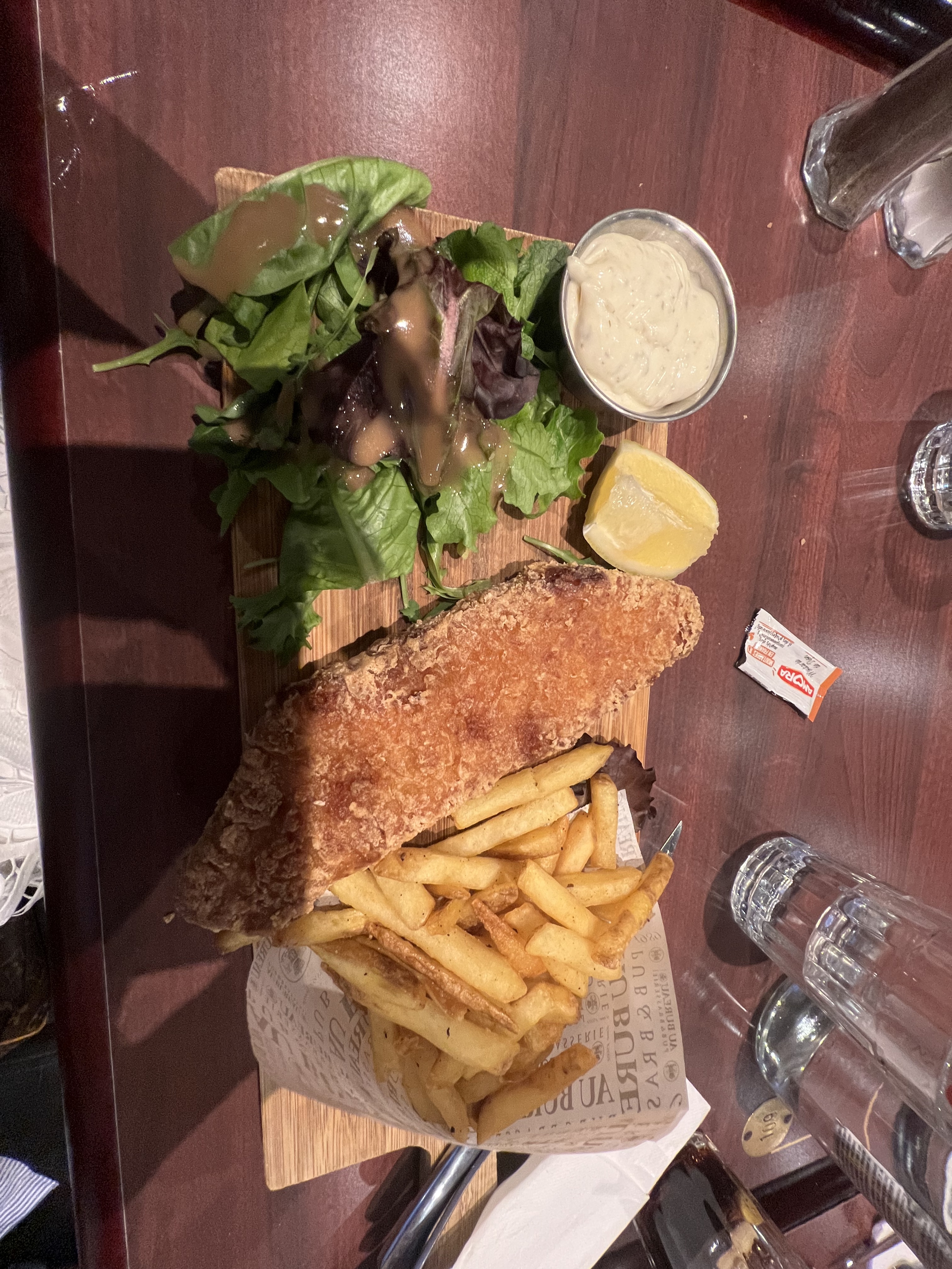 Une très mauvaise expérience au niveau alimentaire deux fish and chips dont les poissons étaient de véritables éponges à huiles et les frites à peine tiedes, un tartare sans gout. Le tout décoré par une salade flétrie et sans assaisonnements. Heureusement les désserts étaient bons et le personnel de service charmant.