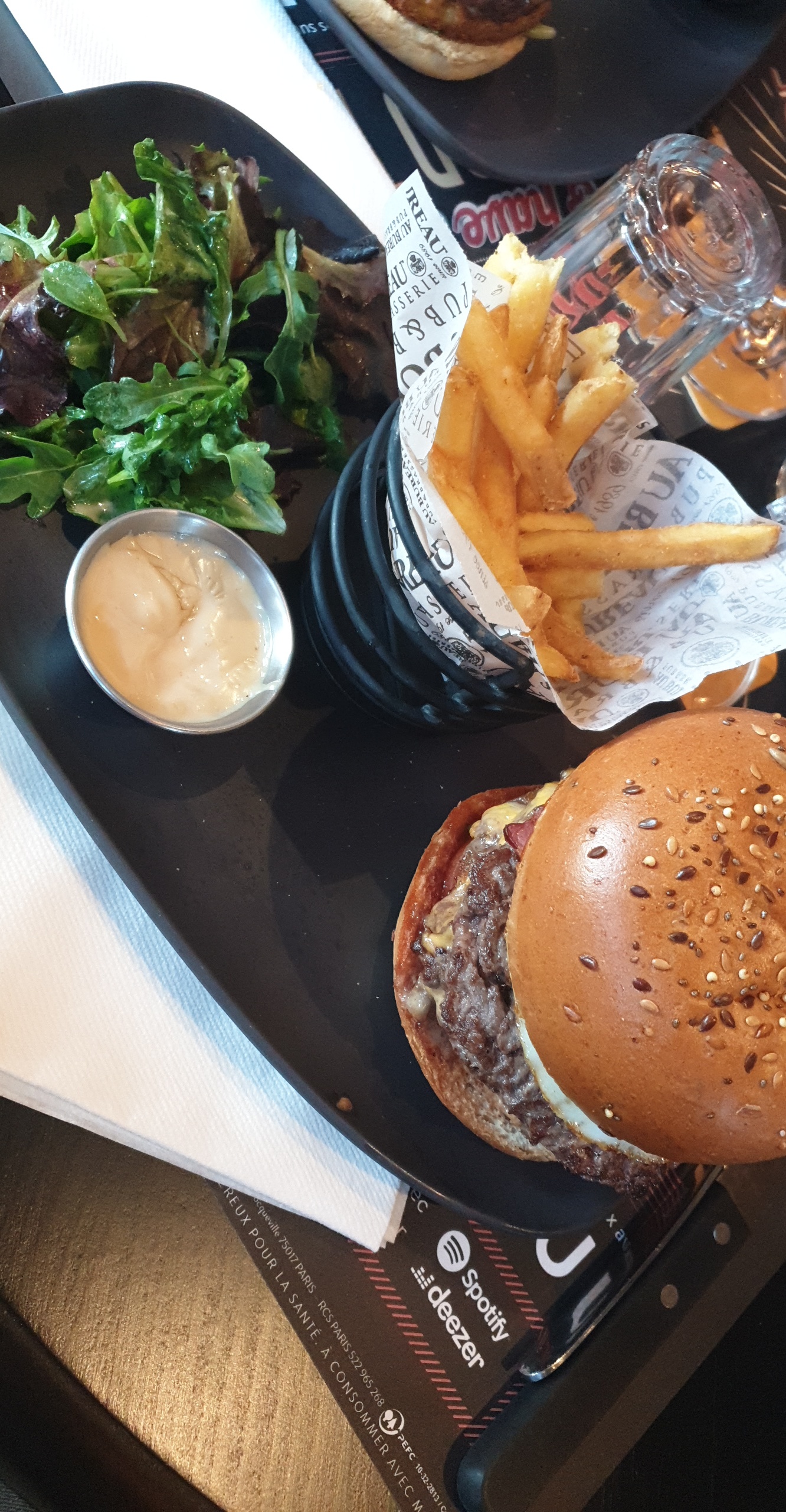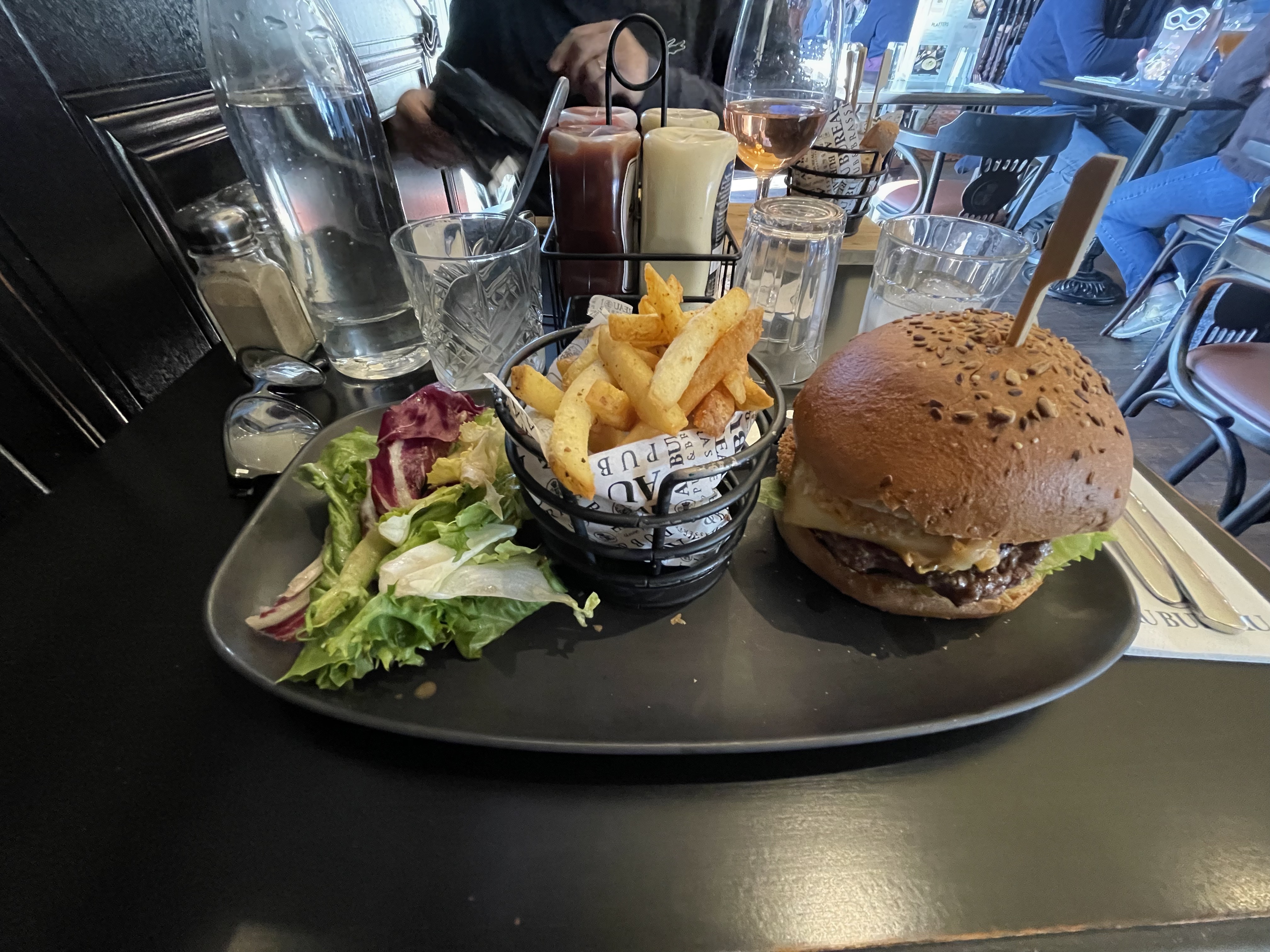 Par où commencer, ... nous avons décidé de venir au Bureau car nous avons l'habitude de celui de Toulon malheureusement il y a une bien grande différence. Nous avons commencé par un apéro avec planche, certains cocktails étaient de l'eau... et la planche très simple et puis de base c'est 2 fromages de chaque certain pendant le trajet au dû être grignoté Place au plat, frite gelée, les sauces pour les frites et Burger on est oubliés et nous avions demandé un changement sur un des plats qui n'ont pas été faits ... puis je vous laisse en image notre magnifique salade qui a été cueillis il y a une semaine sur le parking .... Bref il faudrait revoir certains trucs