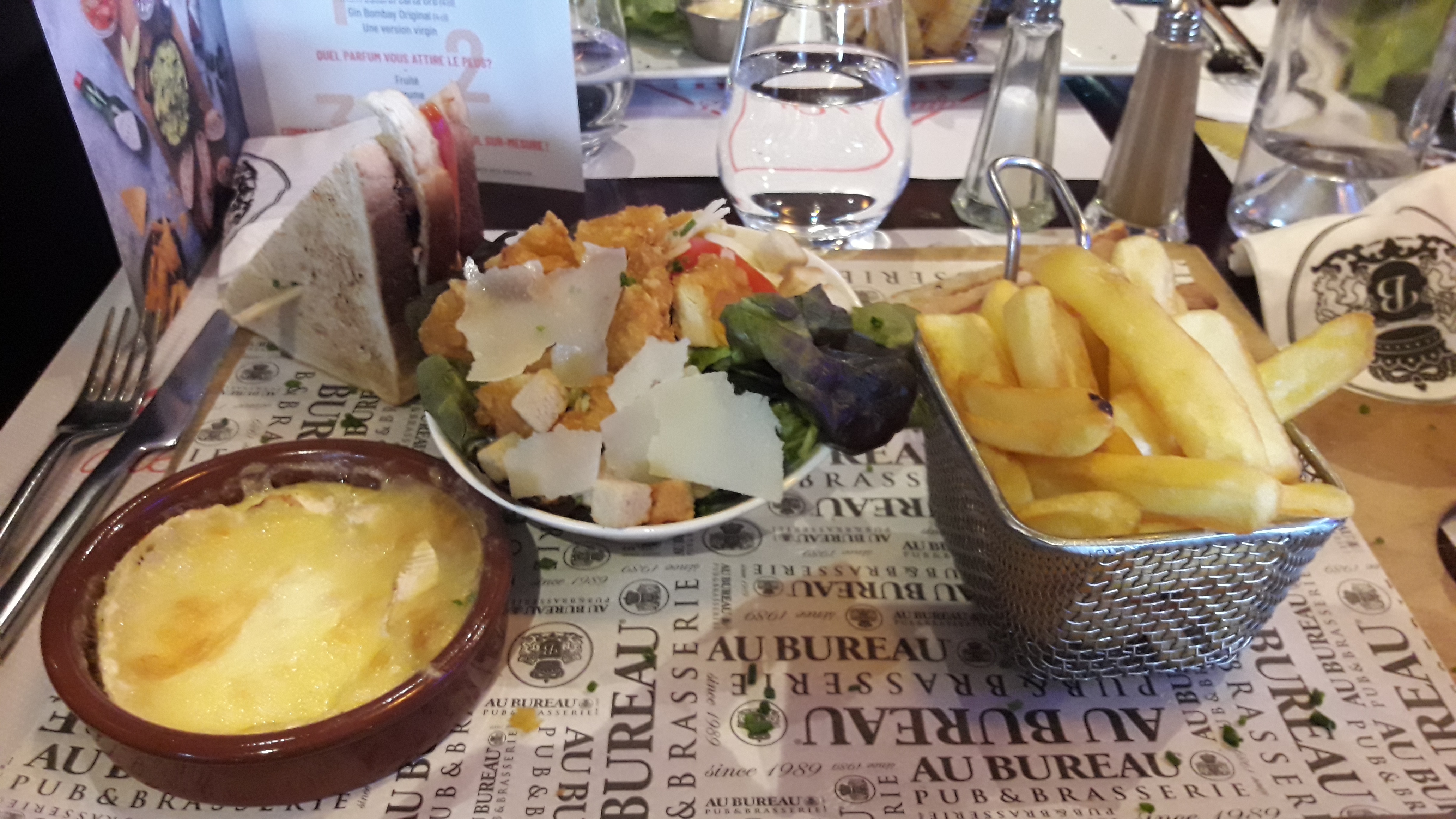 Habituellement satisfaite des établissements Au bureau (dont celui-ci), j'ai été déçue de notre soirée hier soir. - problème de four réduisant les choix sur la carte. - bien que les photos ne soient pas contractuelles sur le menu, il y a une sacrée différence entre la photo de la country style salad et le plat qu'on vous sert : moins de quantité, et des ingrédients en moins (pas de grenade ni de mesclun par exemple), ... - nous avons été conviés à quitter les lieux environ 1h30 avant la fermeture à cause de ce fameux problème technique mais en aucun cas un geste commercial n'a été fait sur l'addition..