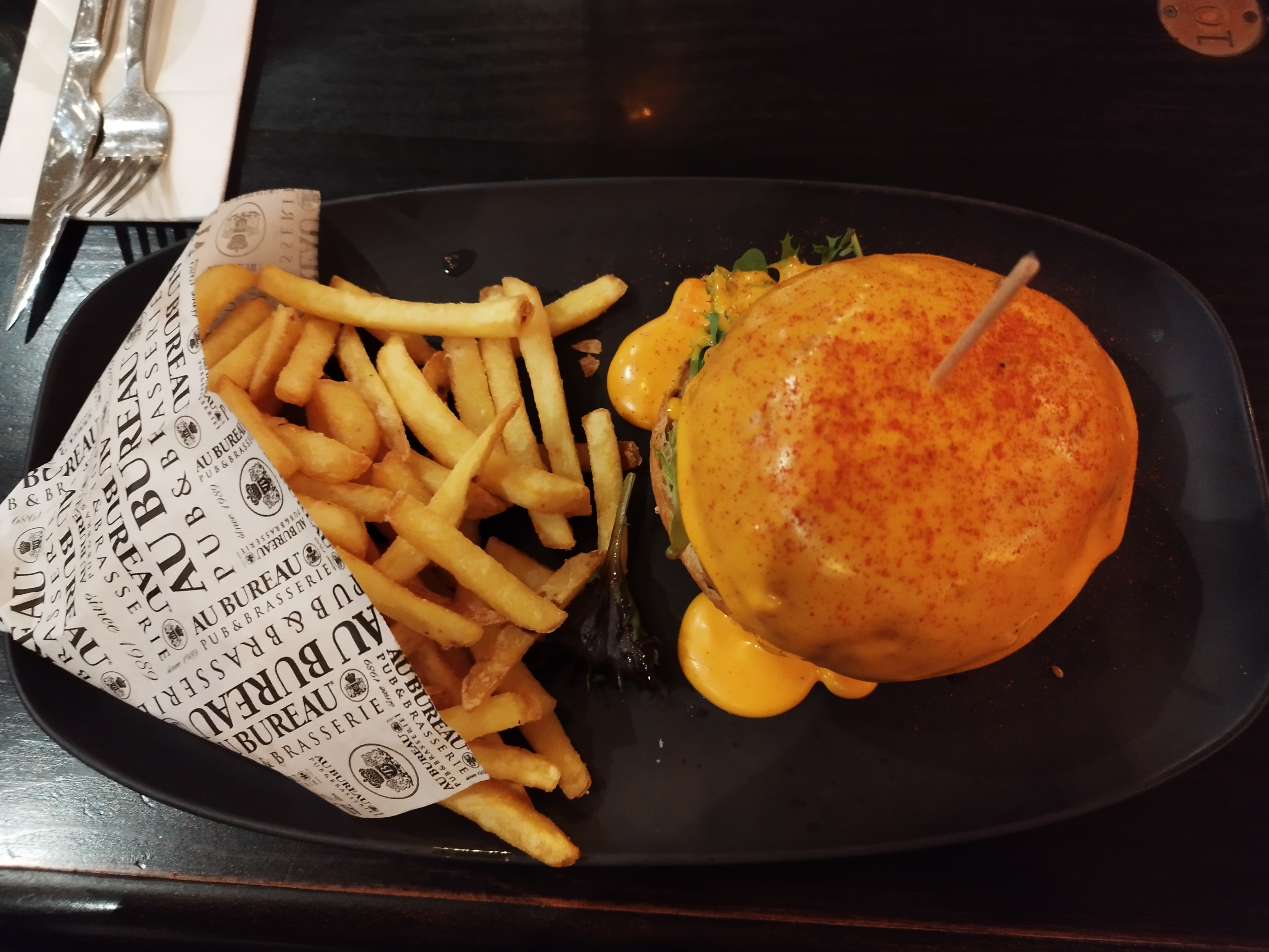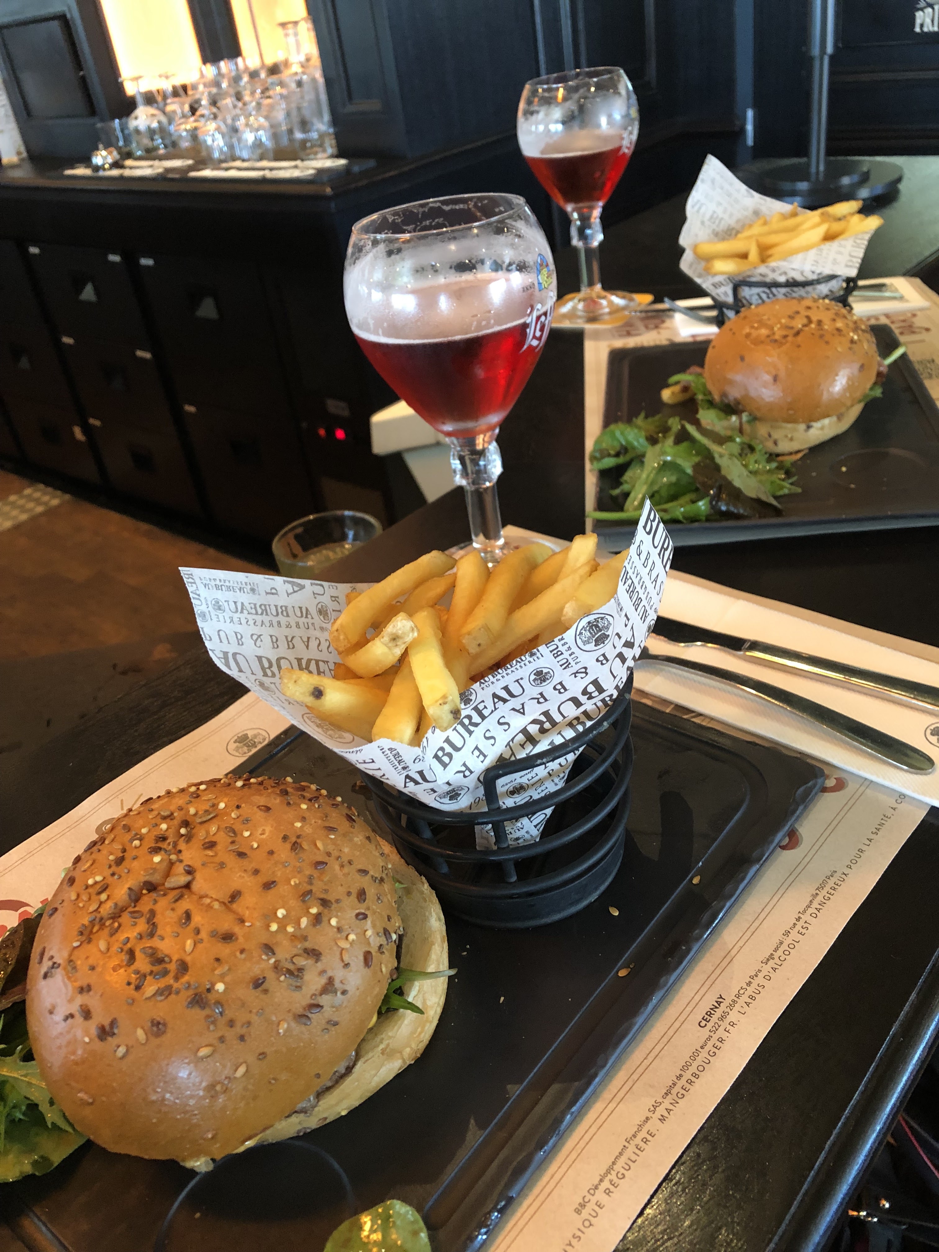 C'était notre première, et bien nous avons bien apprécié. Bon le restaurant était blindé donc a faillit nous refuser vu que l'on avait pas reversé mais nous sortions du cinéma ! La carte est très fournie, je doute que tout soit du frais, mais c'est très bon, bonne cuisson et du goût. Les enfants ont adoré leurs nuggets dans le menu kids. Le service était bon malgré qu'il soit plein. La déco est vraiment chouette, mais je trouve qu'il manque un petit quelque chose juste pour donner une ambiance plus chaleureuse, mais vu que ça s'appelle au Bureau ... Peut-être qu'il faut du sérieux lol !! Non les écrans géants sont top surtout quand on a des enfants qui ne tiennent pas en place. Je conseille et nous y retournerons. Et sans oublier les happy hours 👍.