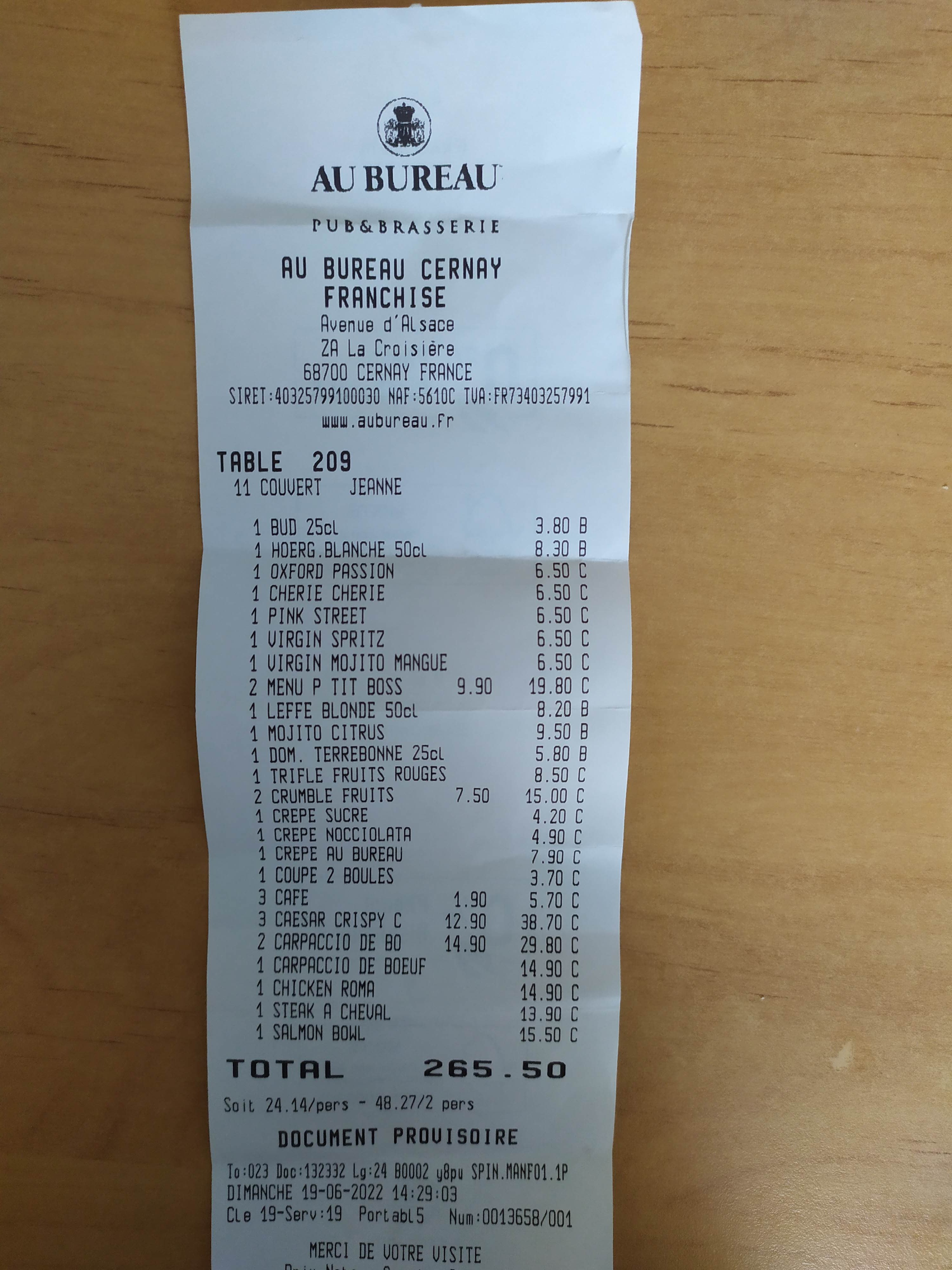 Toujours ravi de venir au Bureau a Cernay, le service est top, très bon, rapide. La carte est modifié régulièrement et la fermeture tard le soir en fait un plus. J'y reviens régulièrement avec ma famille et y fait découvrir des amis. Une carte de fidélité avec d'éventuelles réductions serait le top.