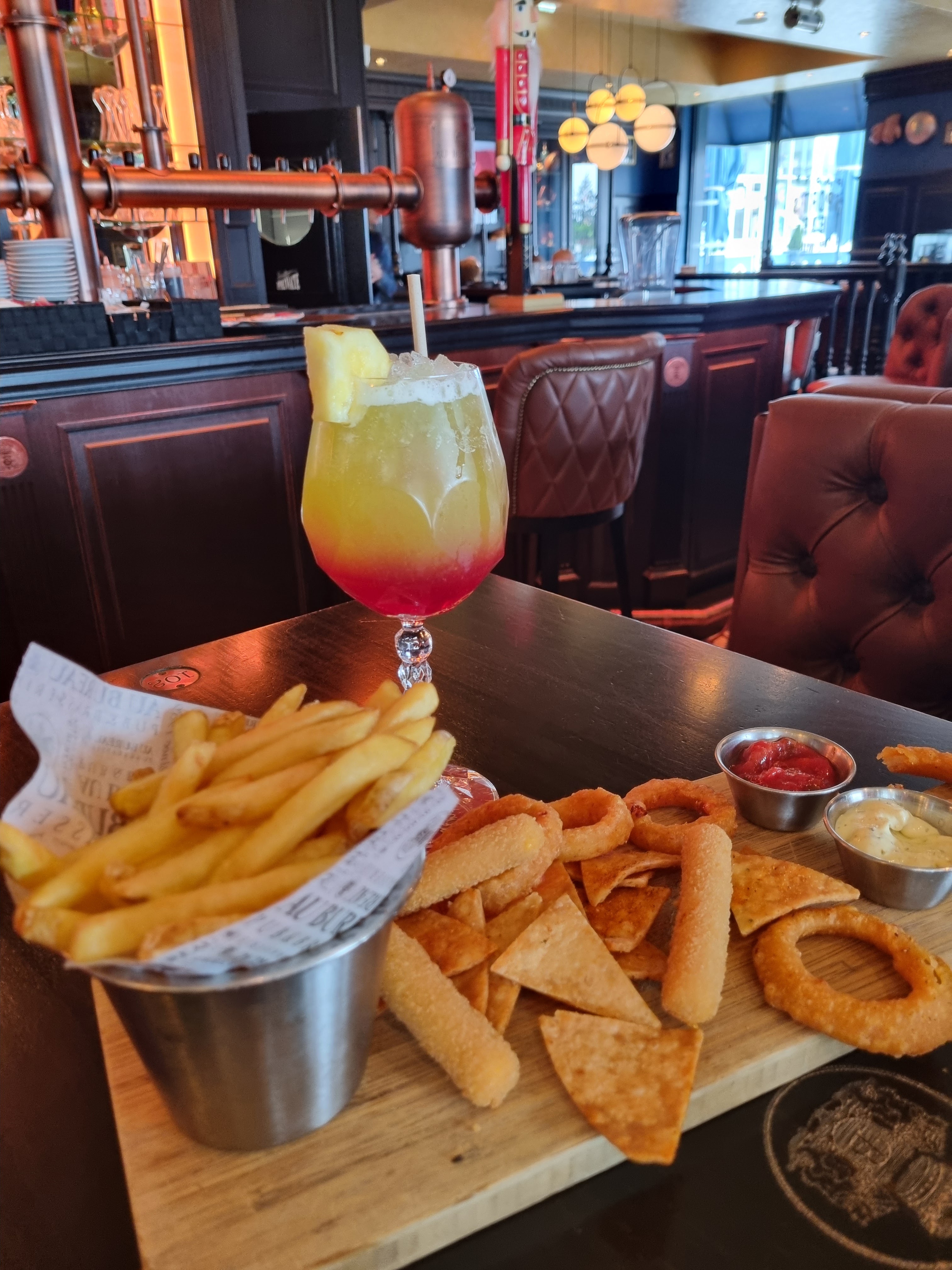 Les cocktails sont très bons et entre 17 et 19h encore meilleurs (à 5€ seulement... En semaine 😉) Uniquement pris des calamars et une tarte flambée. 5 calamars pour 6.90€ ça fait un peu cher. La tarte flambée était bonne. Notre serveuse était super serviable et souriante. Une chanteuse pour accompagner ce moment.. Bravo quelle belle voix
