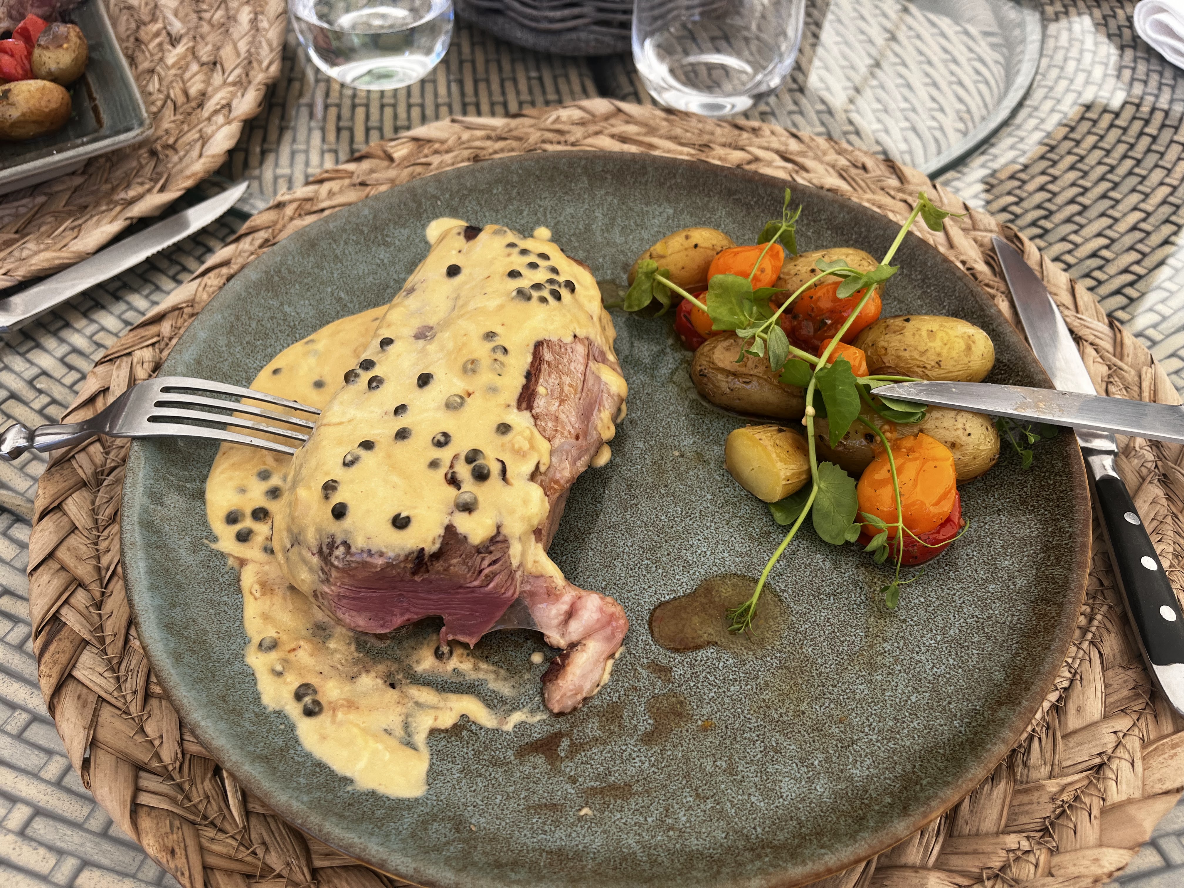 Nous avons déjeuner un dimanche après-midi, l’atmosphère est sympathique, il faisait chaud mais le cadre reste beau ! Nous avons dégusté la pièce du boucher, les gambas et magret de canard, en dessert une coupe Melba et une île flottante. C’était correct sans plus. Venant de la Côte d’Azur, j’étais étonnée de voir des prix supérieurs ou égaux à ceux en face de la mer… Le prix est donc à mon sens bien trop cher. Cependant Mention spéciale au service, la serveuse était super: énergique, pleine d’humour et de bonne humeur.