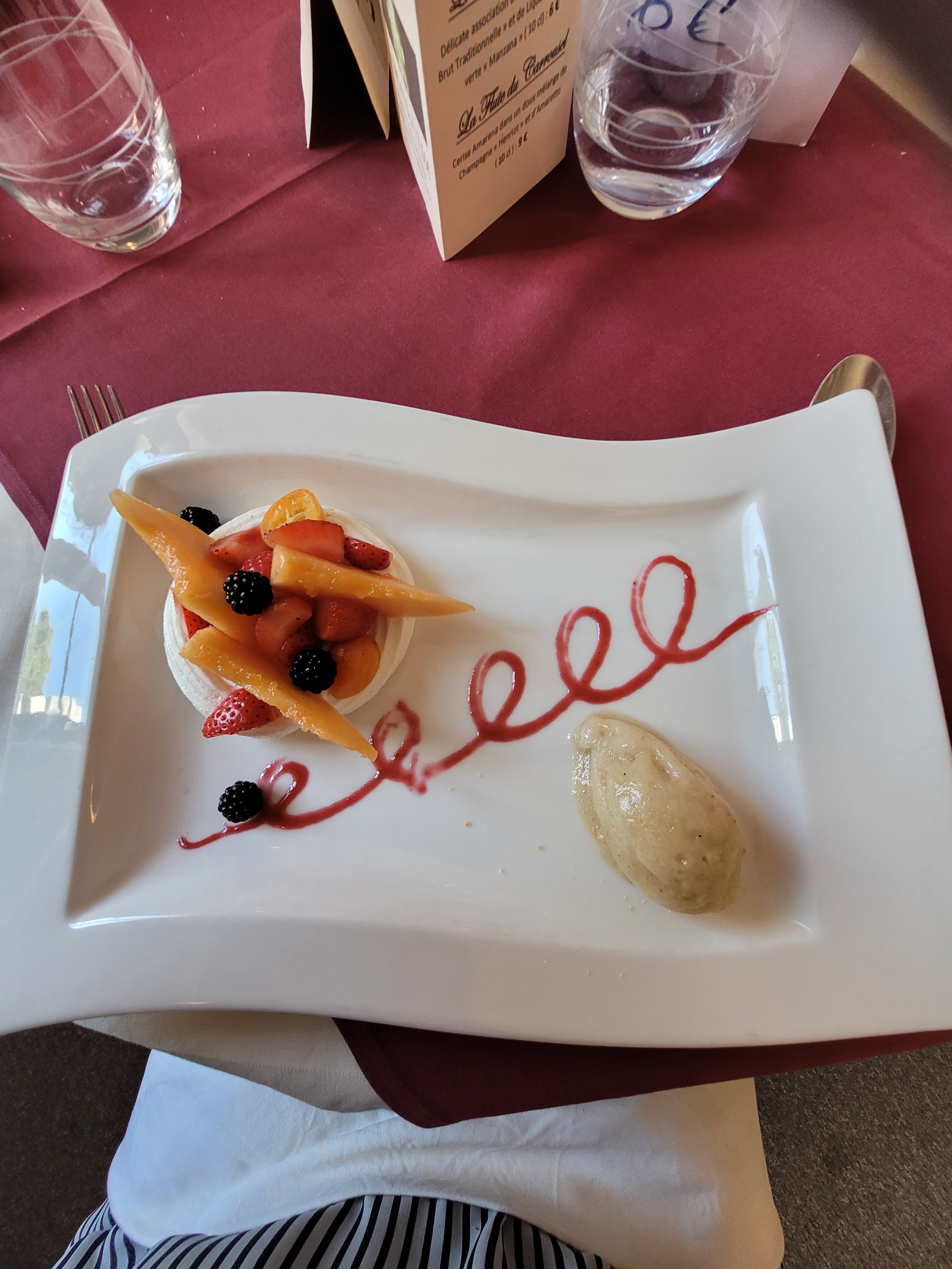 Nous nous sommes arrêtés un peu pae hasard sur la route des vacances et avons pris le plat du jour. Étonnante formule servie de l'entrée au dessert sur une assiette plateau. Un vrai délice, du début à la fin : nous n'avons pas regretté notre choix !