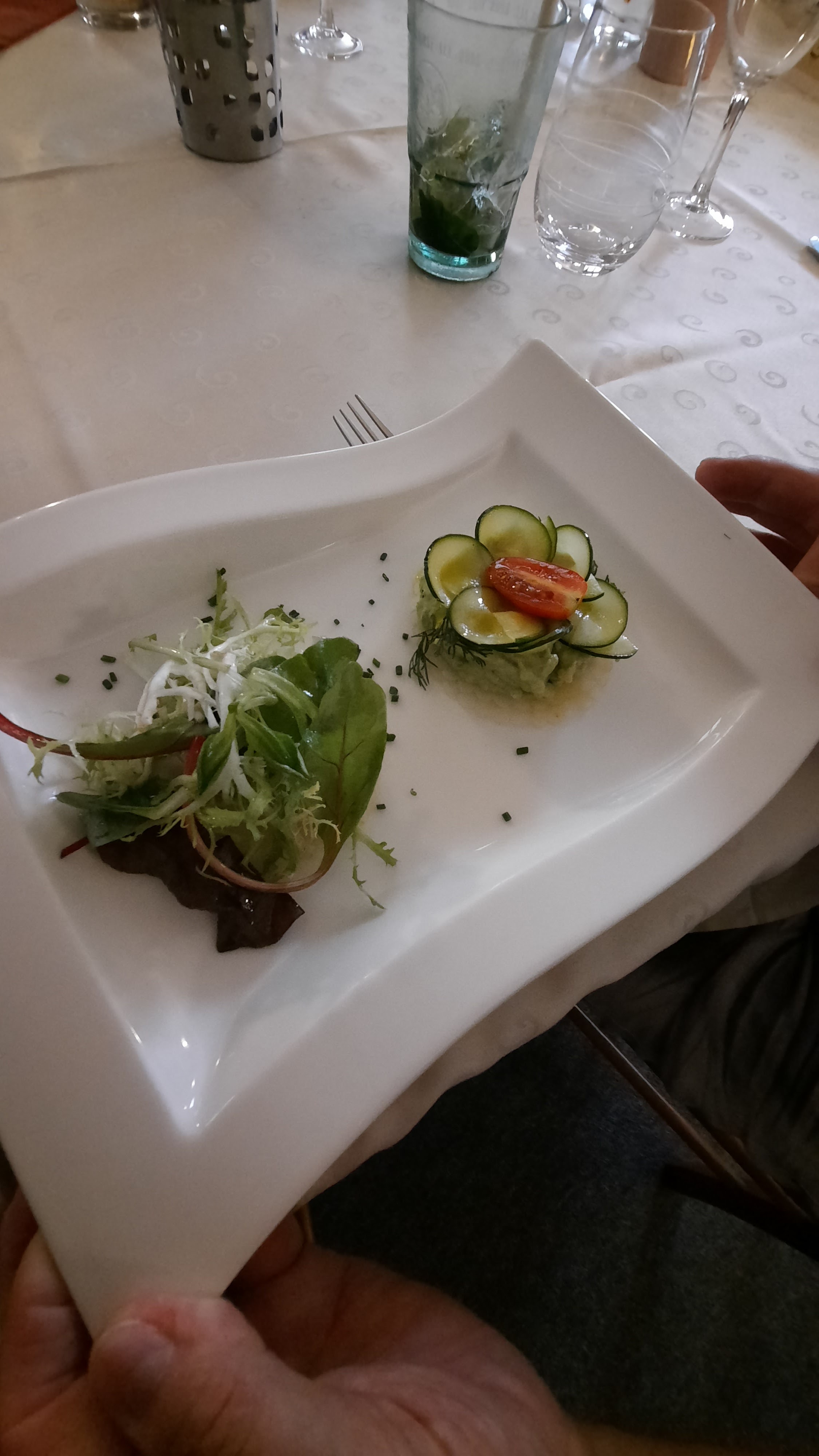Dans l attente d un moment de détente nous avons été embarqués par la patronne du restaurant sur le carrousel d'un service déplorable à la mitraillette. L ardoise à la porte de l établissement laissait présager un choix éclectique qui s est terminé par une entrée de la veille ( pour preuve la photo de la carte du jour précédent ) puisque qu il n y avait plus d œuf mollet disparu depuis notre choix proposé à la commande. Déçu après une expérience précédente réussie.