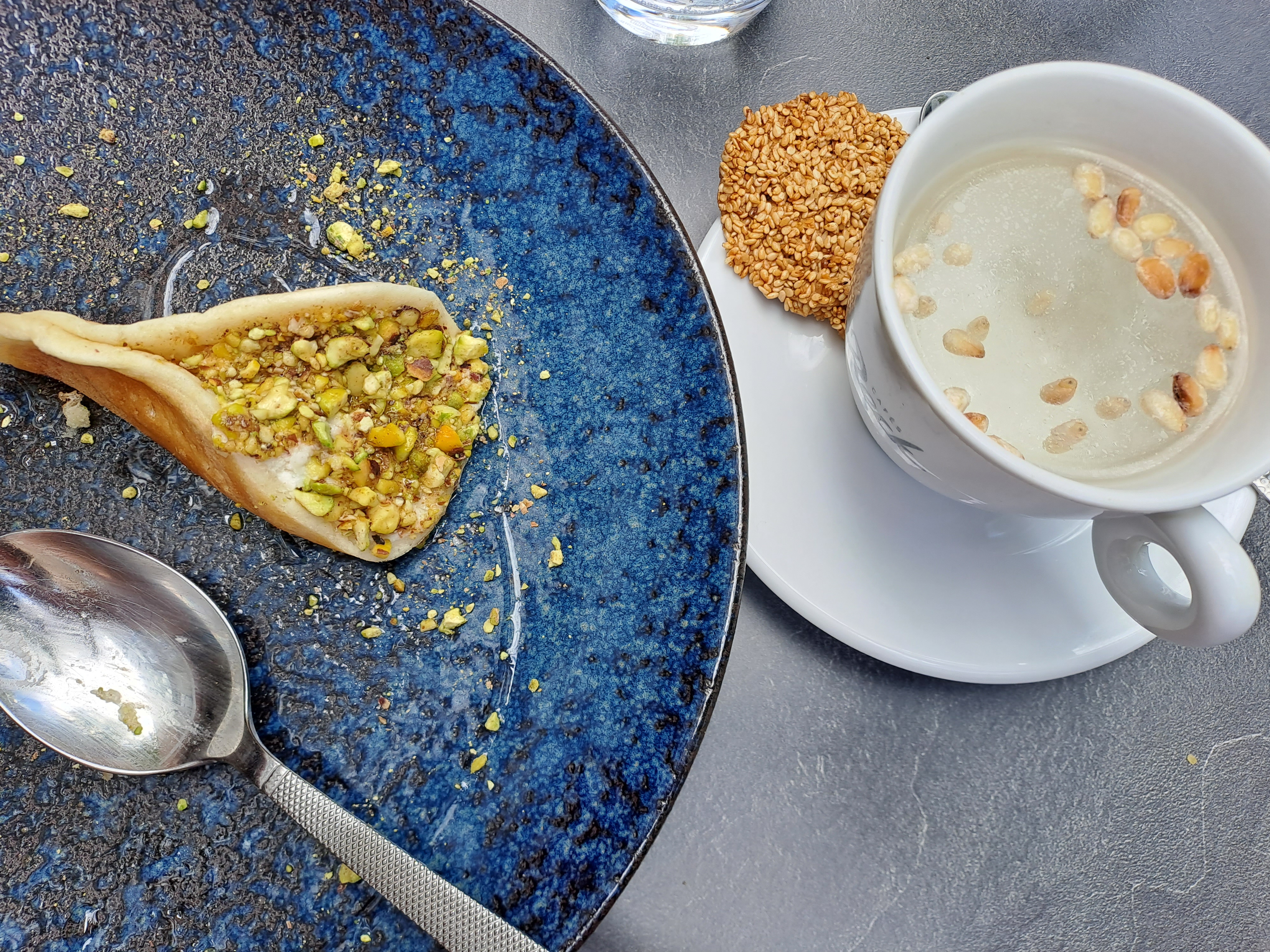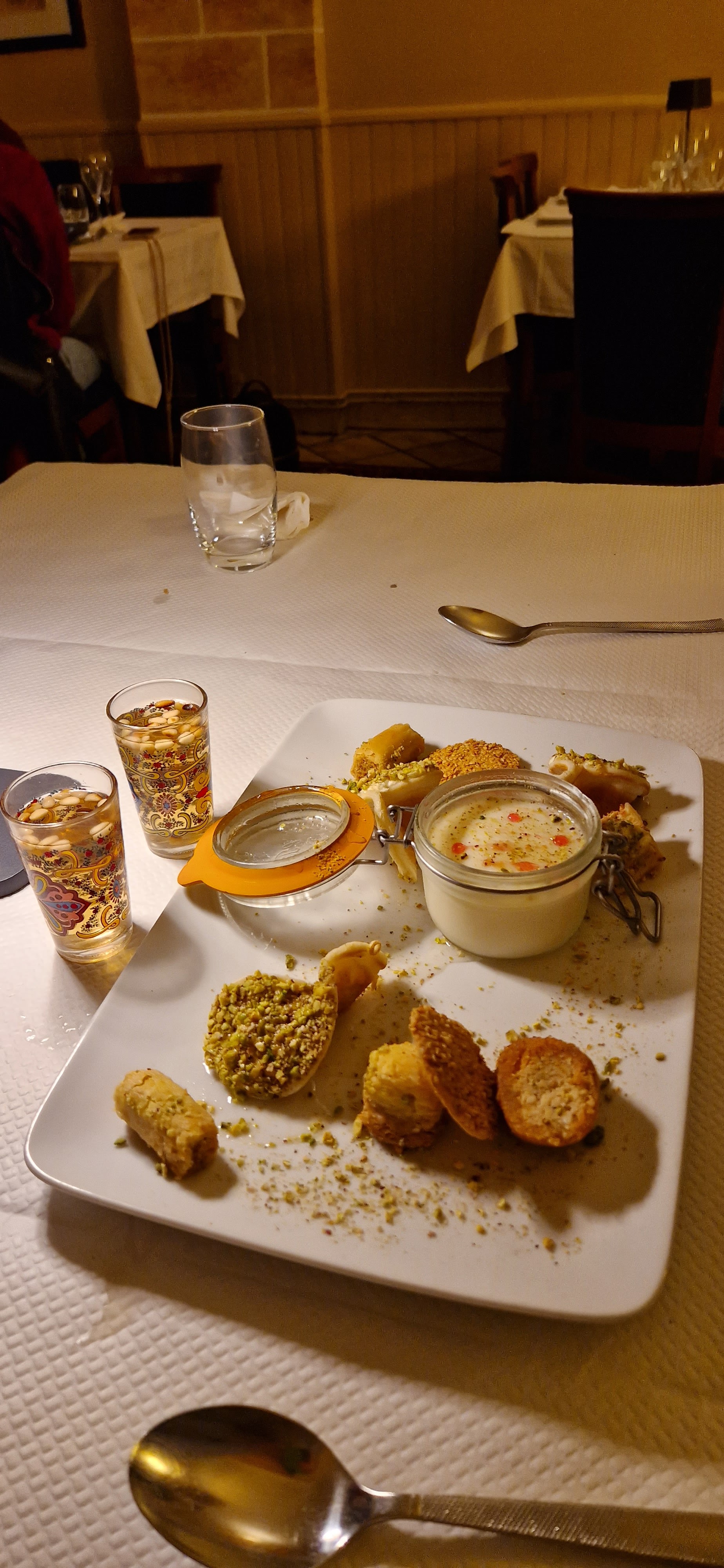 Bon repas globalement, les mezzes sont très bons! Bémol, arrivés à 13h, on nous demande de choisir vite nos plats car la cuisine ferme bientôt. Pour les desserts, carte reçue et une minute après nous devions déjà faire un choix. Le personnel est très gentil mais il faut peut-être revoir l’organisation… si la cuisine ferme à 13h30 ou 14h il serait judicieux de prévenir les clients lors de la réservation ou de fermer la cuisine un peu plus tard… Tout était très bon mais 155€ pour 4 (dont 22€ un plat vegan) je trouve l’addition un peu salé