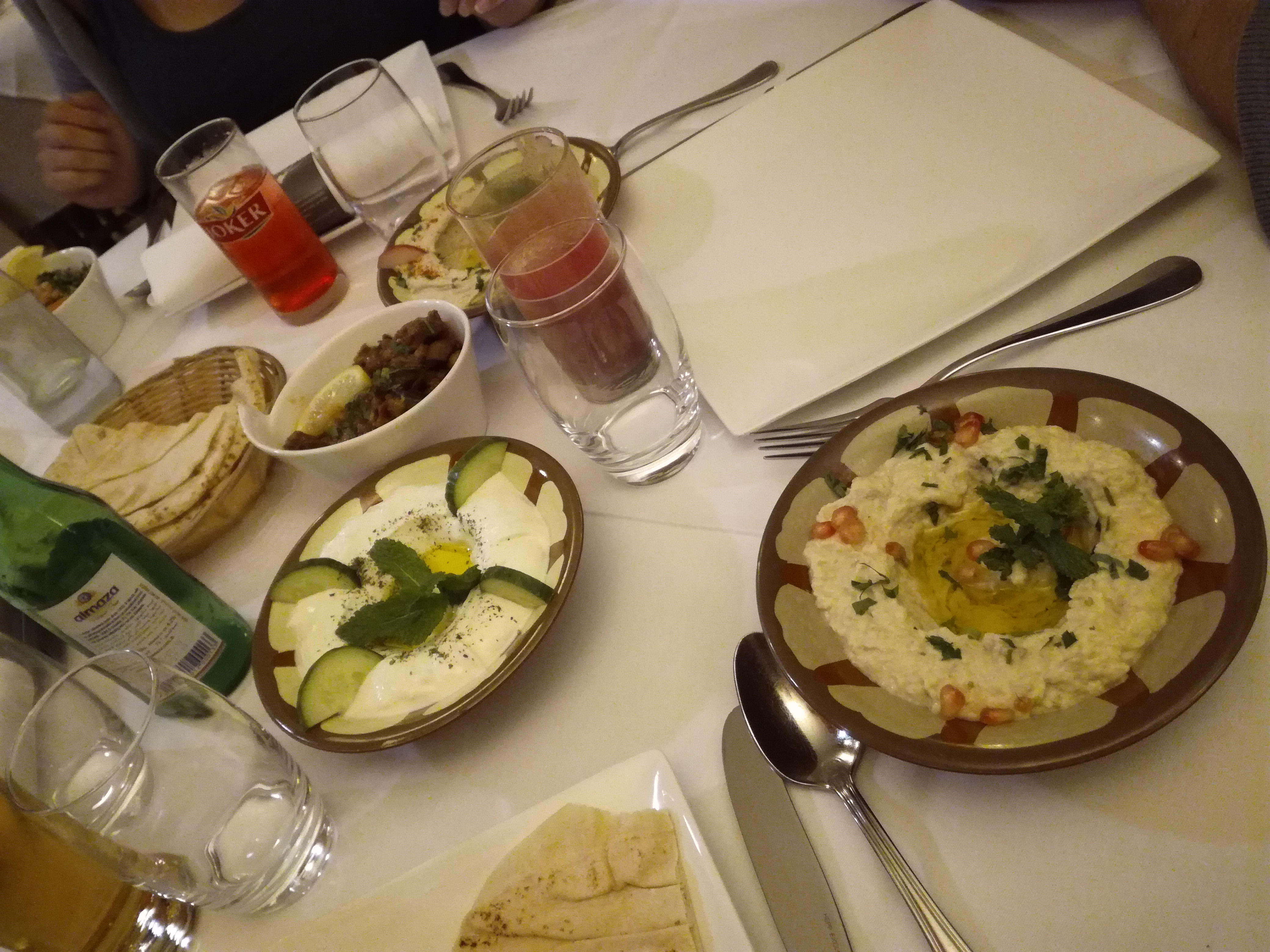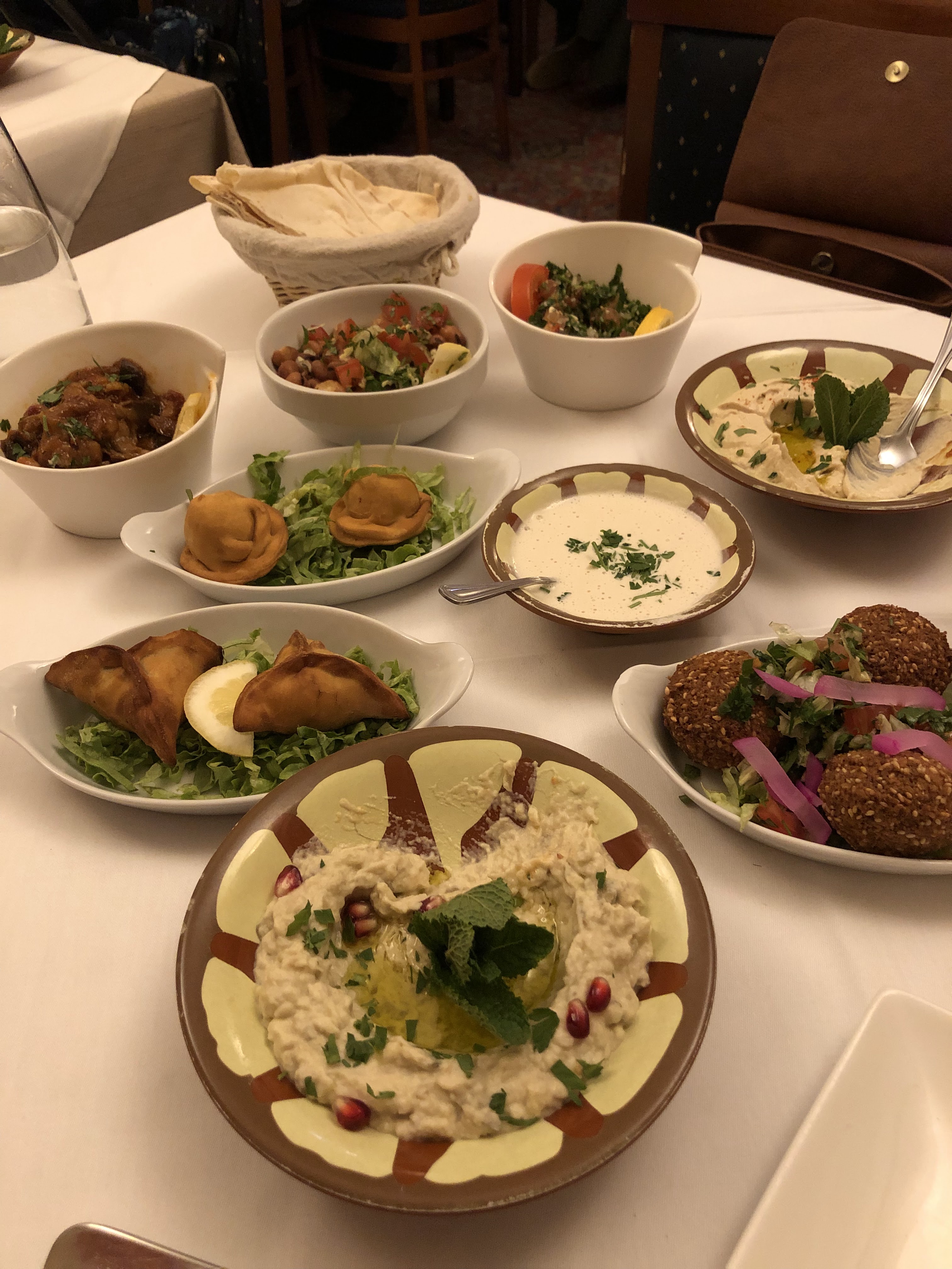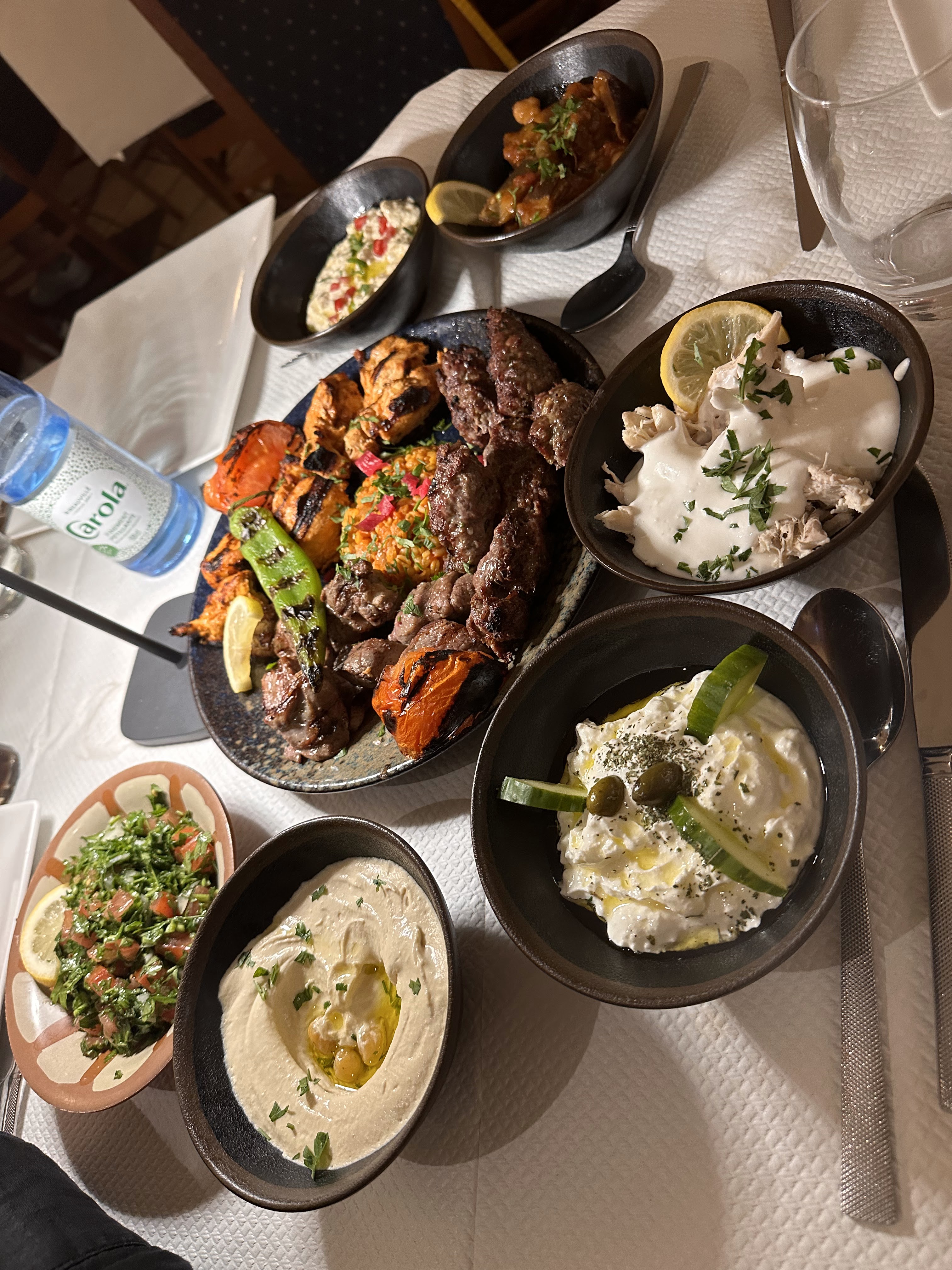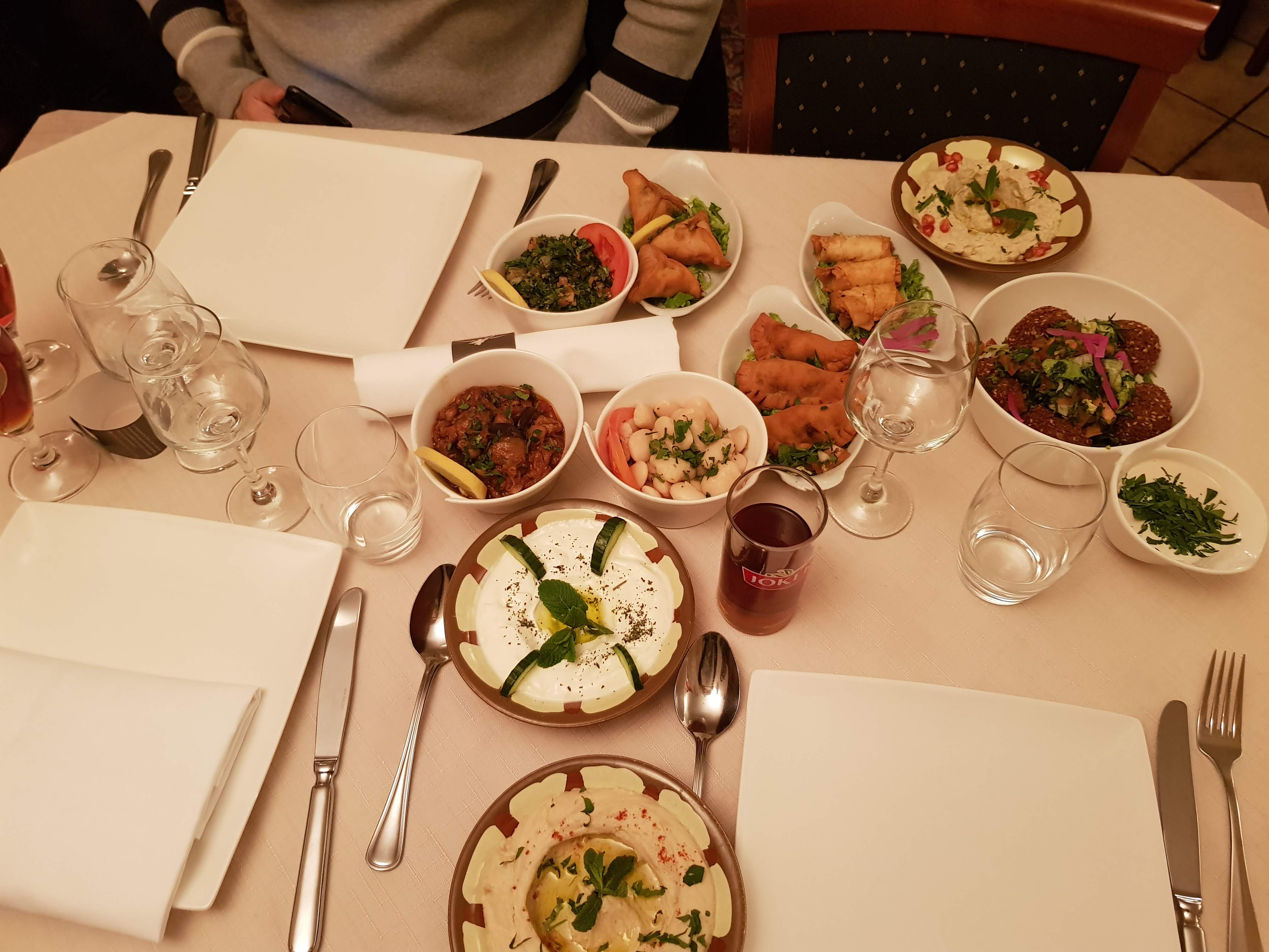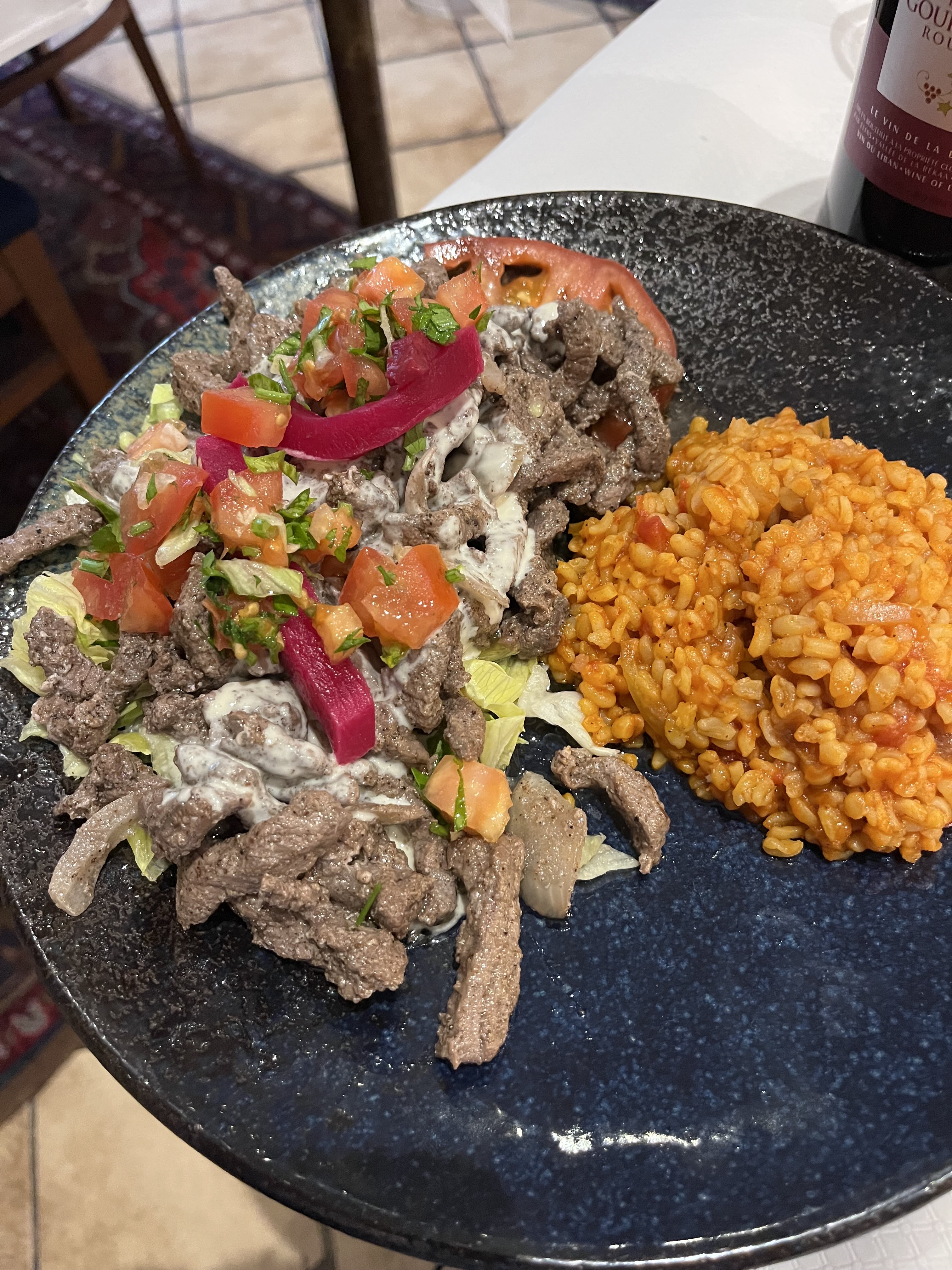 Un merveilleux repas libanais au Cedre au centre de Strasbourg avec quelques bons collègues. (Cela ne faisait pas de mal que l’un soit libanais et l’autre marocain.) Le service, la nourriture et l'ambiance étaient parfaits. Délicieuses viandes grillées et mezze. Kibbeh, feuilles de vigne farcies, shawarma de poulet et bœuf, agneau, houmous, salade de taboulé. C’était le meilleur repas du Moyen-Orient que j’ai mangé depuis mon départ du Golfe. Un gros plus sont les vins du Liban, qui, je pense, sont à la hauteur de tous.