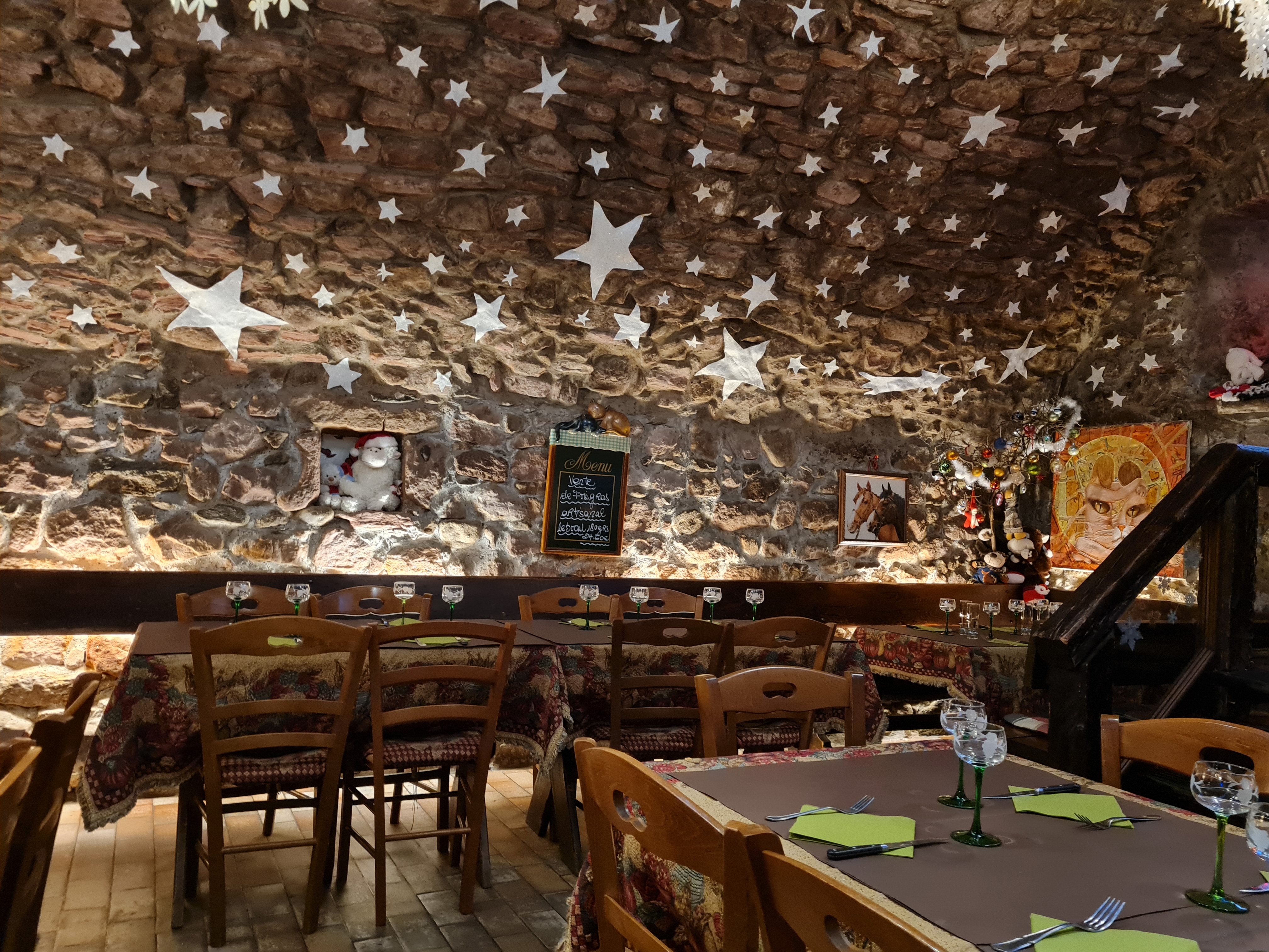 Nous avons trouvé ce lieu très chaleureux ou nous avons gouté aux crêpes accompagnées d'un chocolat au lait dans une faïence très raffinée sur une nappe superbe dans une salle voutée de pierres décorée d'objets authentiques et aux couleurs de Noel.