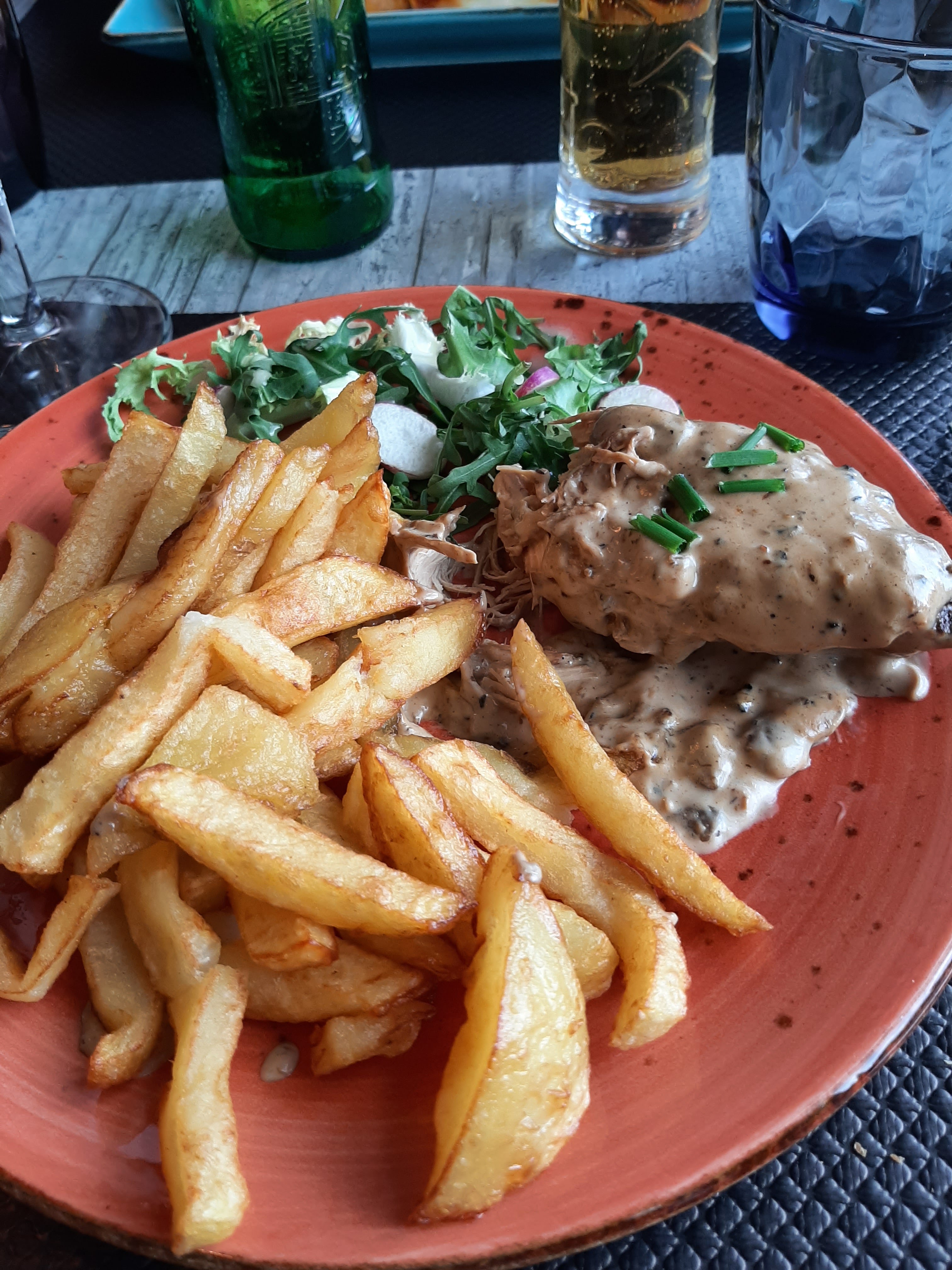 Excellent poulet au maroilles et très bonnes frites bien croustillantes et juste 9,90€ 😋😁