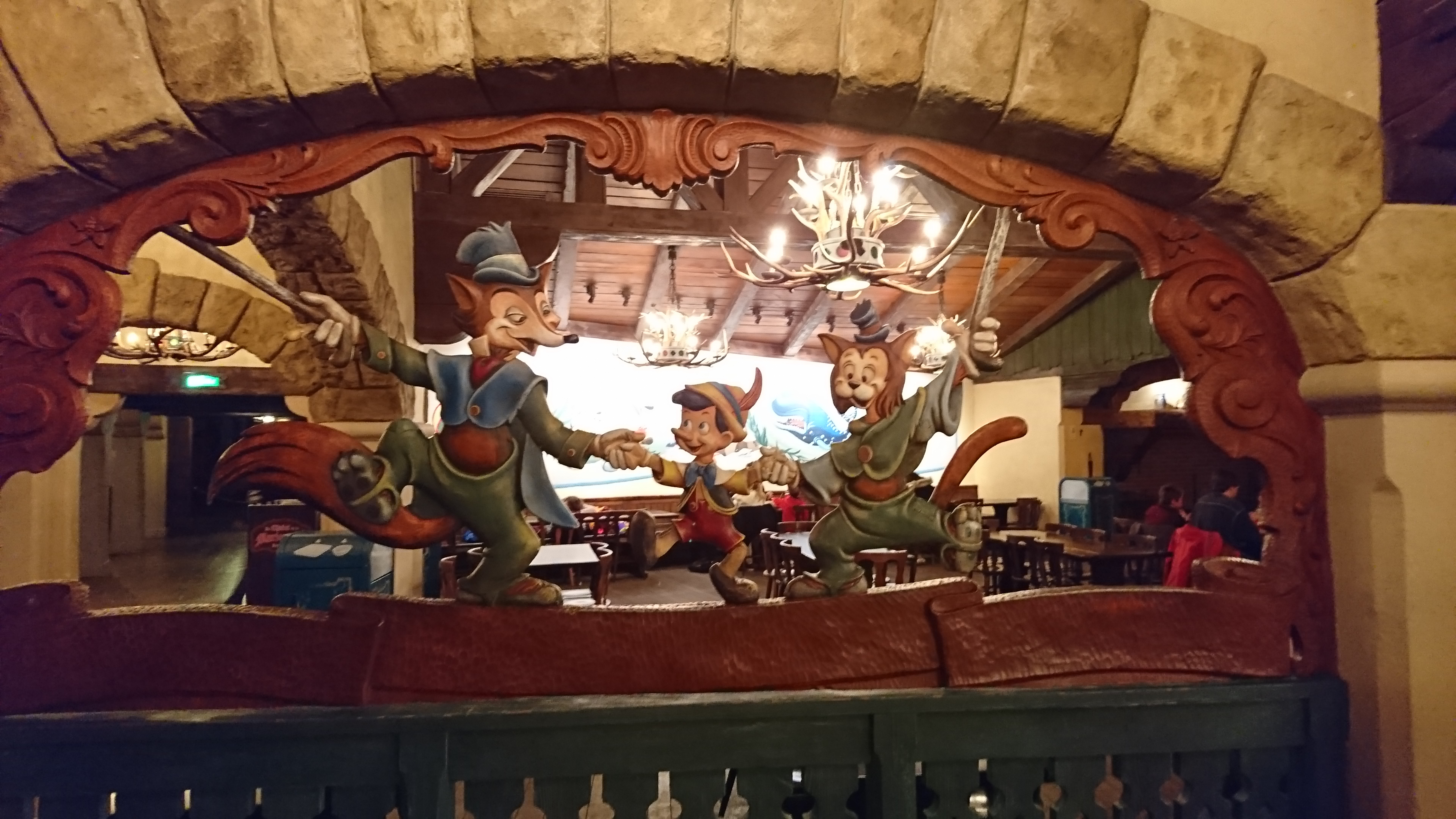 Un restaurant style fast-food à la Disney. Le décor est dans l'esprit de Pinocchio. La nourriture est correcte pour le prix (en tenant compte d'où l'on est). J'ai prix un jarreton frite choucroute, il est copieux et se laisse manger sans déplaisir, même s'il est un peu cher.