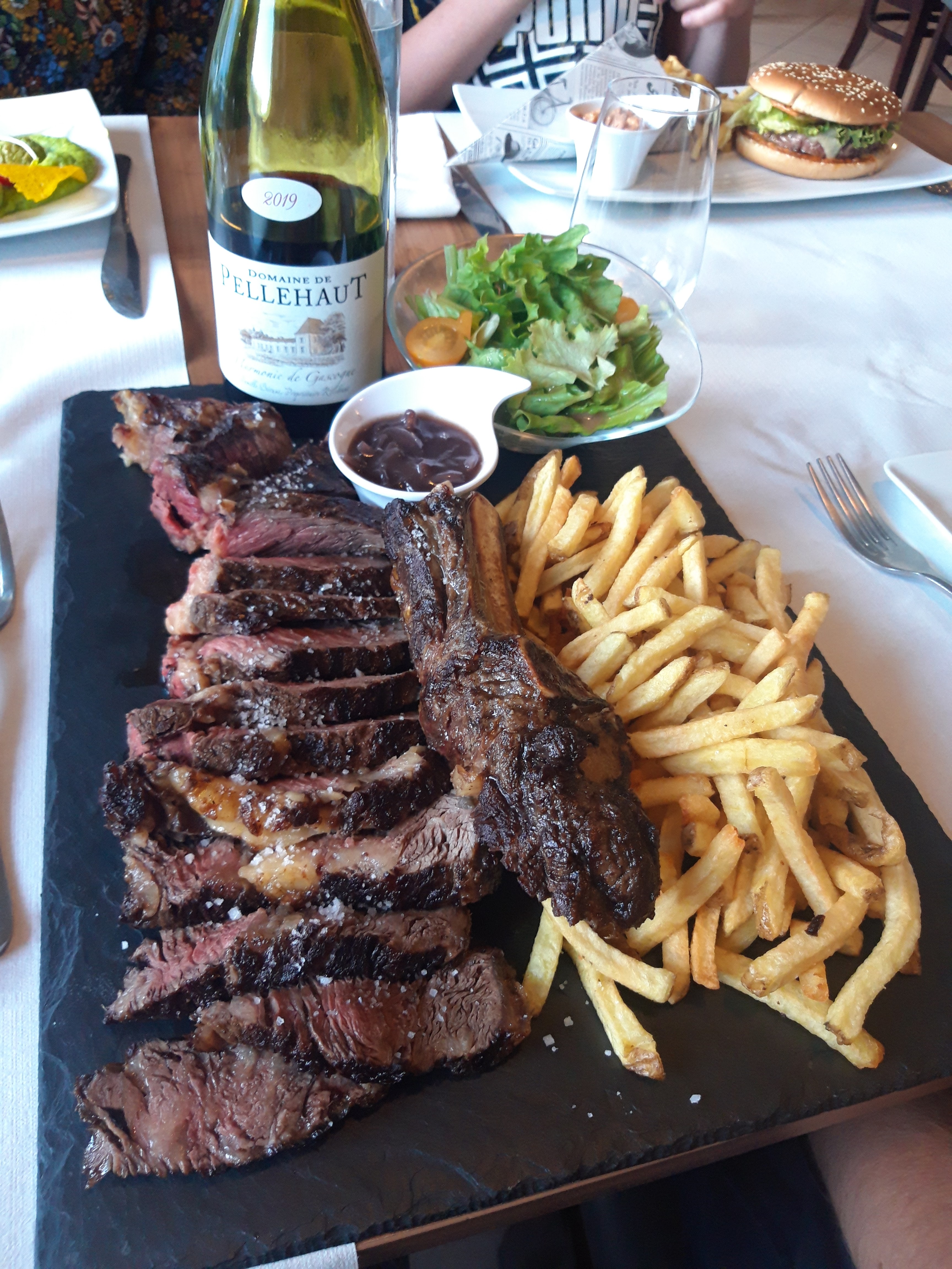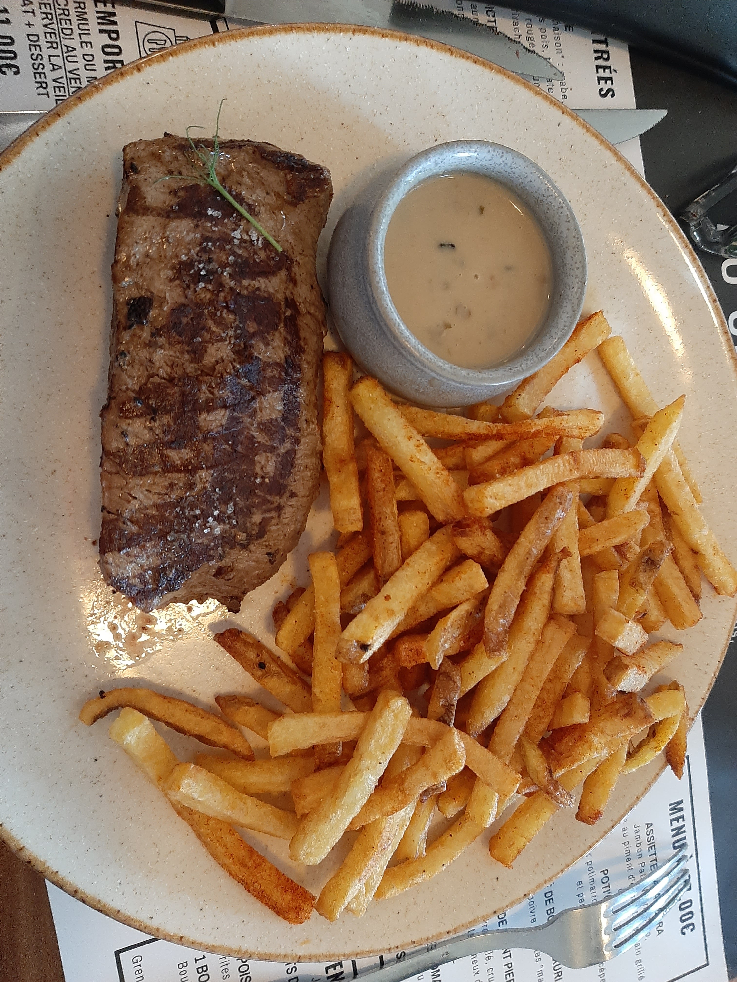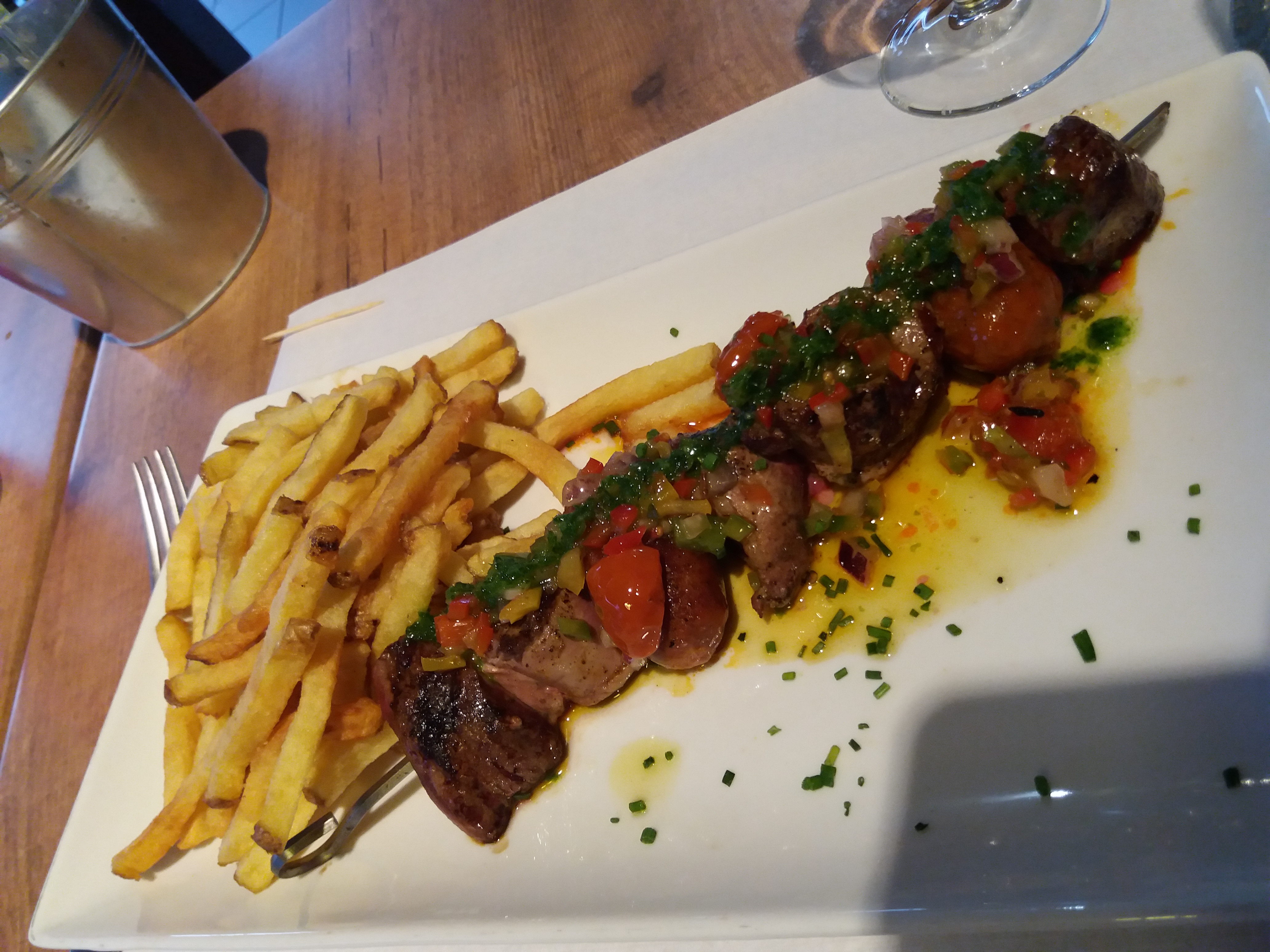 alors-là franchement j’ai été joyeusement surprise, moi qui suis très difficile sur la nourriture, j’ai pris un magret, il y avait une sauce que je ne connaissais pas : sauce du patxaran, et ben c’était excellent, le meilleur magret que j’ai mangé. tendre, cuit à la perfection, coupé en fine tranche, parfait !! frites fait maison excellente un peu épissé au piment d’espelette, mais c’était très léger ça ne piquer pas. churros excellent aussi, on sent la différence avec ceux des fêtes foraines, toutes les sauces des autres plats étaient délicieuses, purée aussi fait maison. de plus, service très agréable, personnel tous sympathiques, souriants…etc, je recommande vraiment !!