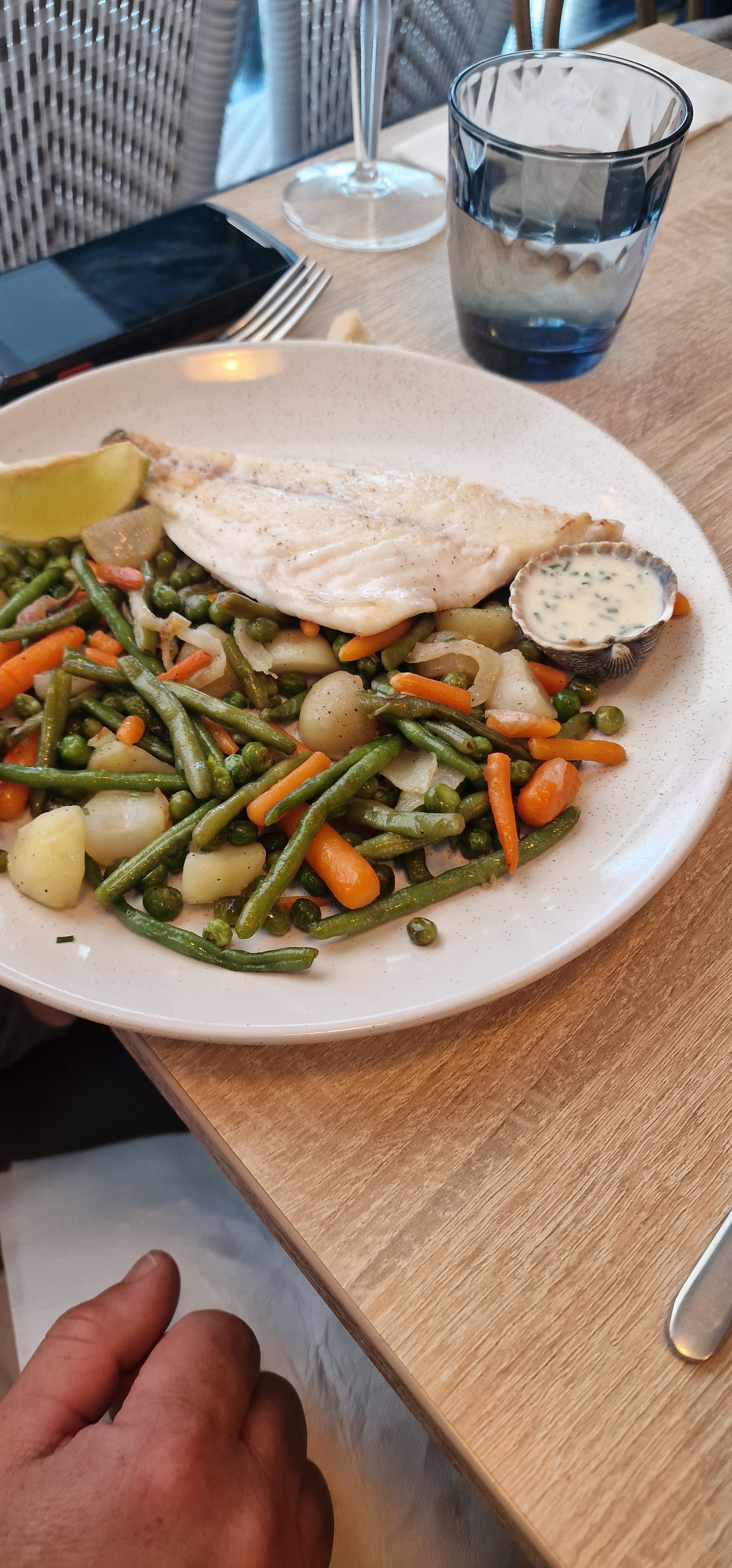Pour nous 1 première au cheval blanc la daurade avec petit légumes, avec des légumes frais cela aurait été meilleur (Dommage) Autrement personnel souriant et attentif