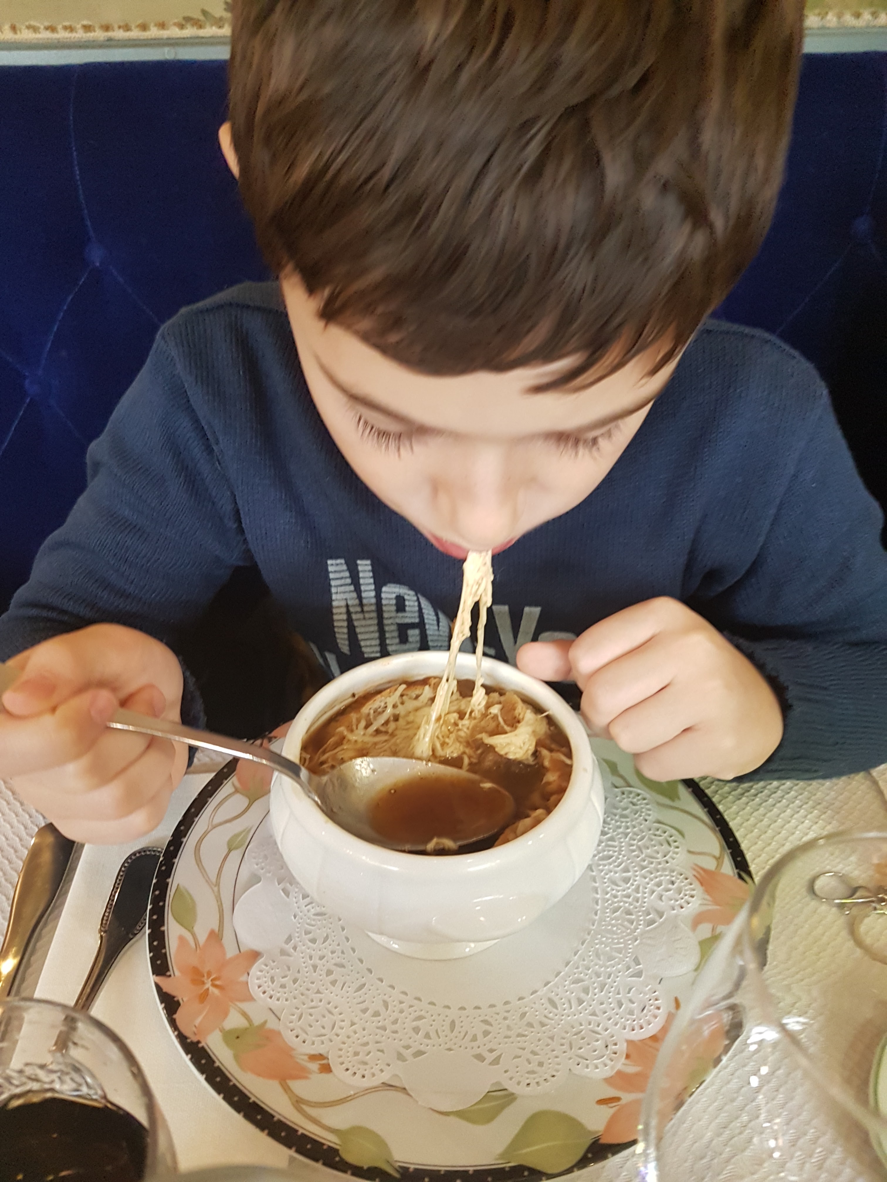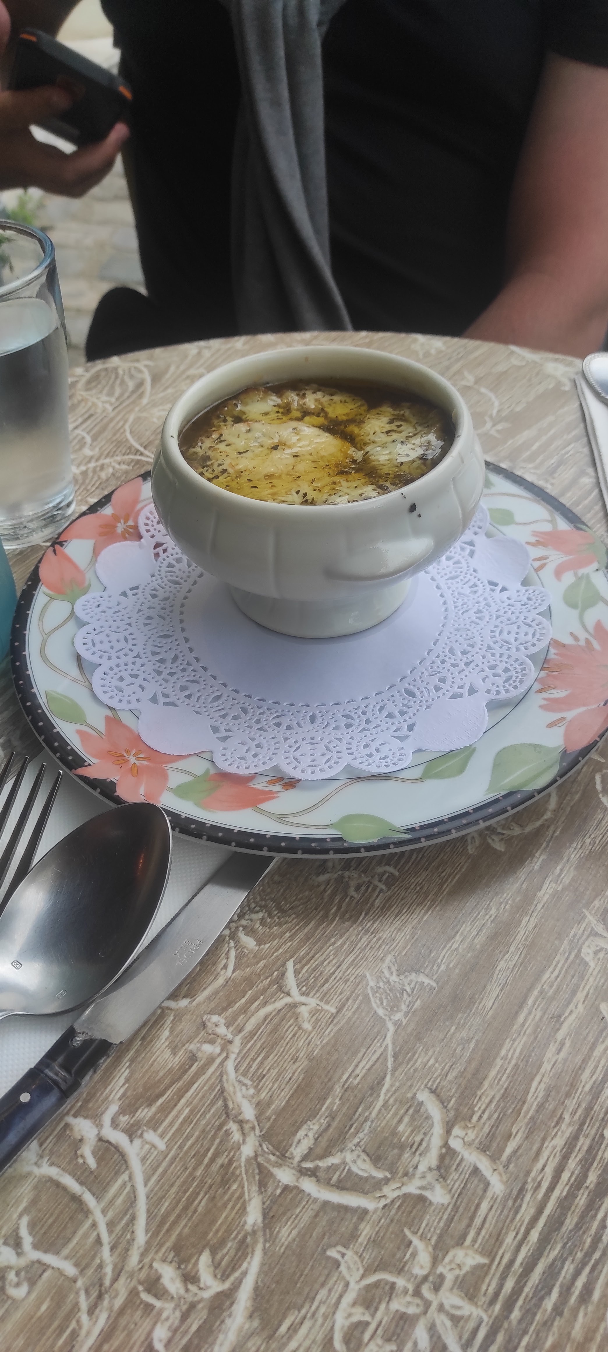 Soupe à l'oignon très chaude... à m'en brûler le Palais ... Sinon très bonne et le reste du repas aussi