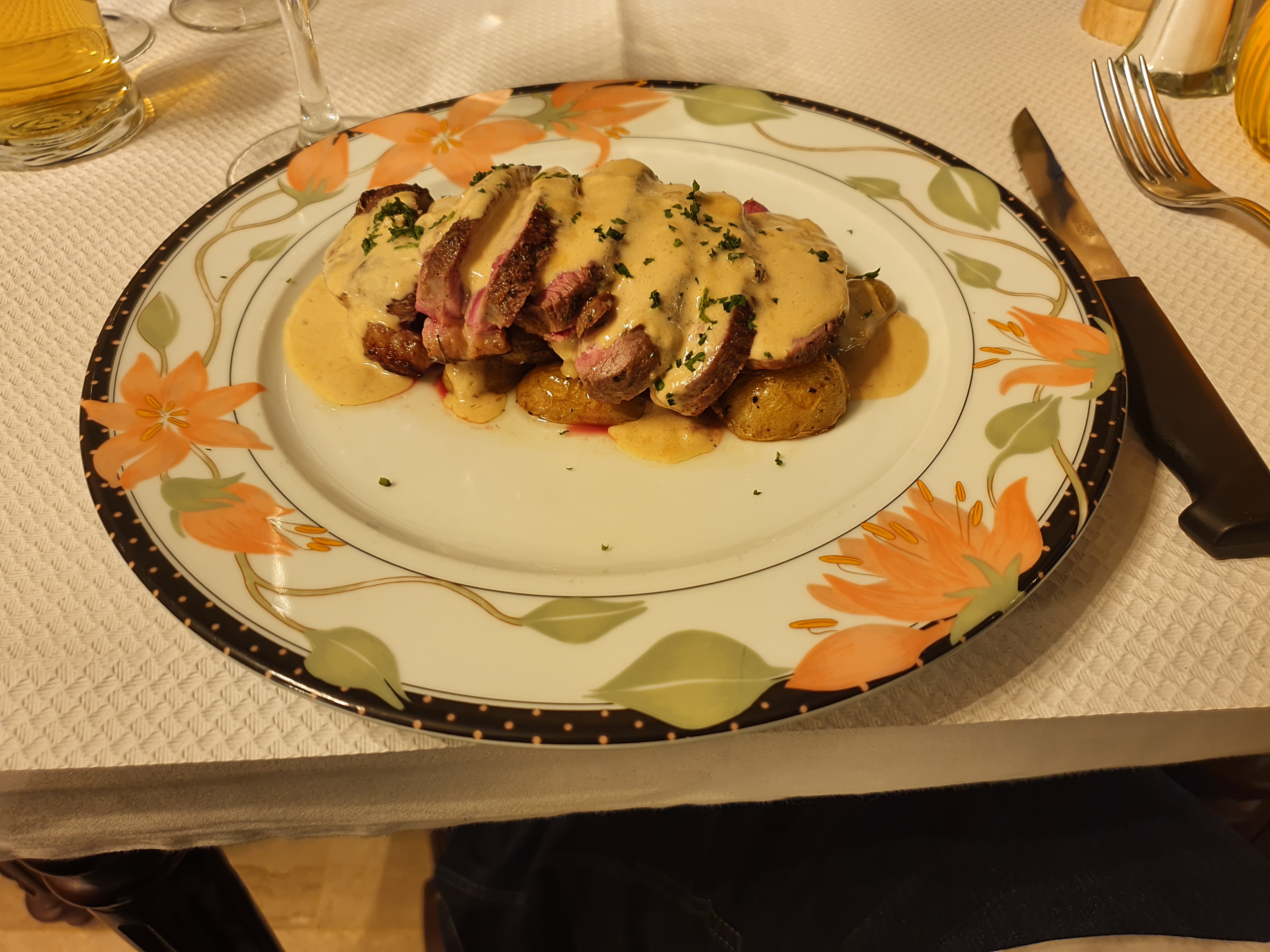 Ce n’est pas ainsi qu’on sert un magret de canard. Doit être rose, pas gris. Très triste. Apprenez en faisant - je n'ai pas trouvé de table dans le restaurant recommandé à proximité et j'ai essayé cela. Non recommandé 😏