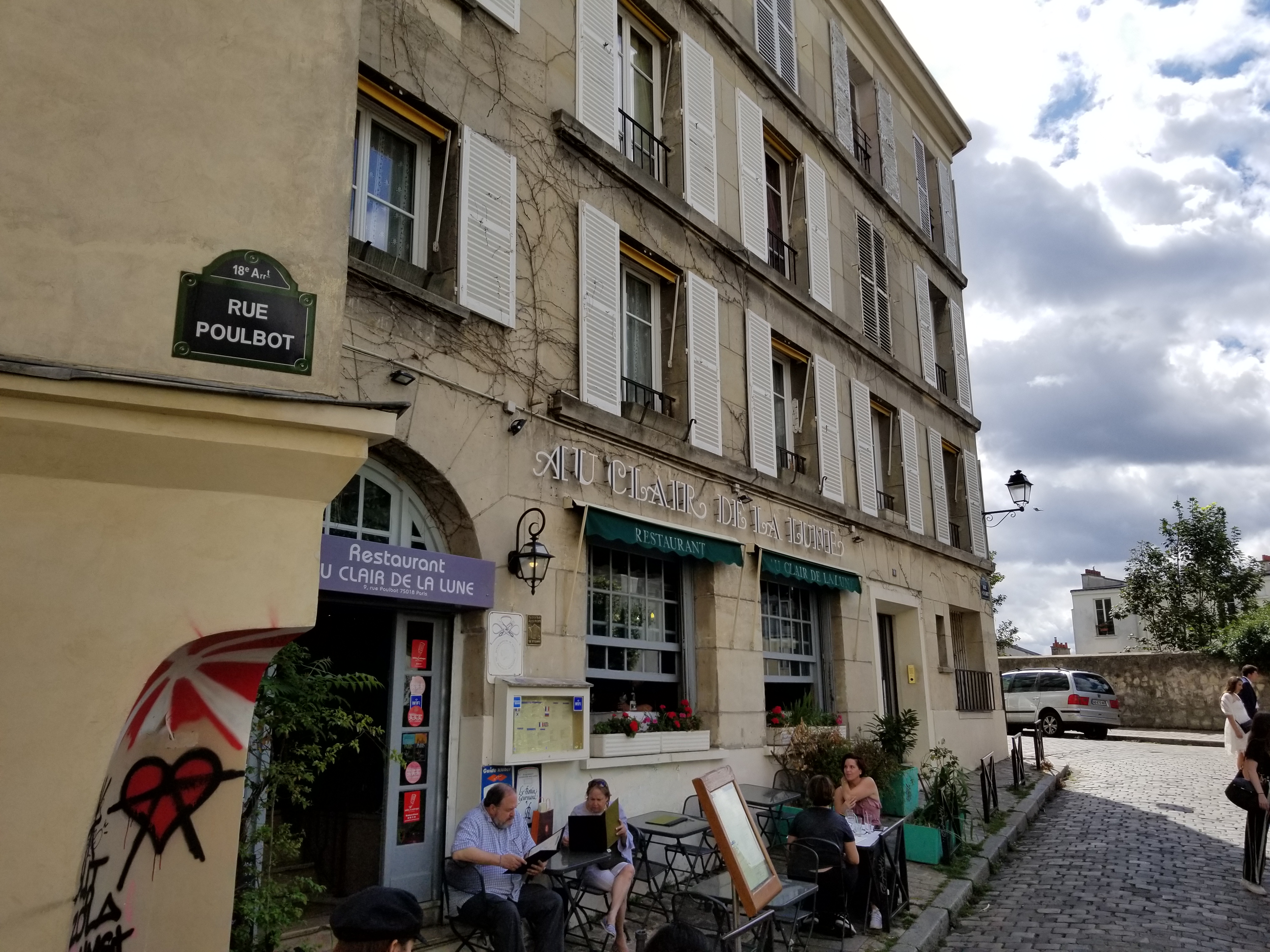 MERVEILLEUX RESTAURANT AVEC UNE BELLE VUE DE LA RUE POULBOT. ON OFFRE UN SERVICE IMPECABLE UN SOUVENIR INOUBLIABLE DE NOTRE SÉJOUR A PARIS AU MOIS D´AOUT DERNIER. NOUS VOUS SALUONS MA FEMME ET MOI DE MONTEVIDEO/URUGUAY
