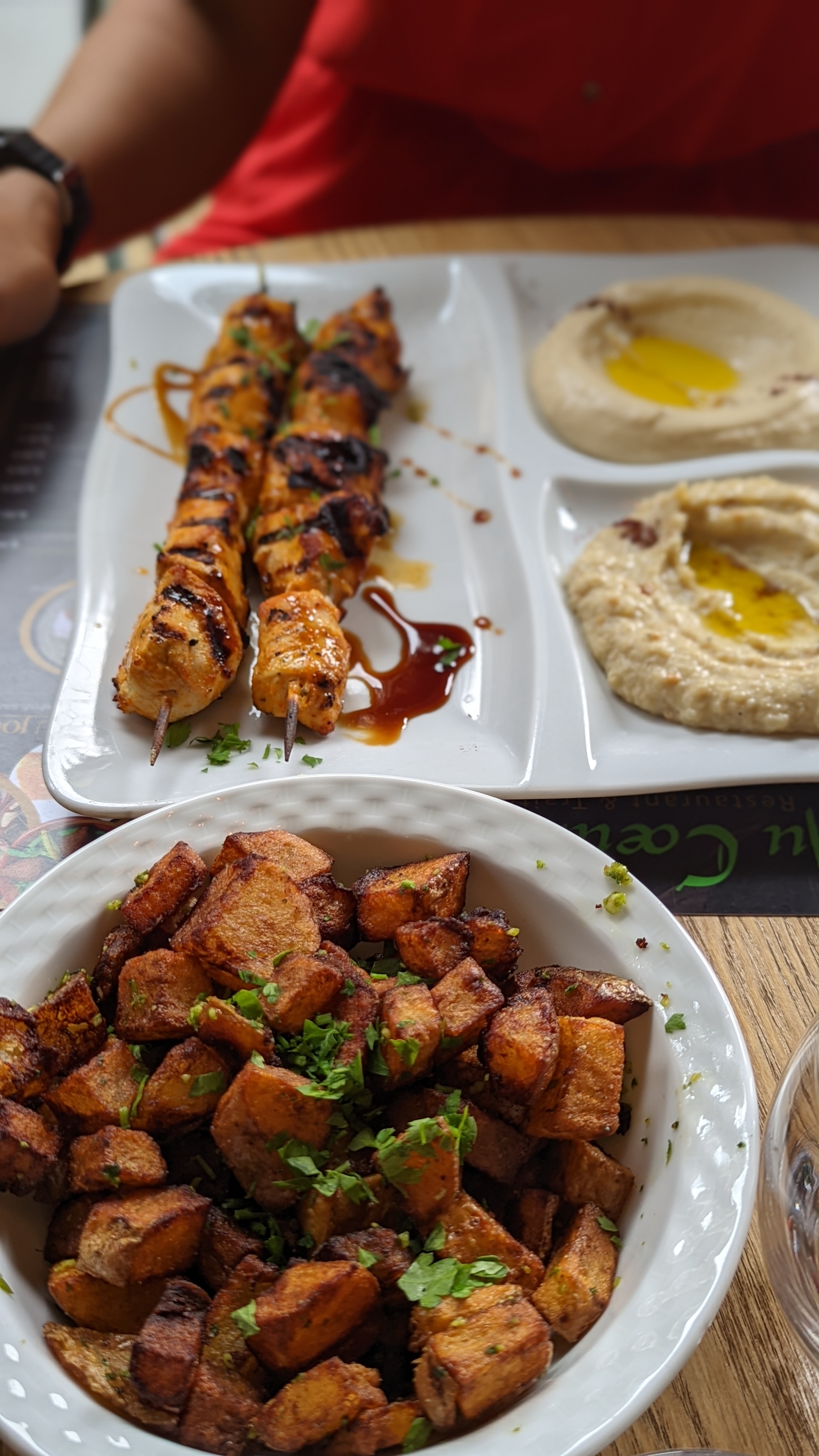 Nous avons mangé de nombreuses fois à Au Cœur du Liban, et c'est notre restaurant préféré à Metz. Aujourd'hui, nous avons partagé le taouk et la kafta comme plats principaux, accompagnés de fattouch, de houmous et de pommes de terre. Tout était absolument délicieux ! Le service était excellent, comme toujours. Nous reviendrons bientôt.