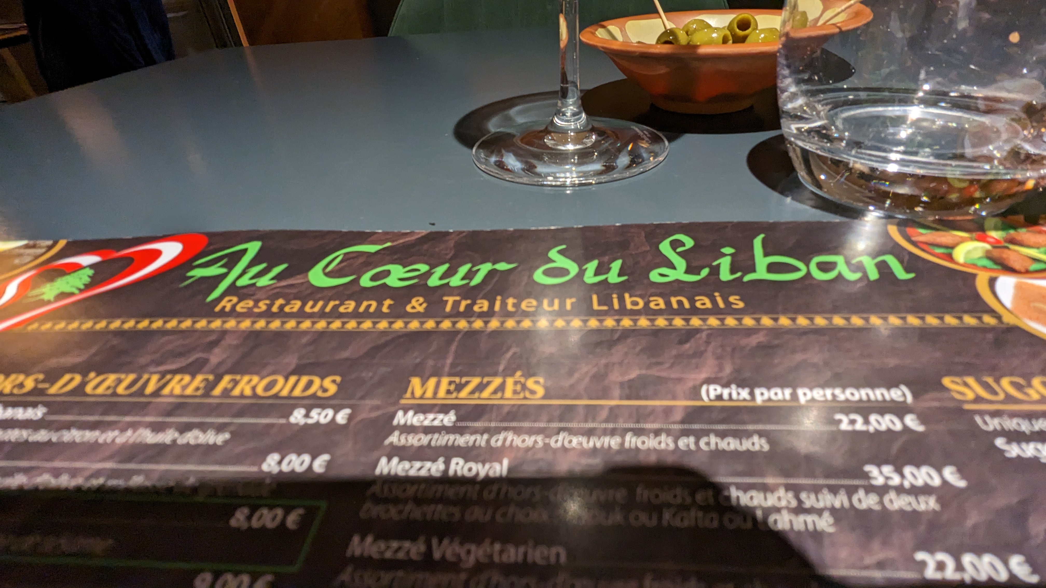 En plein cœur de l'hiver, entre Noël et jour de l'an ,histoire de faire un beau voyage culinaire pour enchanter les papilles et apaiser les âmes,on entre Au cœur du Liban et on est transporté. Tout y est parfait ,de l'accueil au service ,de la déco aux mets . Une très bonne adresse à Metz, allez y les yeux fermé...écoutez la douce musique...