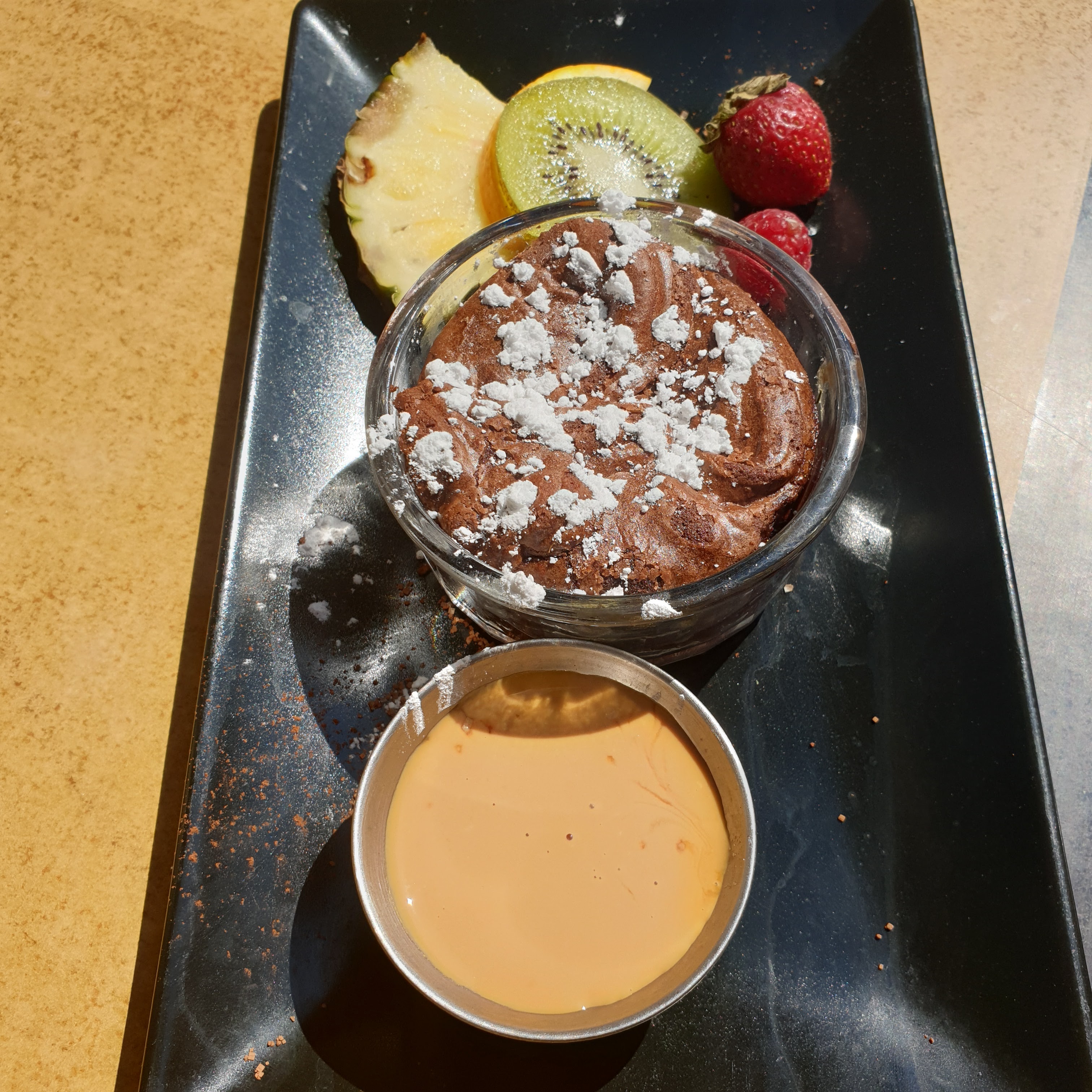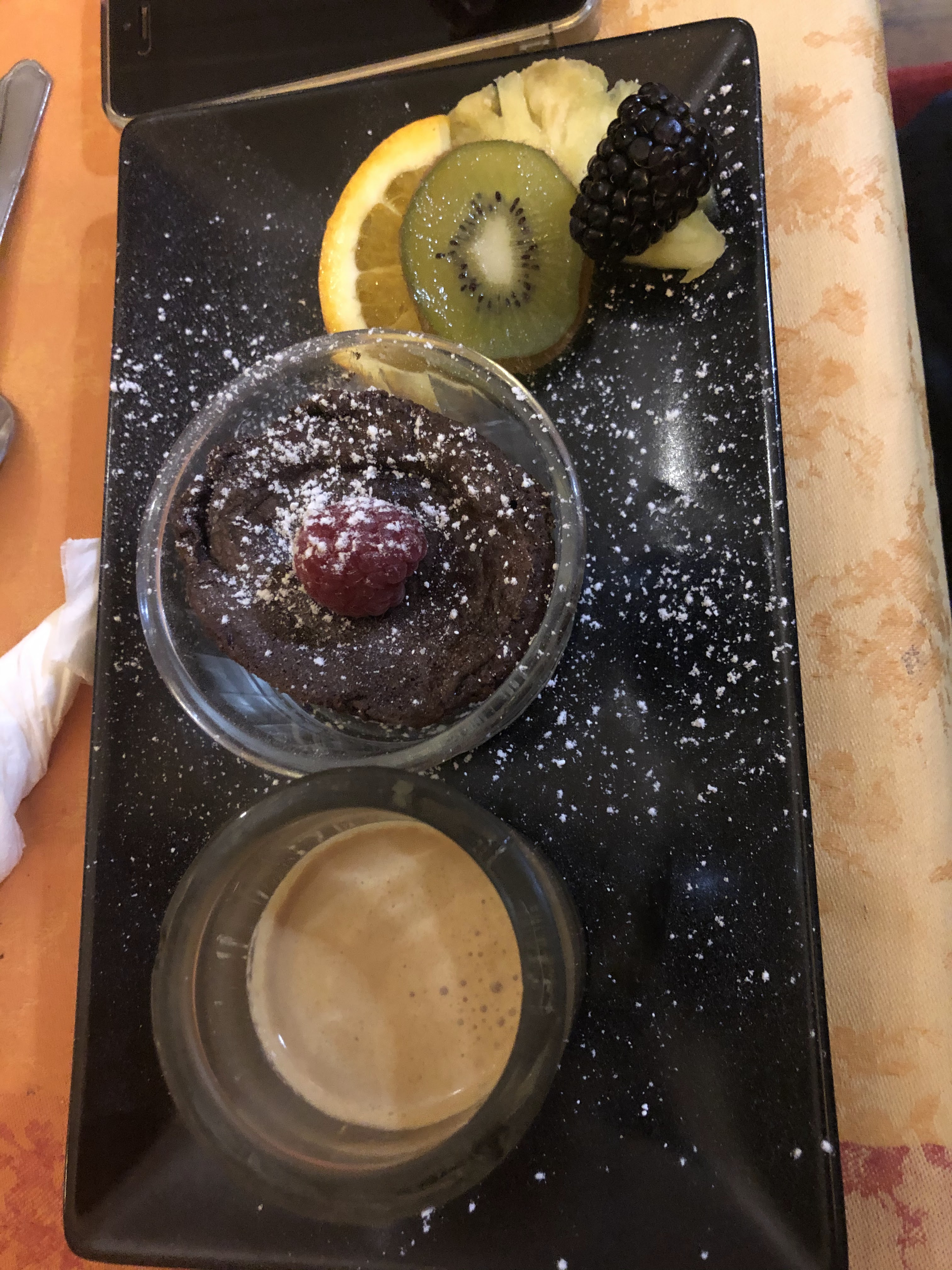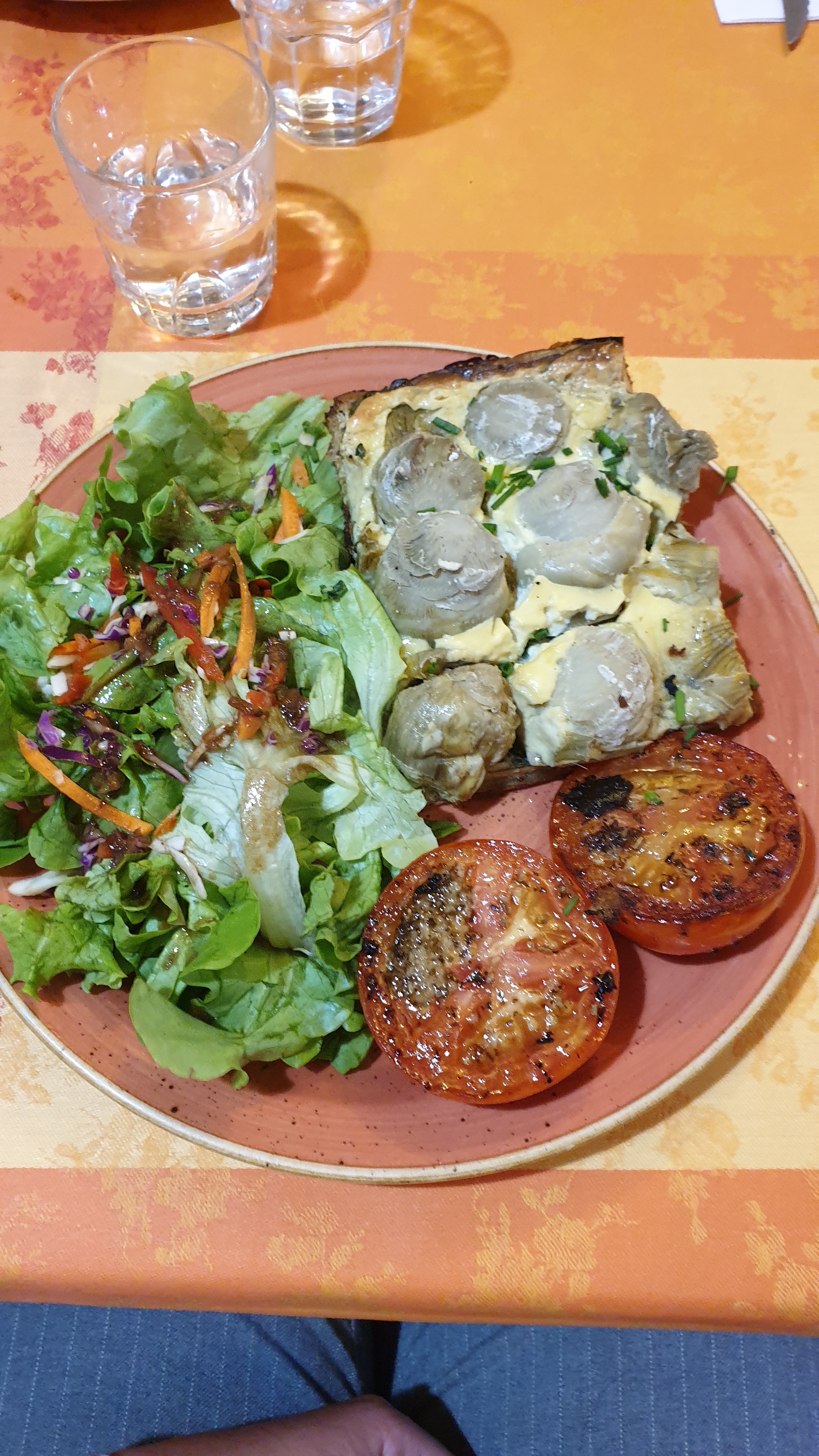 On a pris le menu du jour. L’entrée était bonne, déjà première déception du plat dont le gratin de courgettes était brûlé. Puis le dessert, n’en parlons pas, un clafoutis d’abricot complètement cramé (voir photo)… Grande déception.