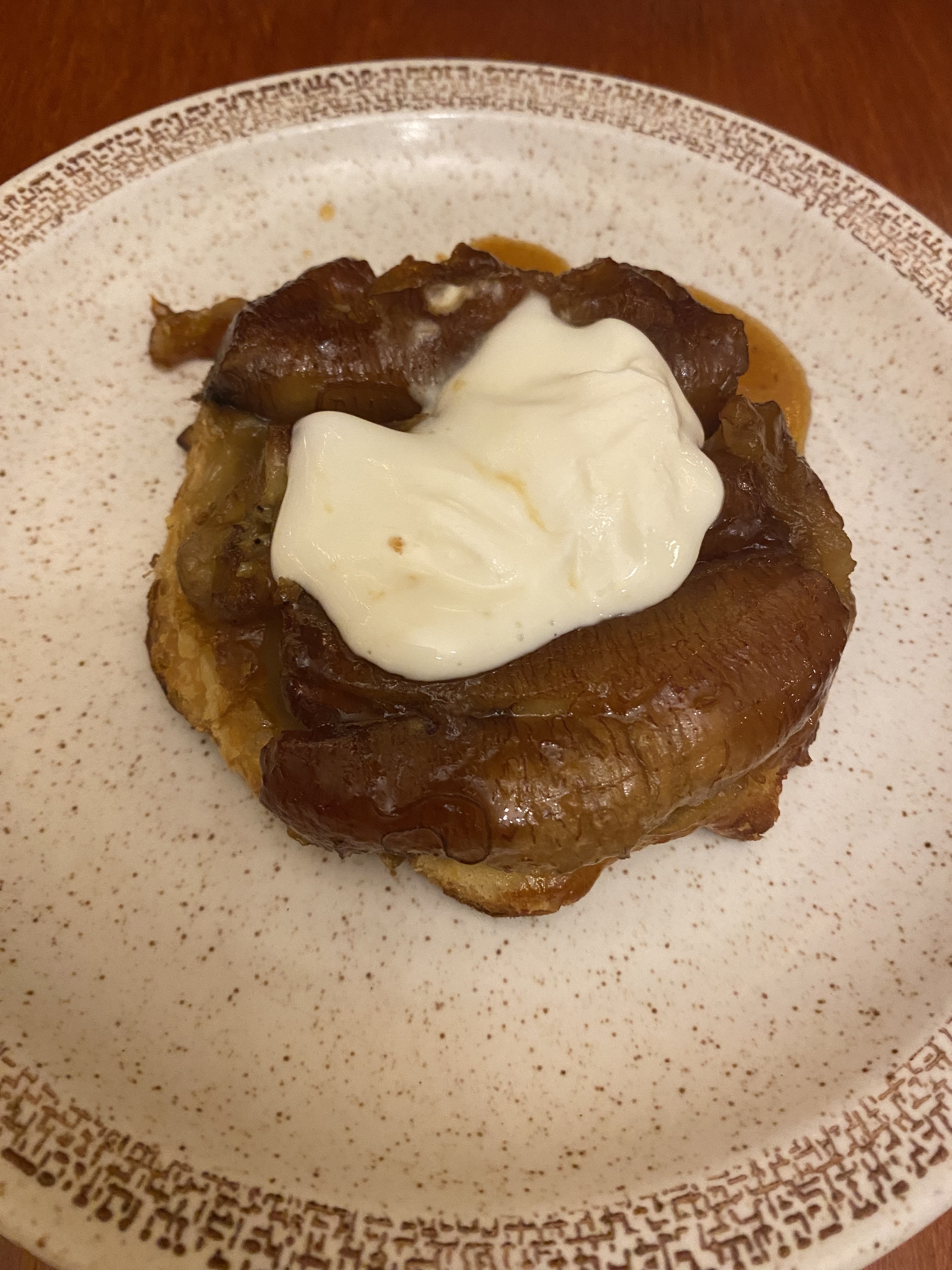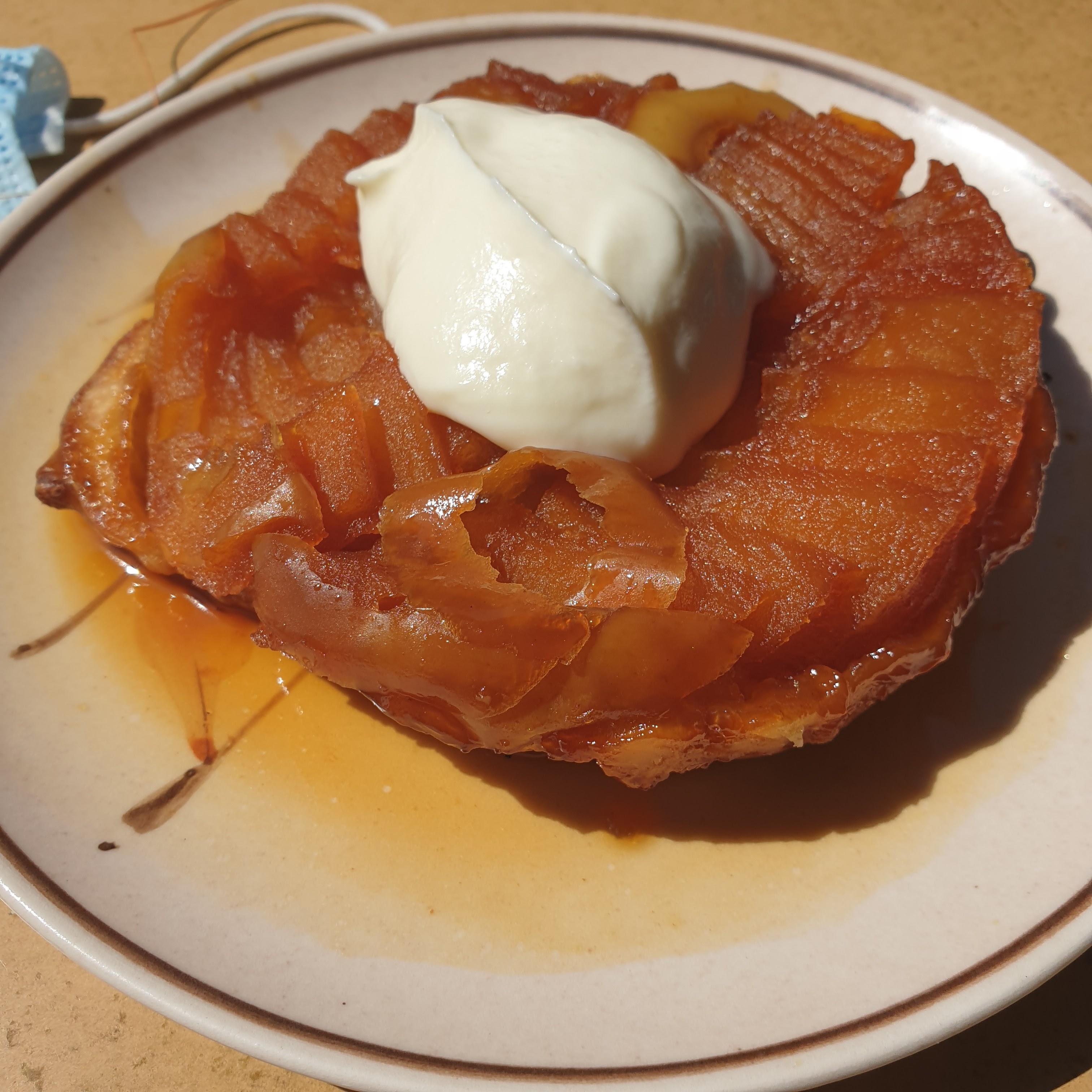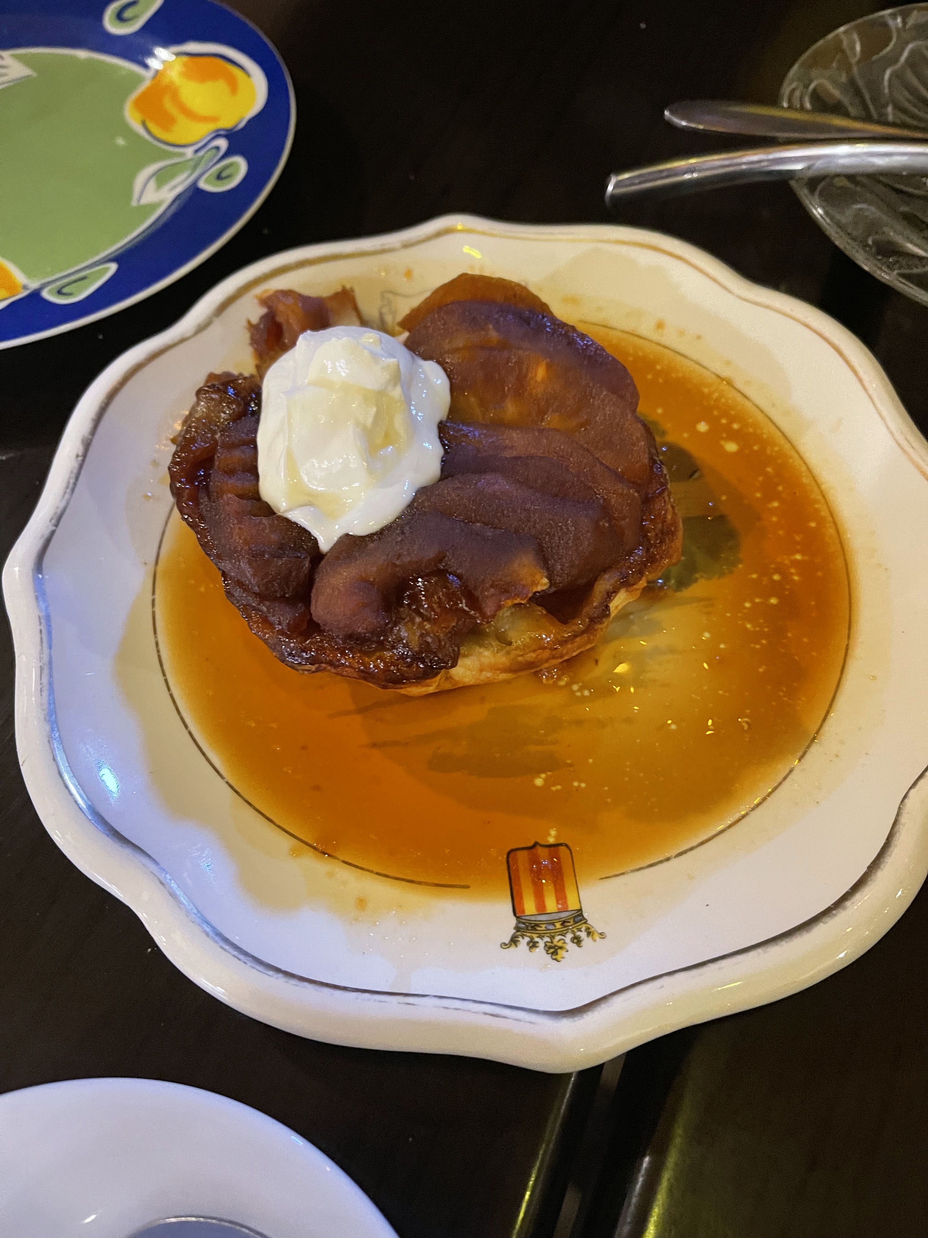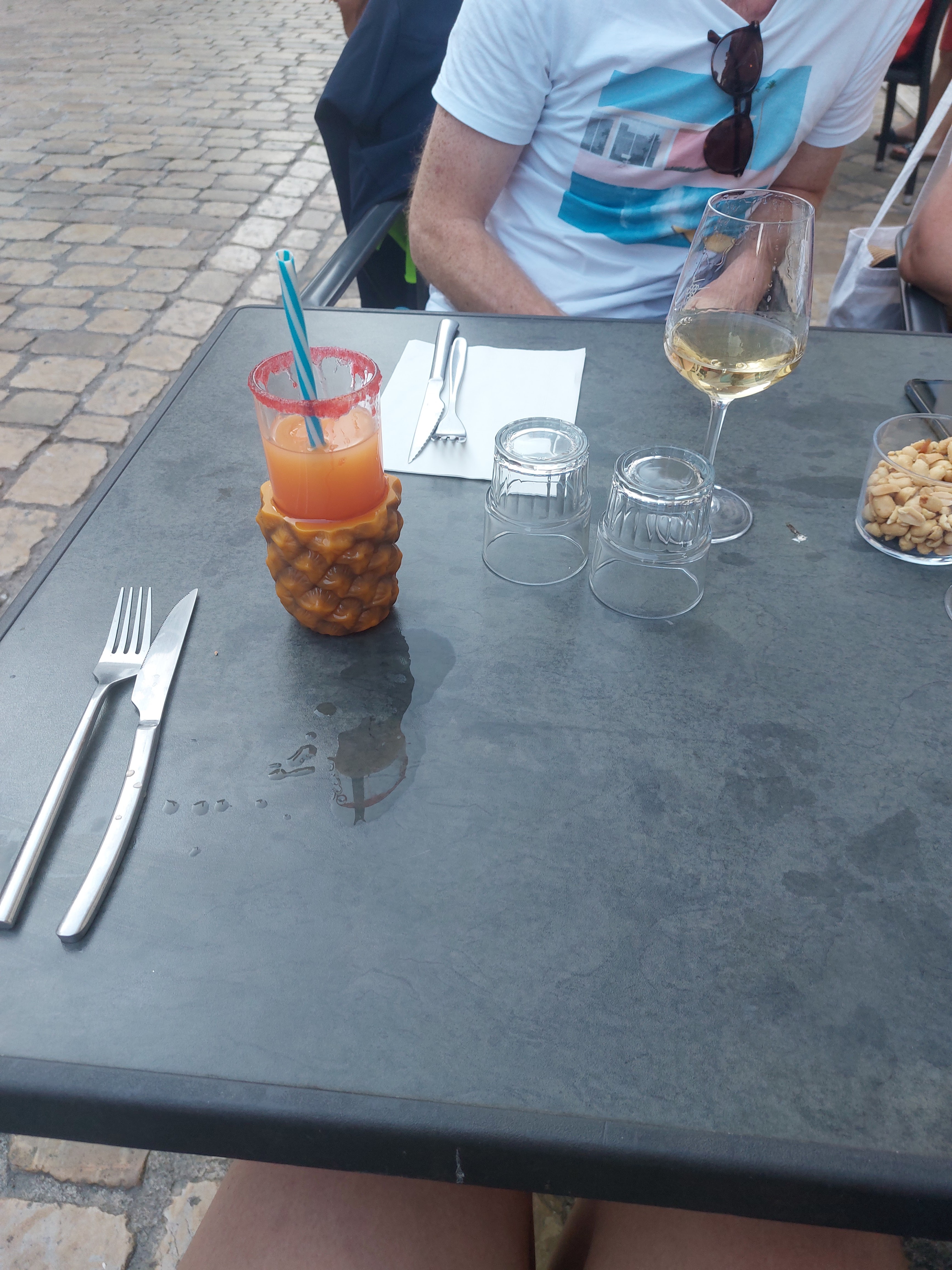 On a pris le menu du jour. L’entrée était bonne, déjà première déception du plat dont le gratin de courgettes était brûlé. Puis le dessert, n’en parlons pas, un clafoutis d’abricot complètement cramé (voir photo)… Grande déception.