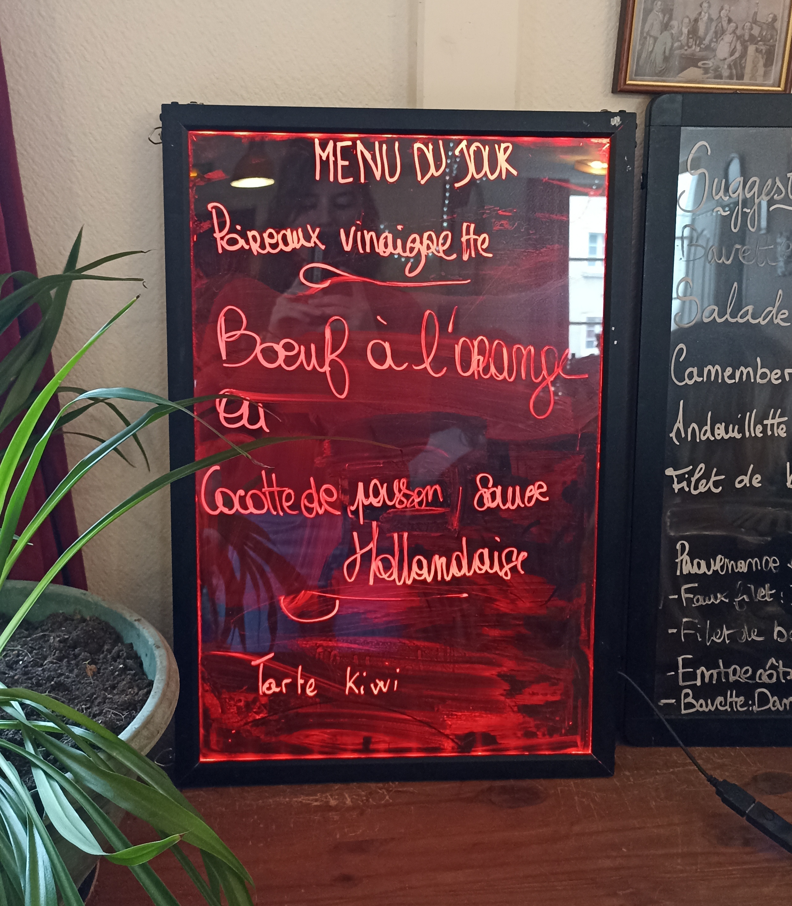 Des idées des idées, dans un sympathique fouillis elles fourmillent. Pareil pour la cuisine : des produits recherchés ( exemple ce vin très réussi voir photo) je conseille l’andouillette : elle est parfaite. Les frites maison et manuelles aussi. Ambiance jeune et décontractée.